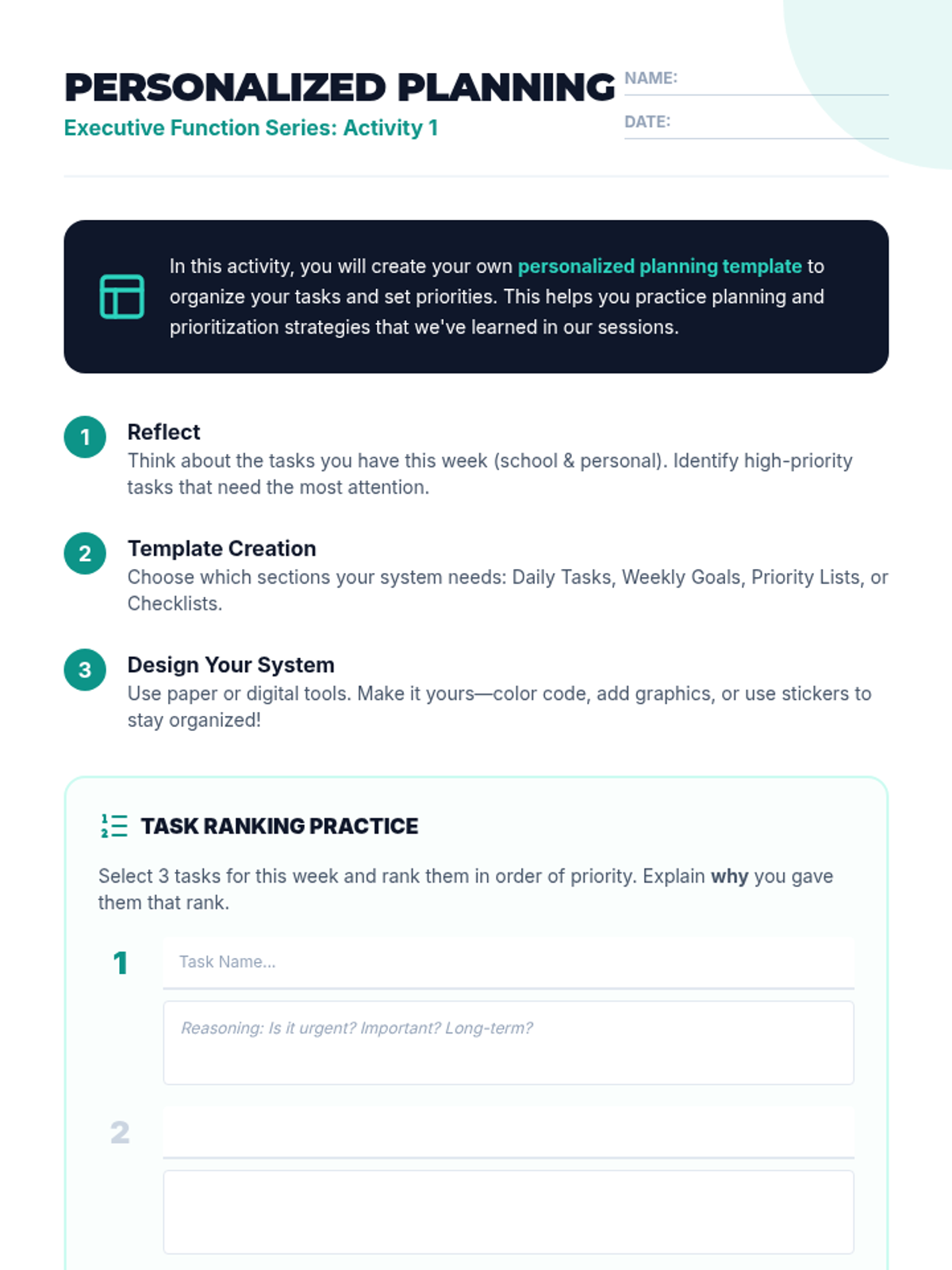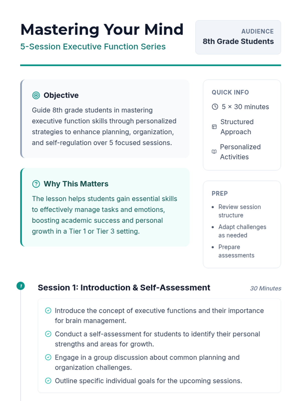 A 5-session lesson series for 8th graders to develop executive function skills including planning, organization, and self-regulation.
