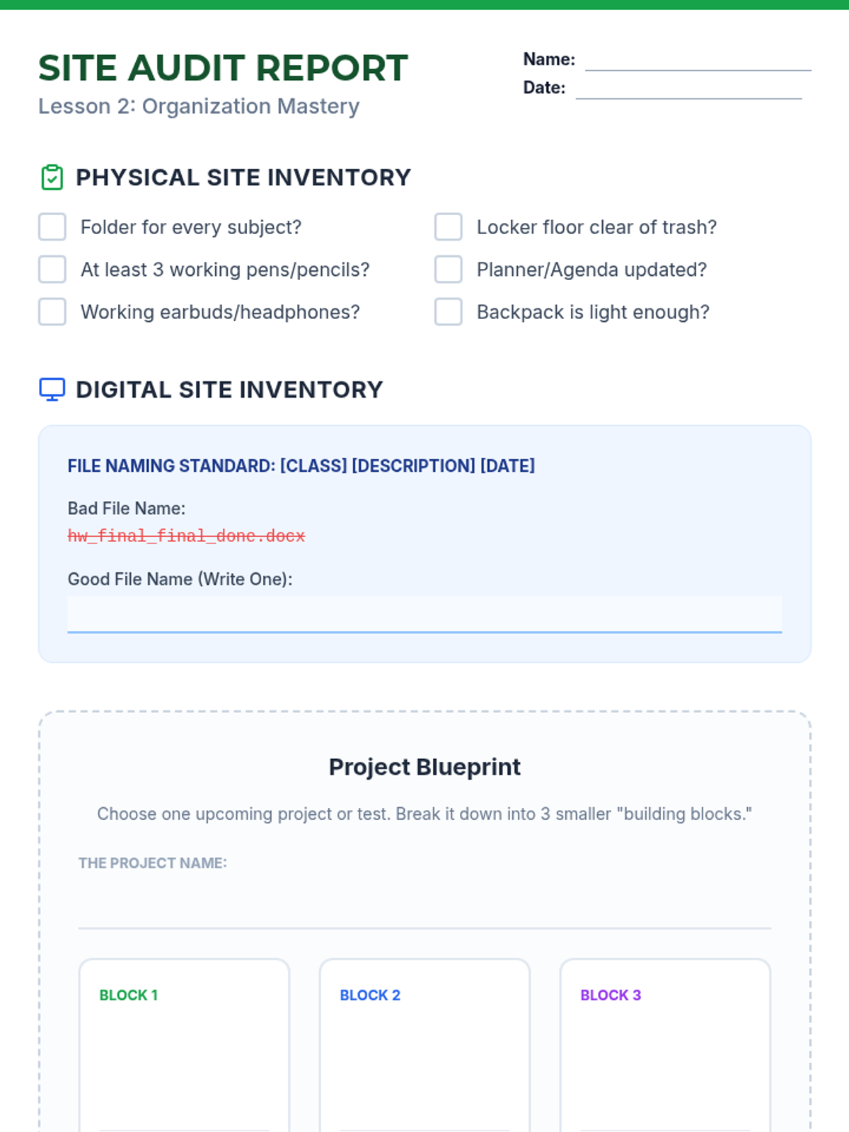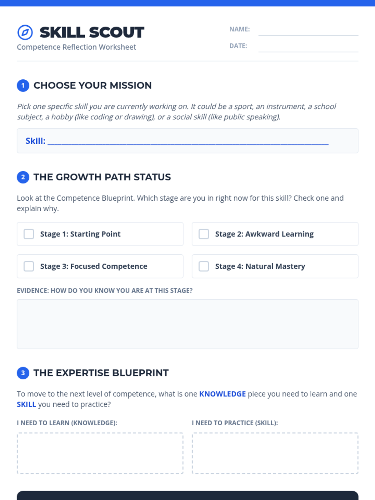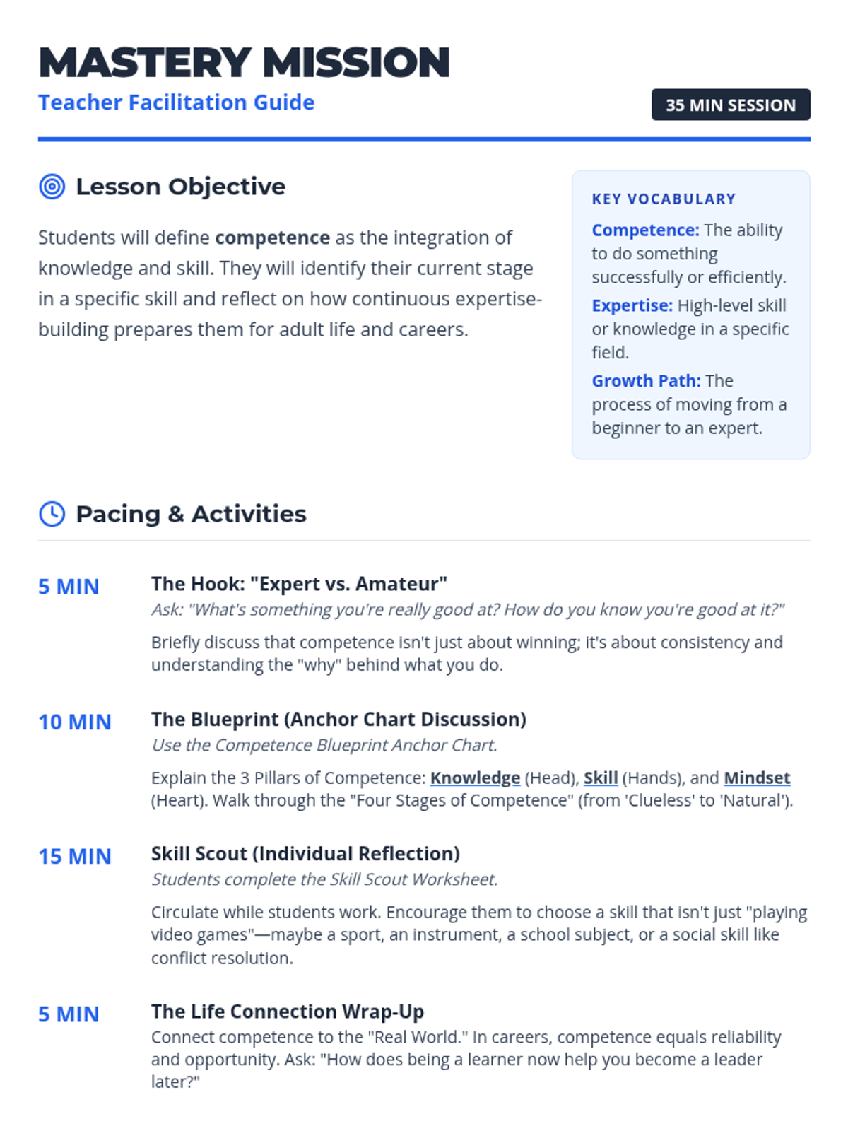 A 30-35 minute lesson for middle schoolers to define competence, track their progress in skill-building, and understand how continuous learning prepares them for future success.