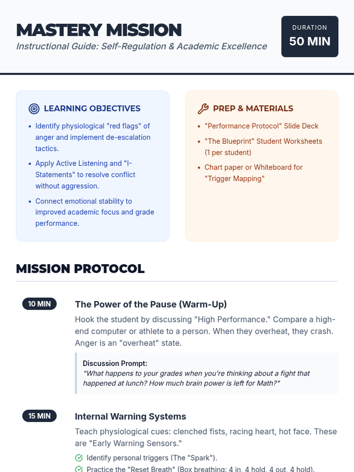 A comprehensive lesson for middle school students focusing on the intersection of emotional self-regulation and academic success. This lesson provides practical tools for managing anger triggers, improving communication, and establishing effective study habits to boost performance.