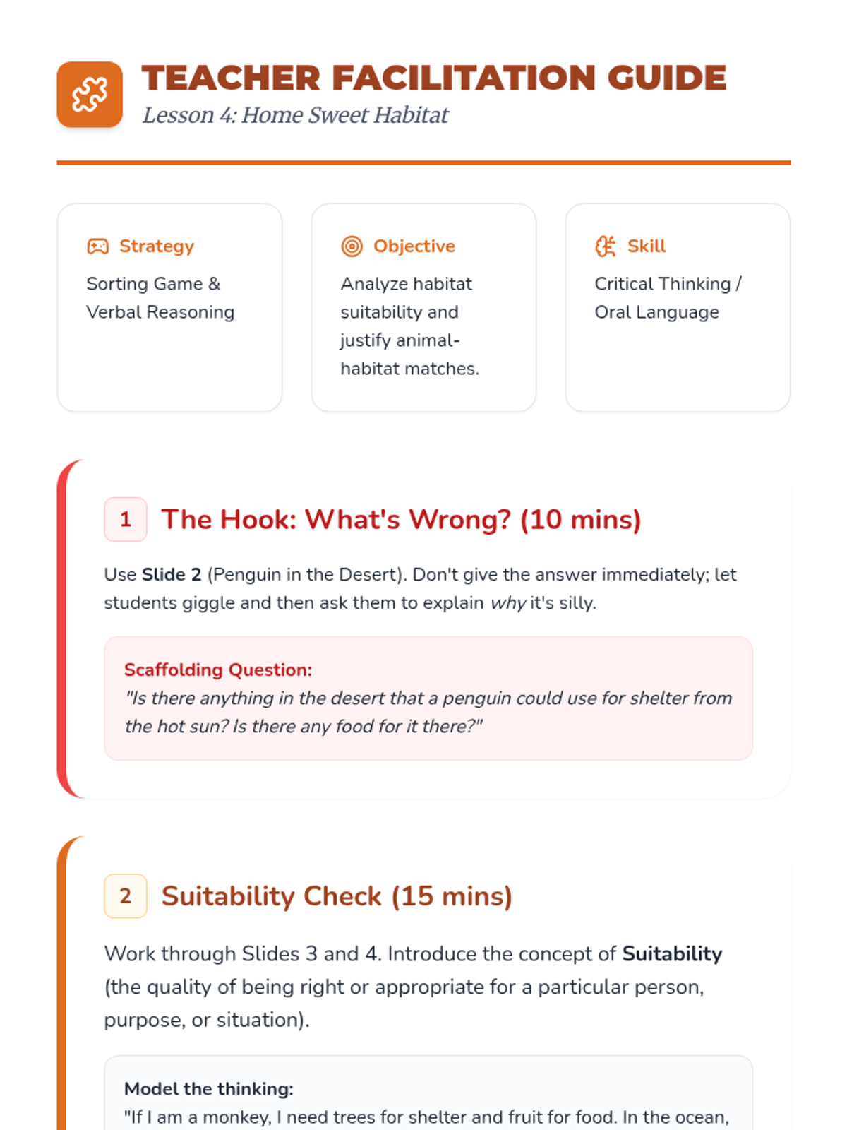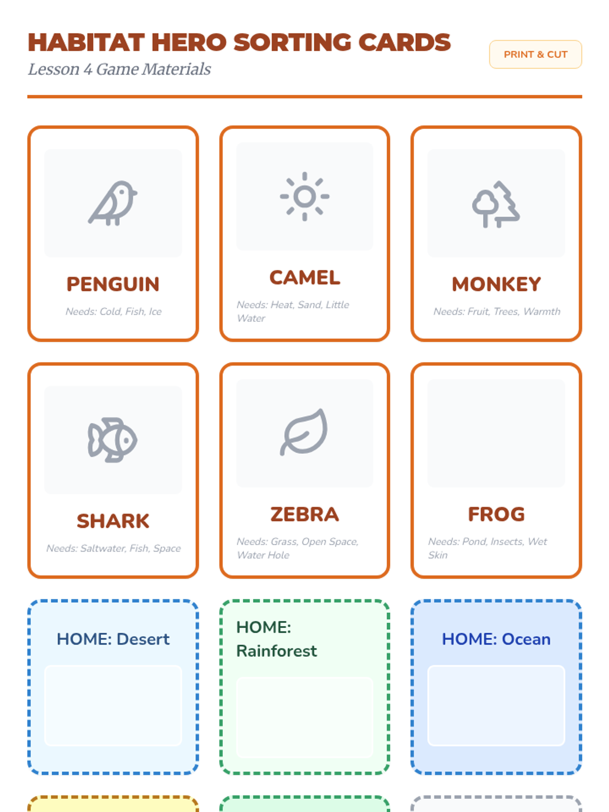 Through an interactive sorting game, students apply their knowledge to match animals to their correct biomes and explain why specific environments are suitable or unsuitable.