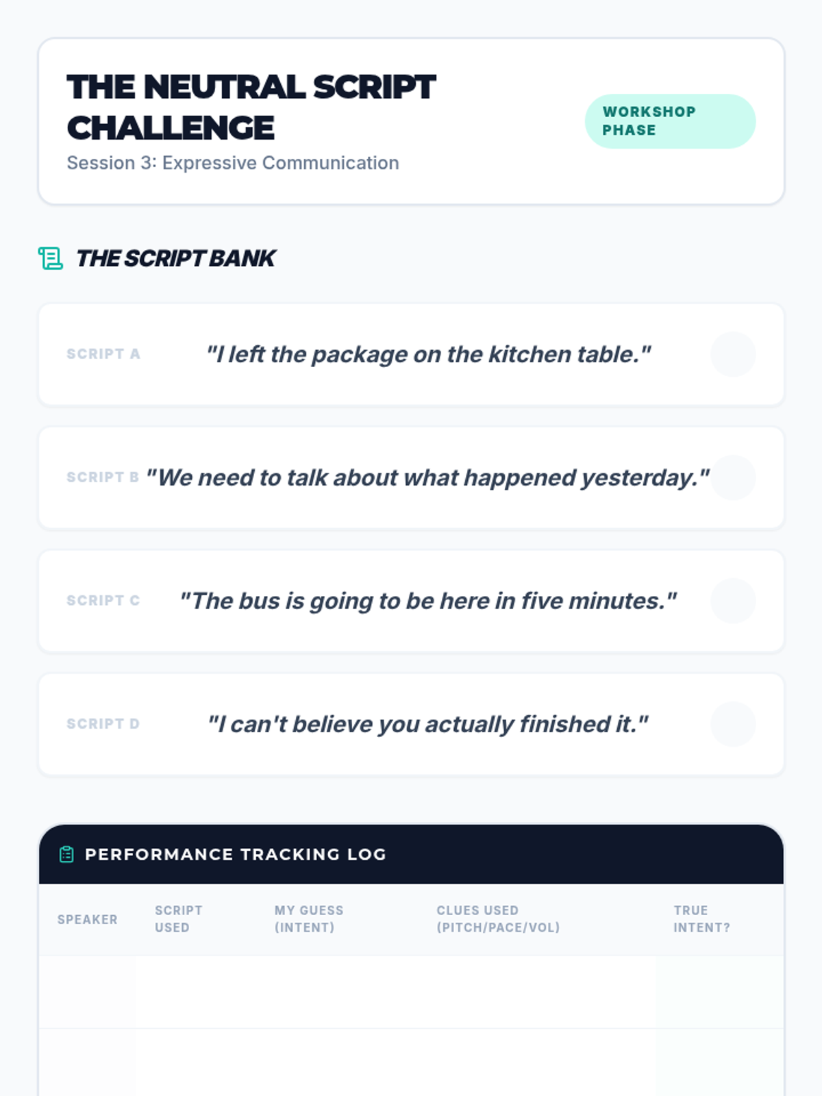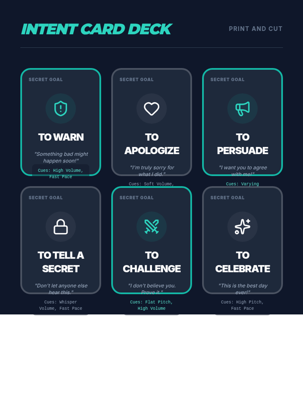 Students are given neutral scripts and secret 'intent cards' (e.g., to persuade, to apologize, to warn). They perform the scripts, and peers must guess the intent based on vocal delivery.