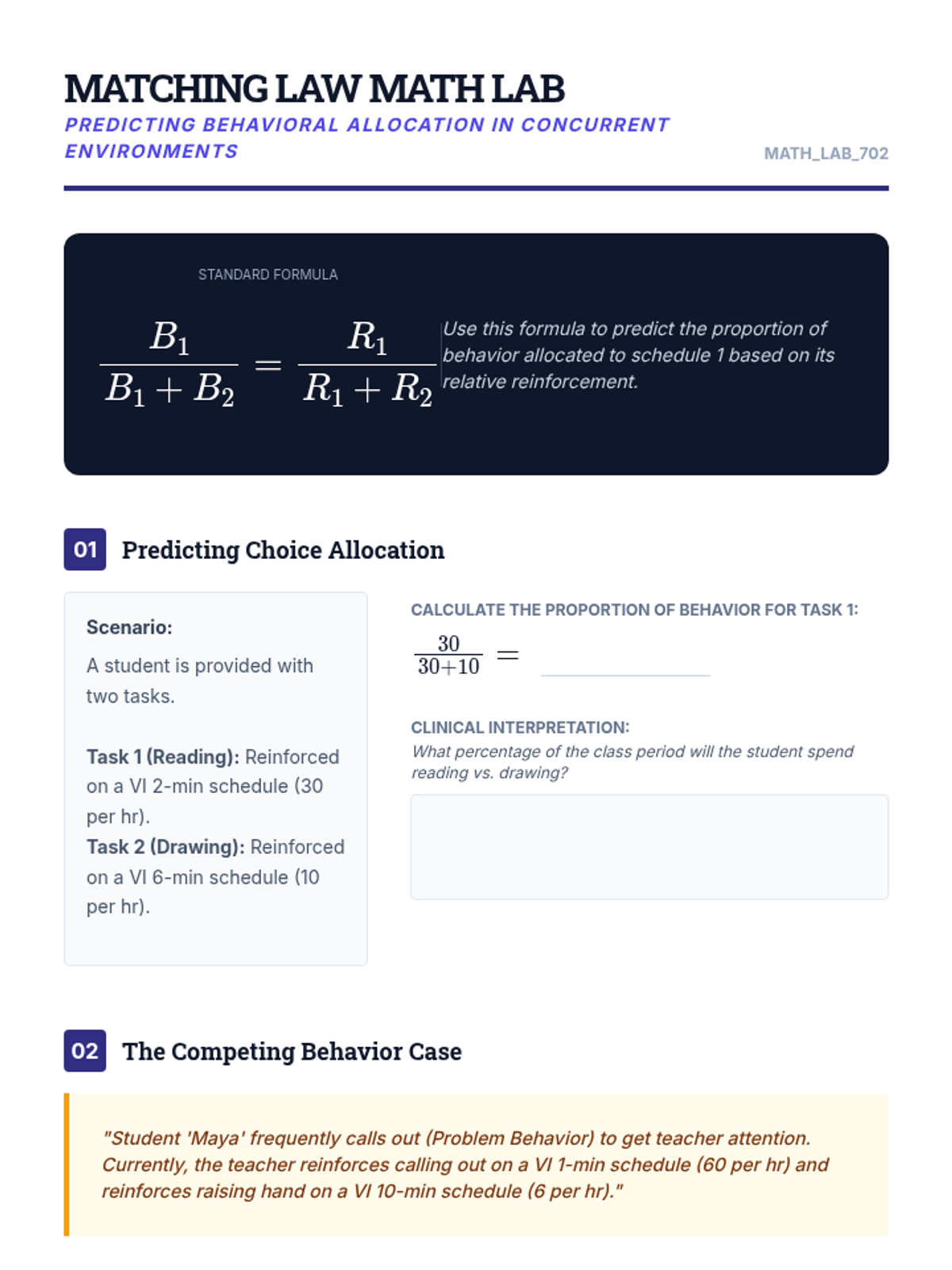 Apply Herrnstein’s Matching Law to predict behavior allocation in concurrent reinforcement schedules and multi-choice environments.