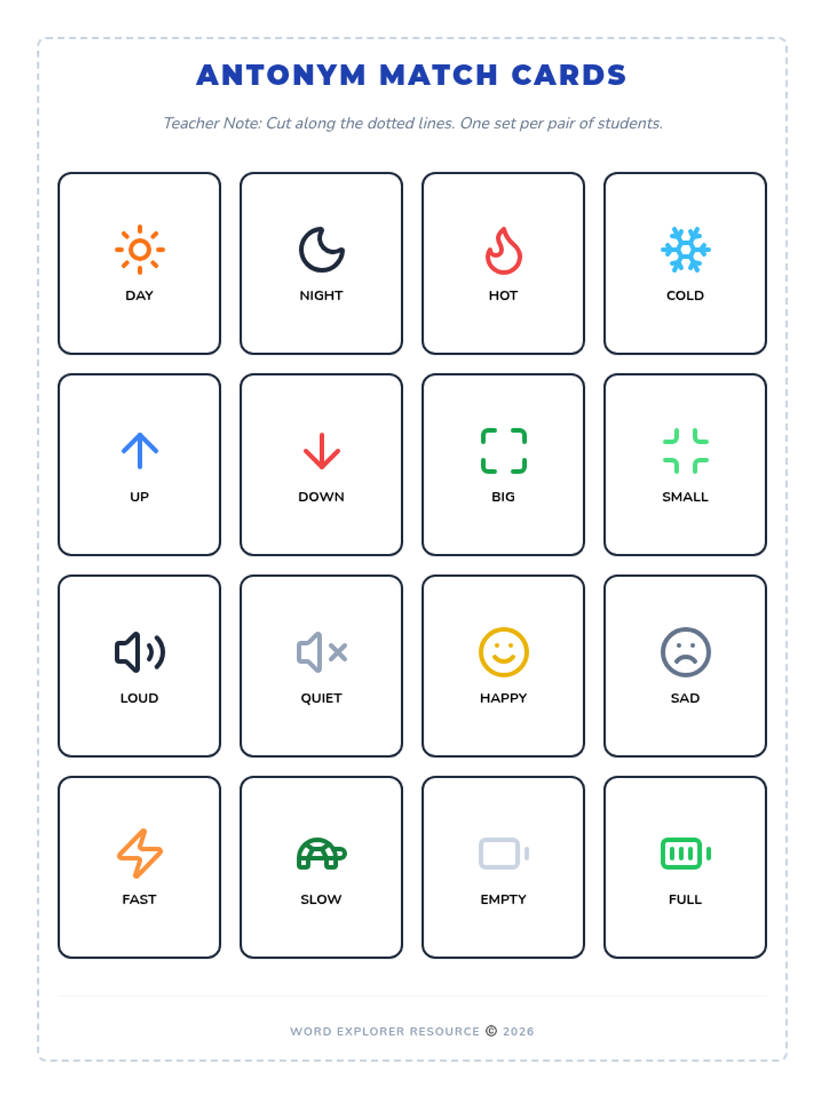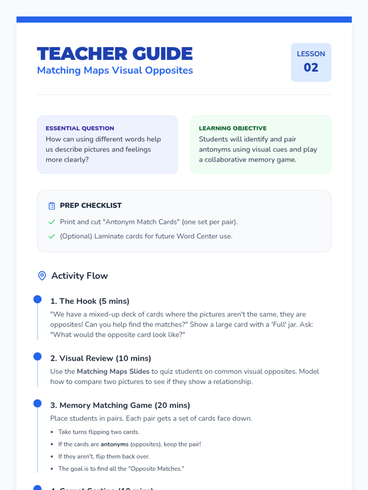 Students move from physical actions to visual recognition by matching pairs of antonym picture cards, reinforcing their understanding of opposite concepts through collaborative play.