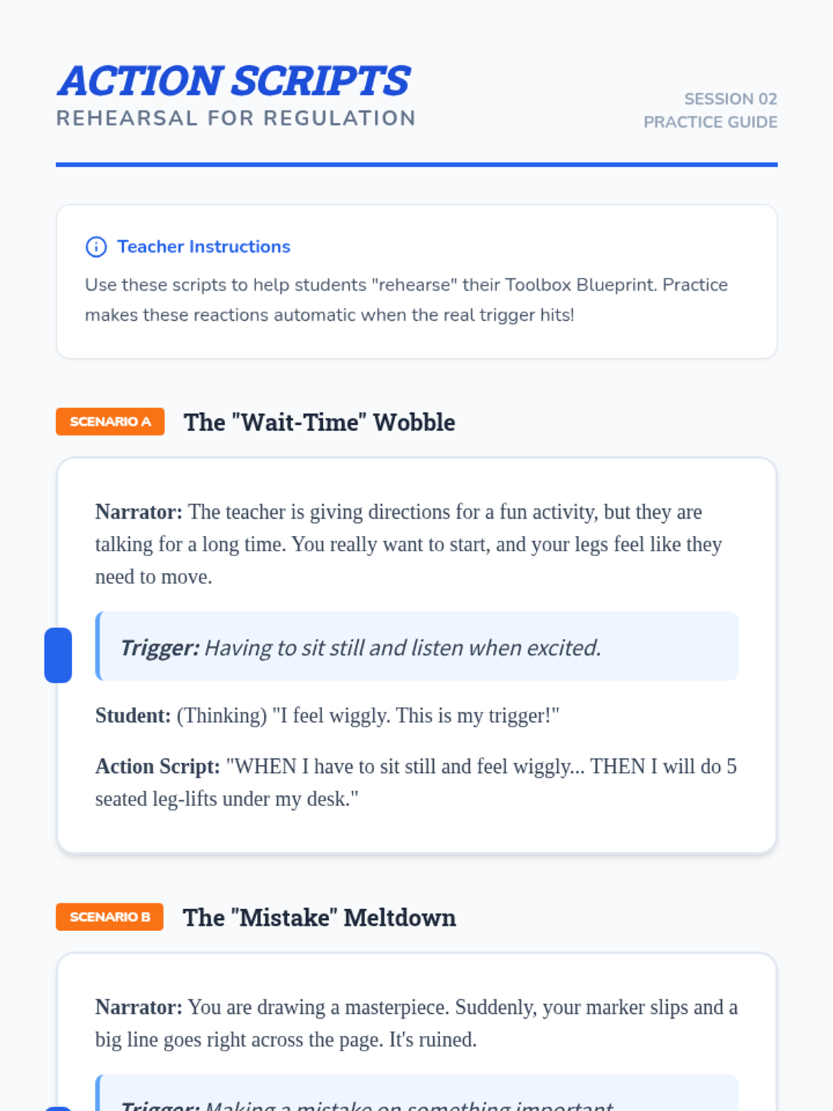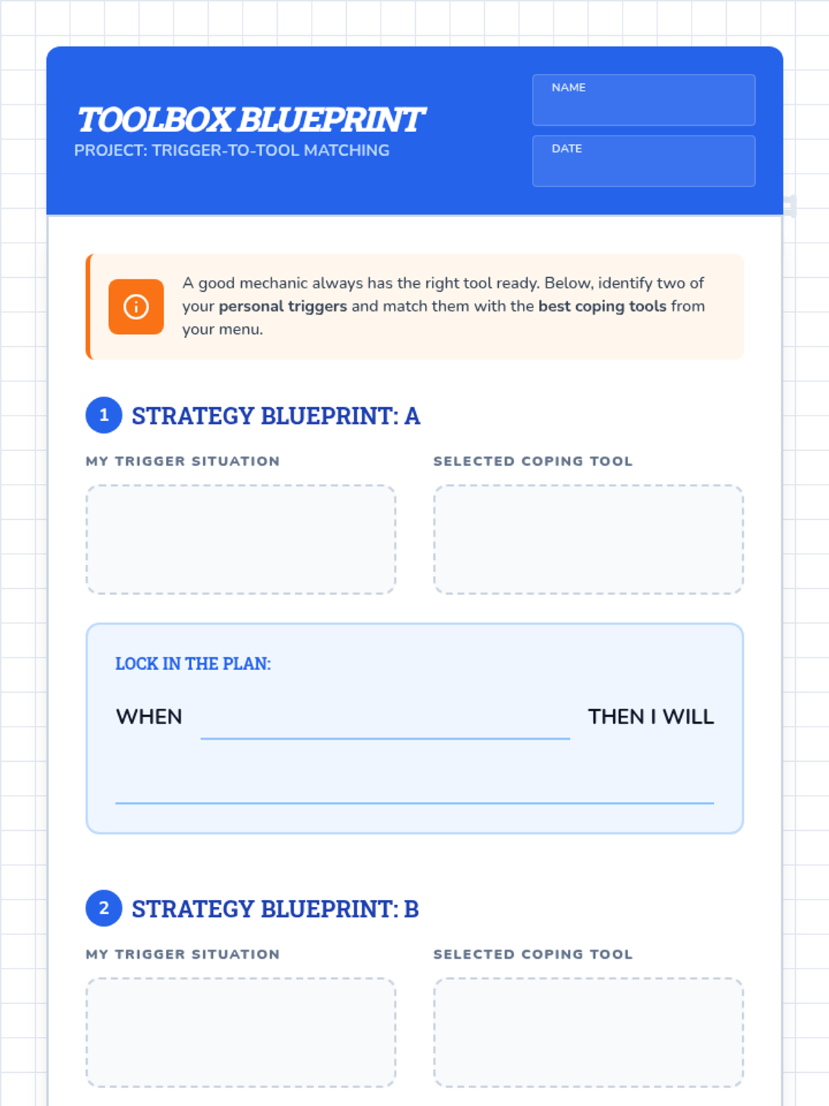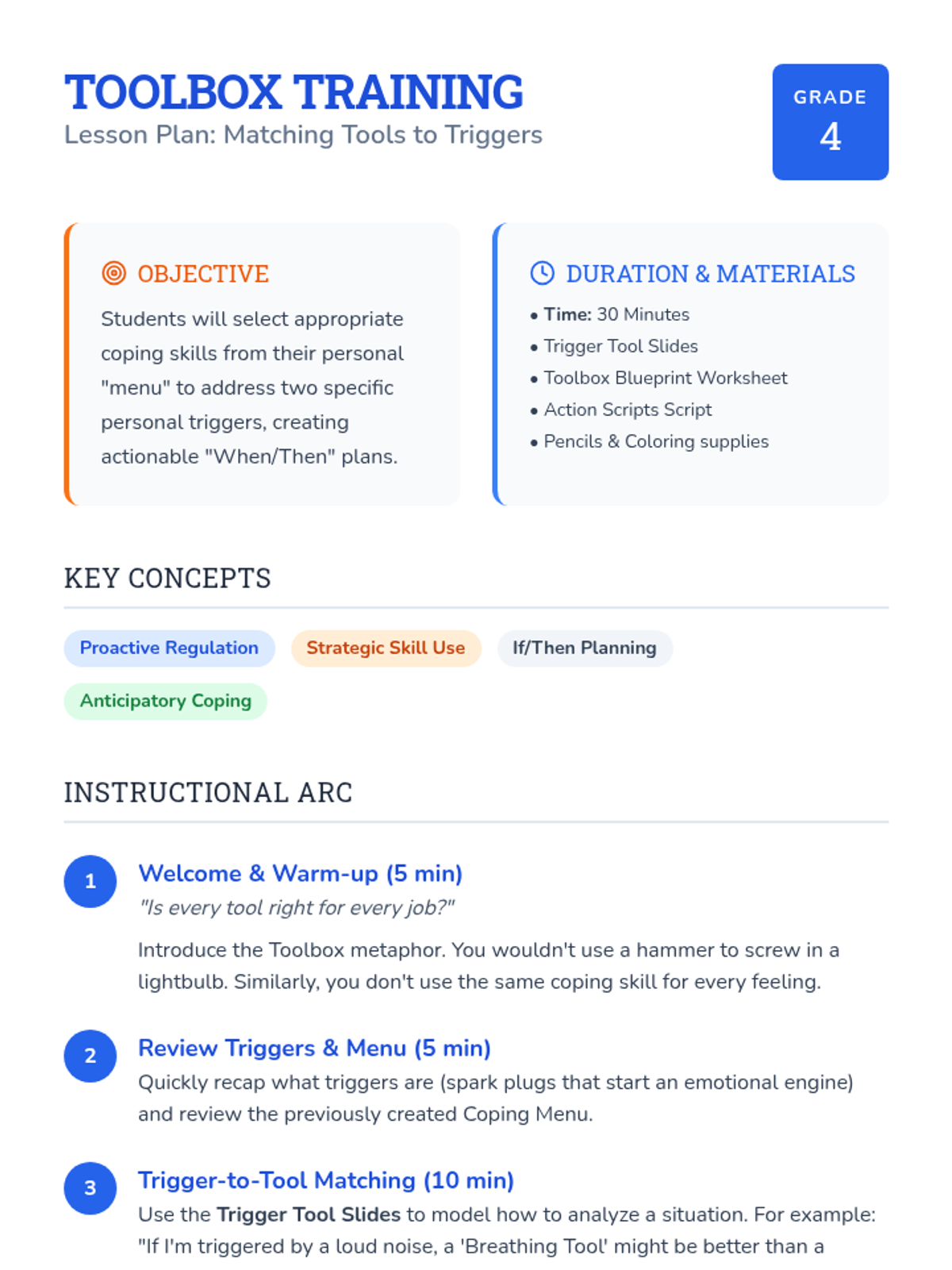 A lesson focused on helping students match specific personal triggers with effective coping strategies using an 'Emotional Toolbox' metaphor. Students develop personalized 'When/Then' plans for proactive self-regulation.