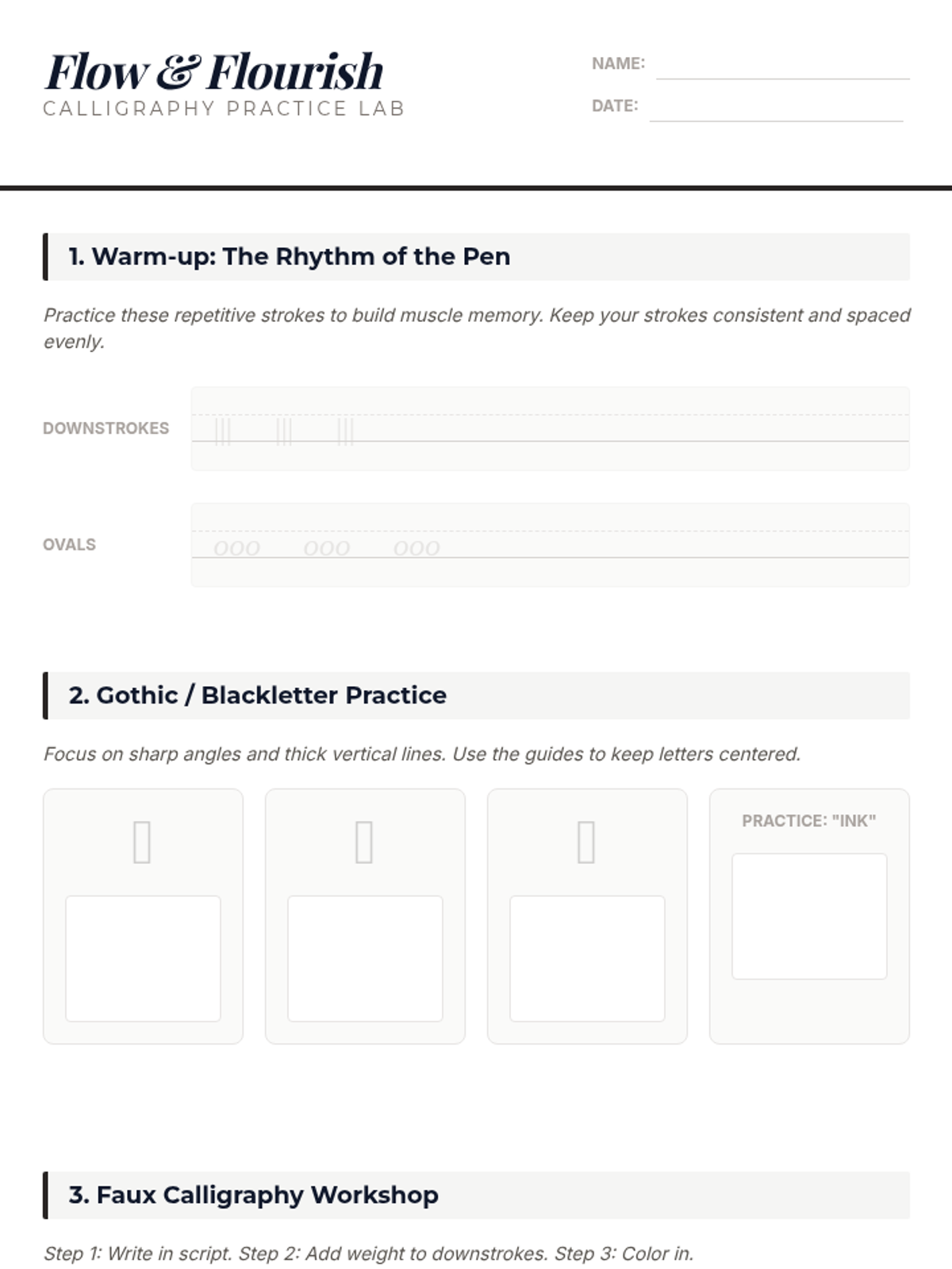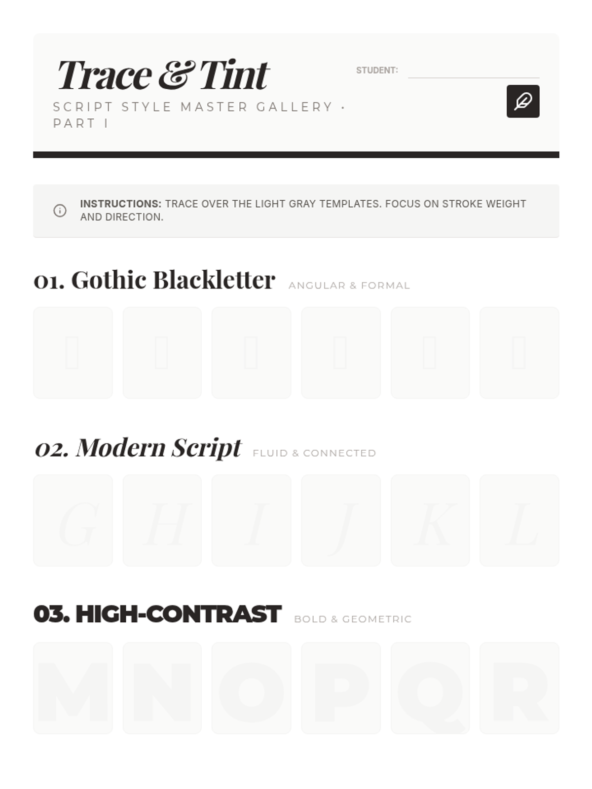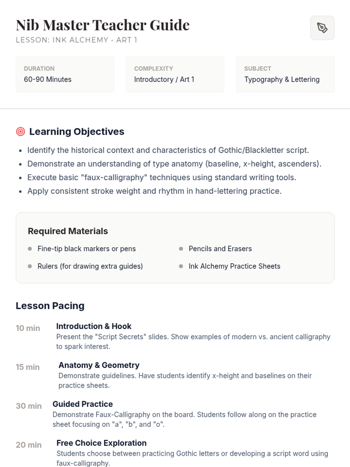 An introductory exploration into the world of calligraphy and lettering, focusing on the anatomy of type, Gothic/Blackletter styles, and the technique of 'faux-calligraphy' for Art 1 students.