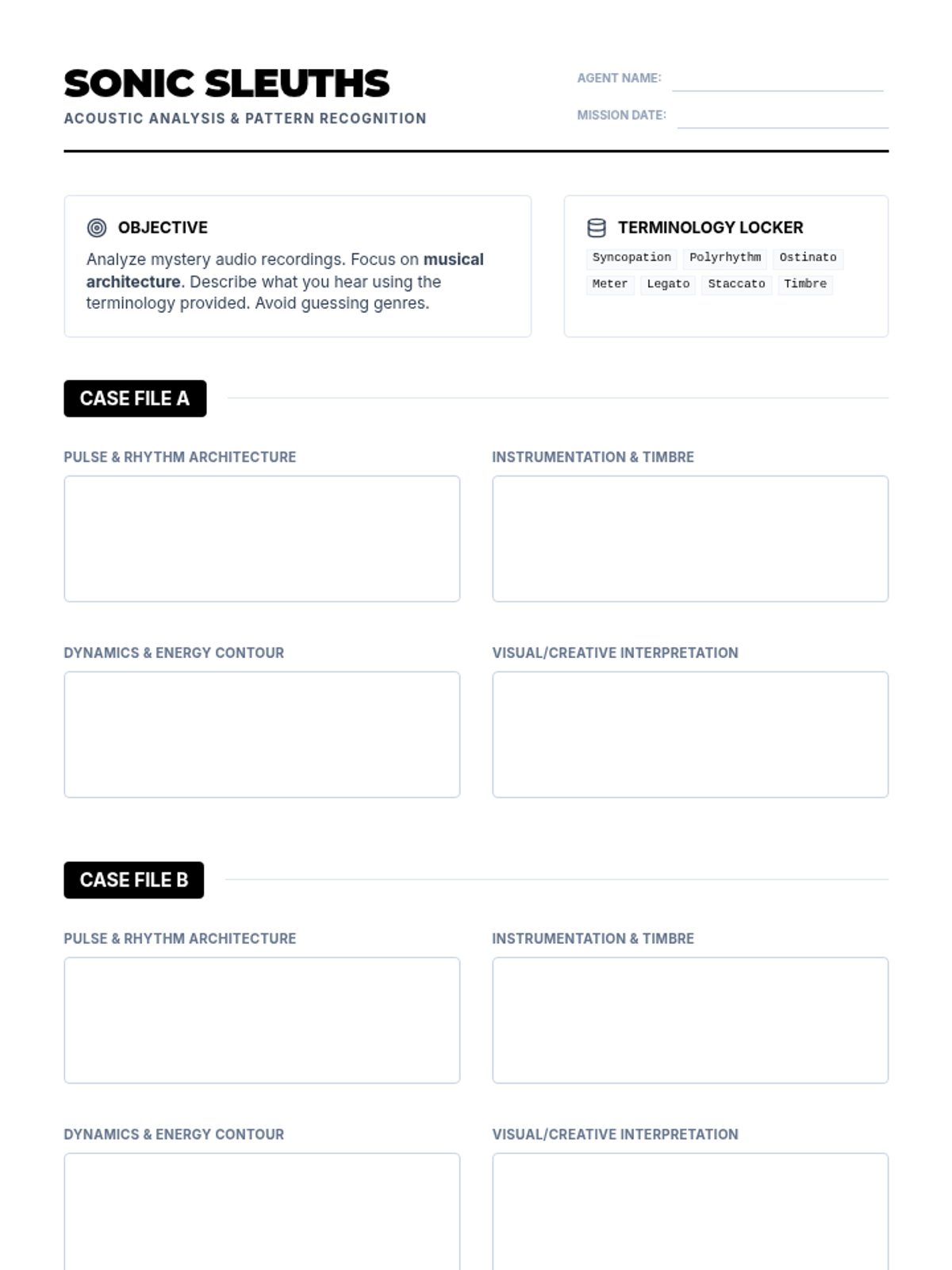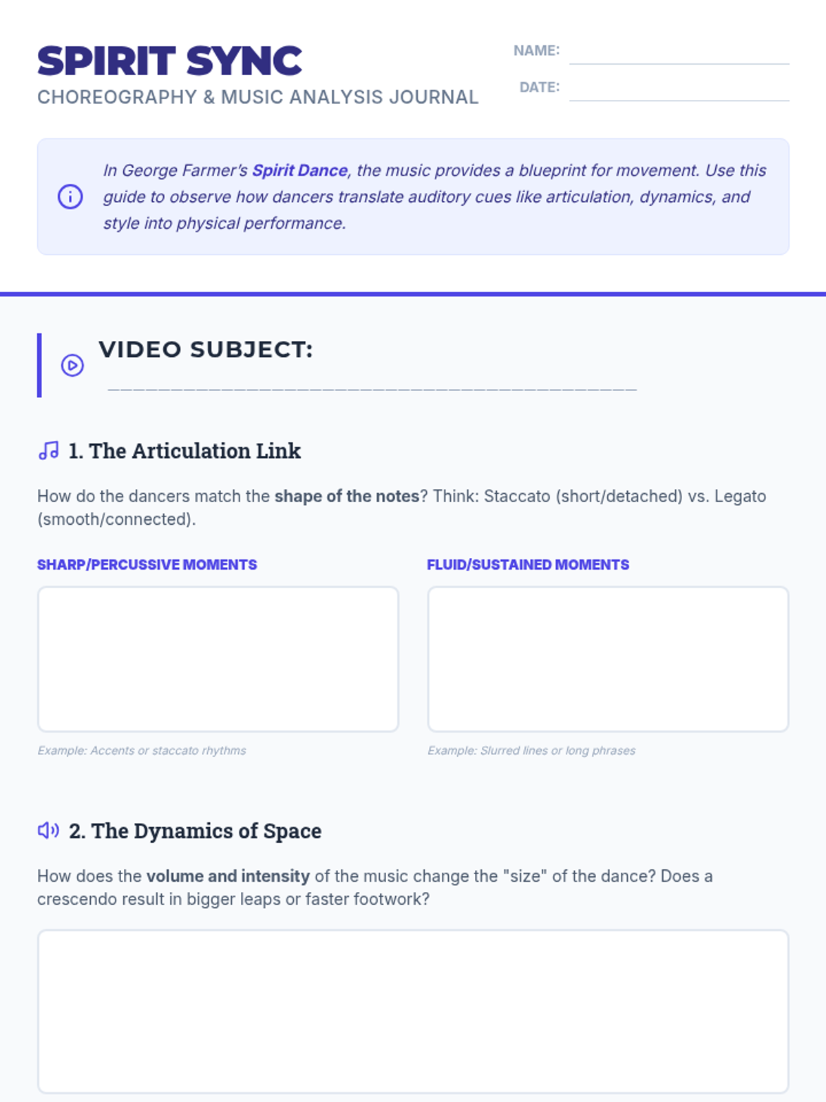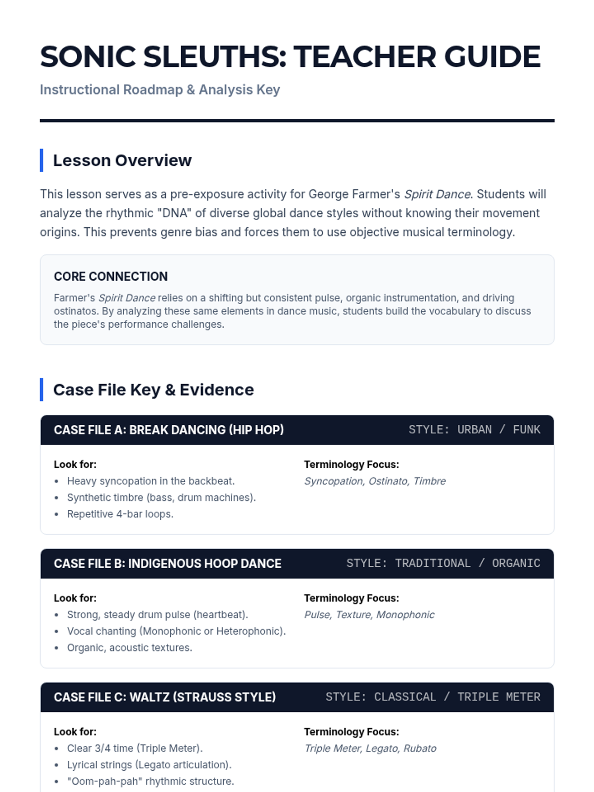 A listening-focused lesson where students analyze the musical characteristics of various dance styles without knowing their movement-based origins, building terminology skills before connecting to George Farmer's 'Spirit Dance'.