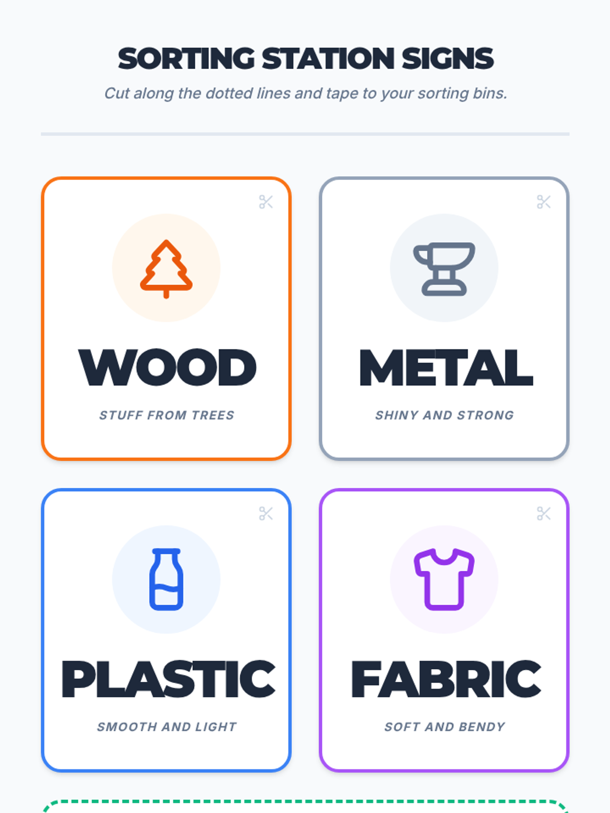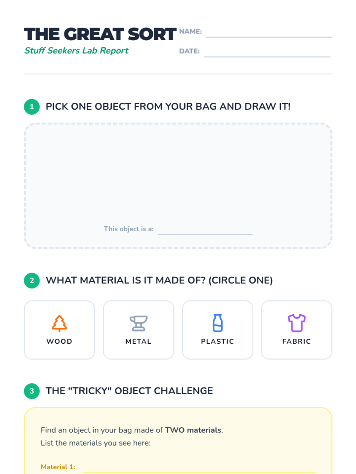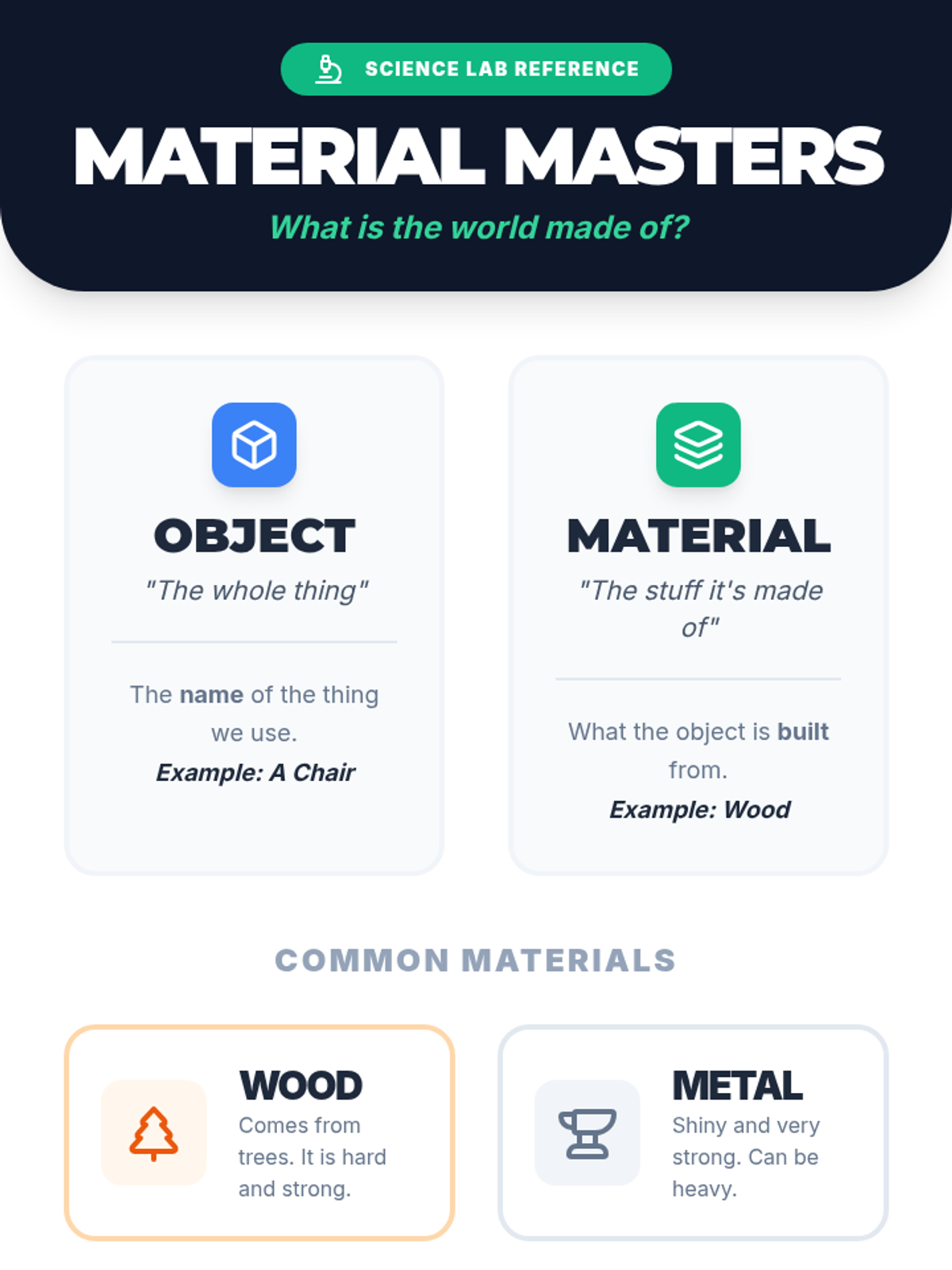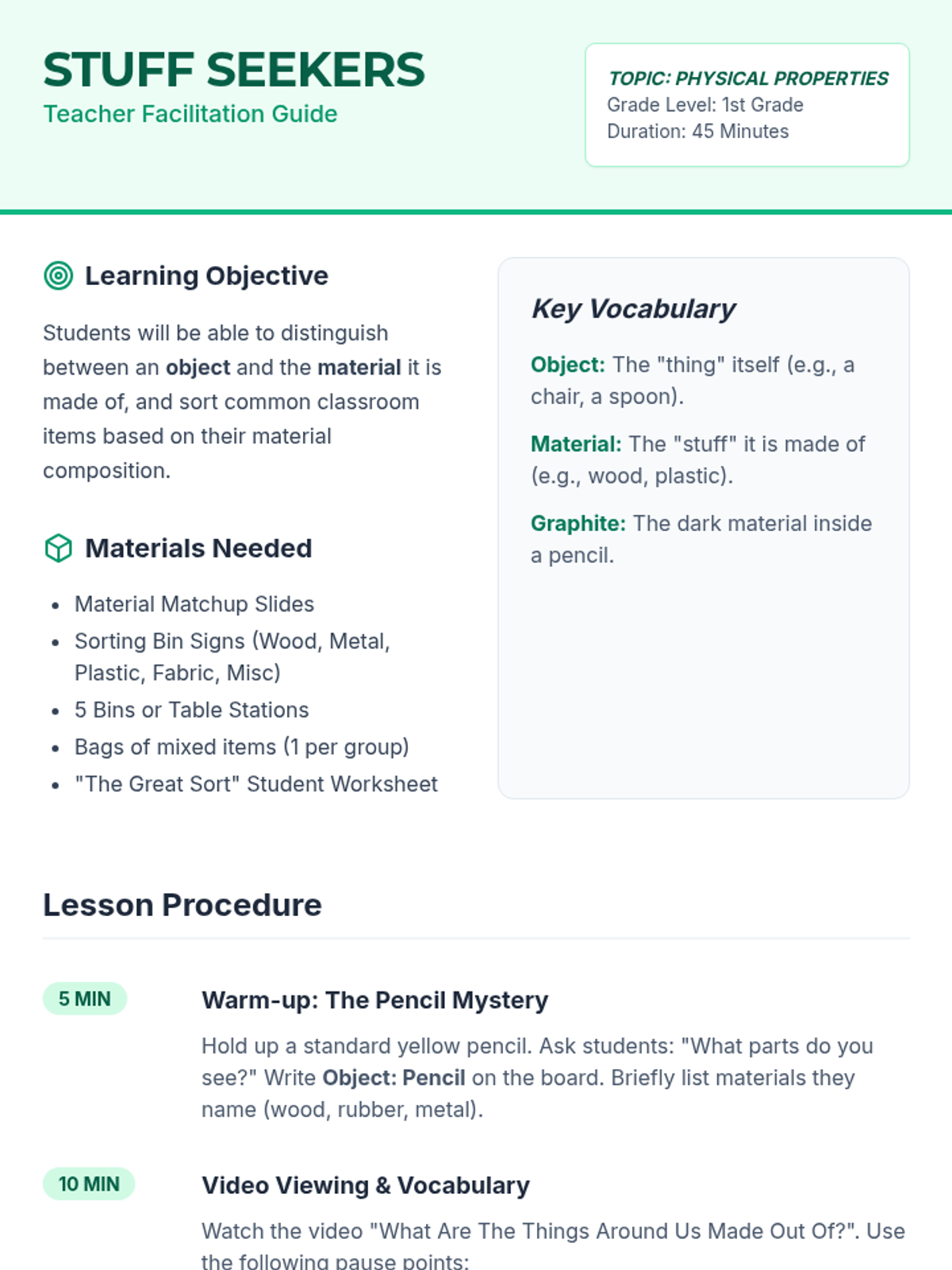 A hands-on physical science lesson for 1st graders to distinguish between objects and the materials they are made of through sorting and video analysis.