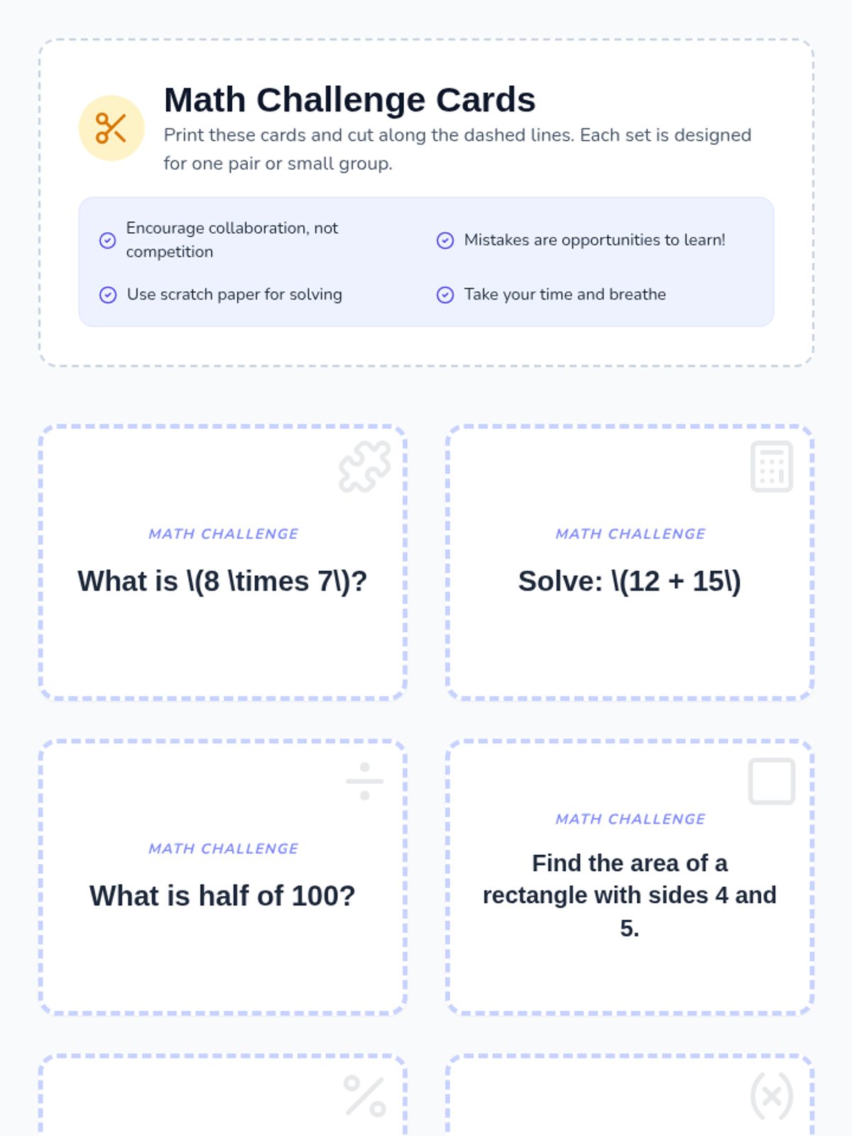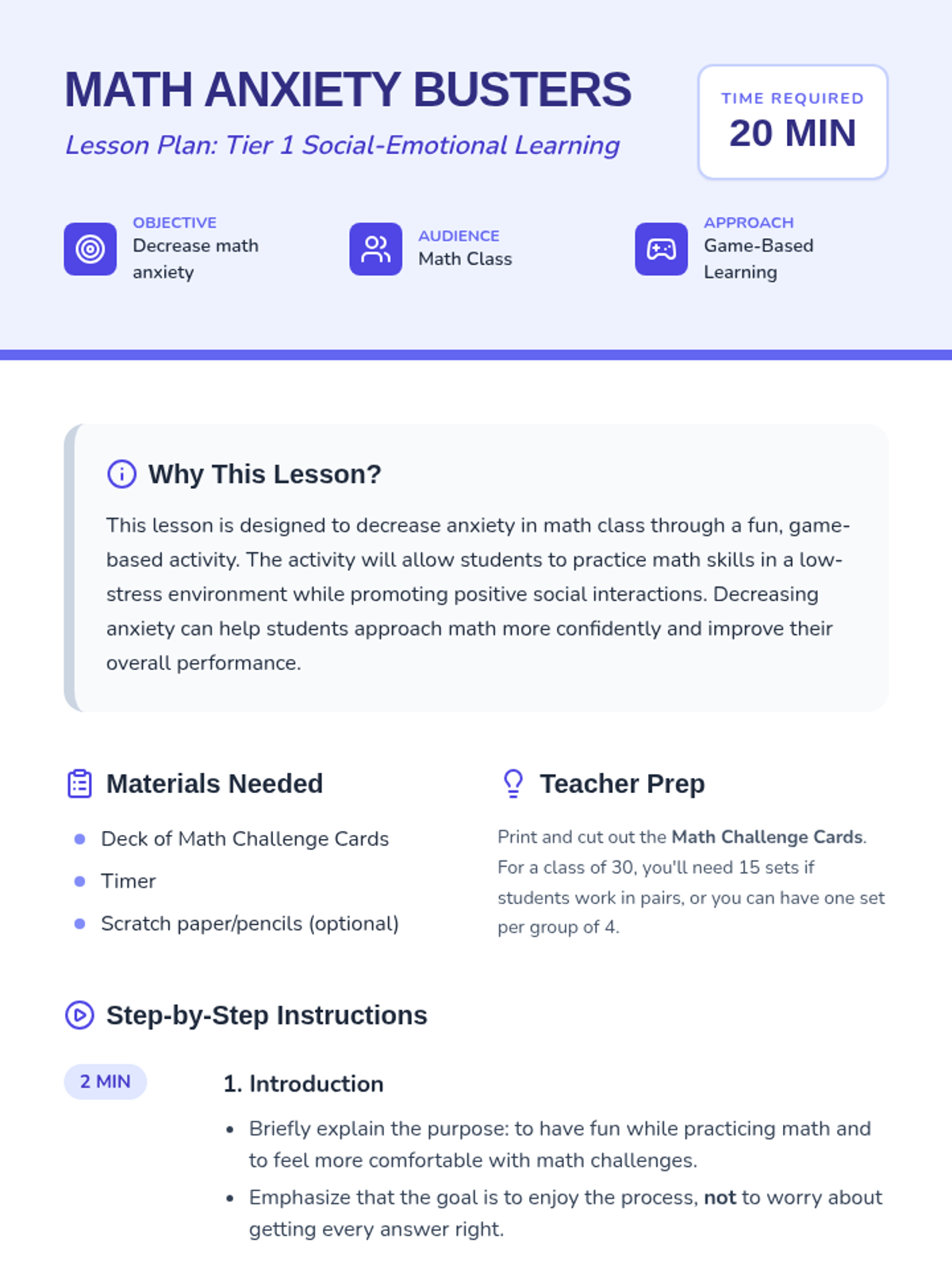 A game-based lesson designed to lower student math anxiety by creating a low-stakes, collaborative environment for practicing math skills.