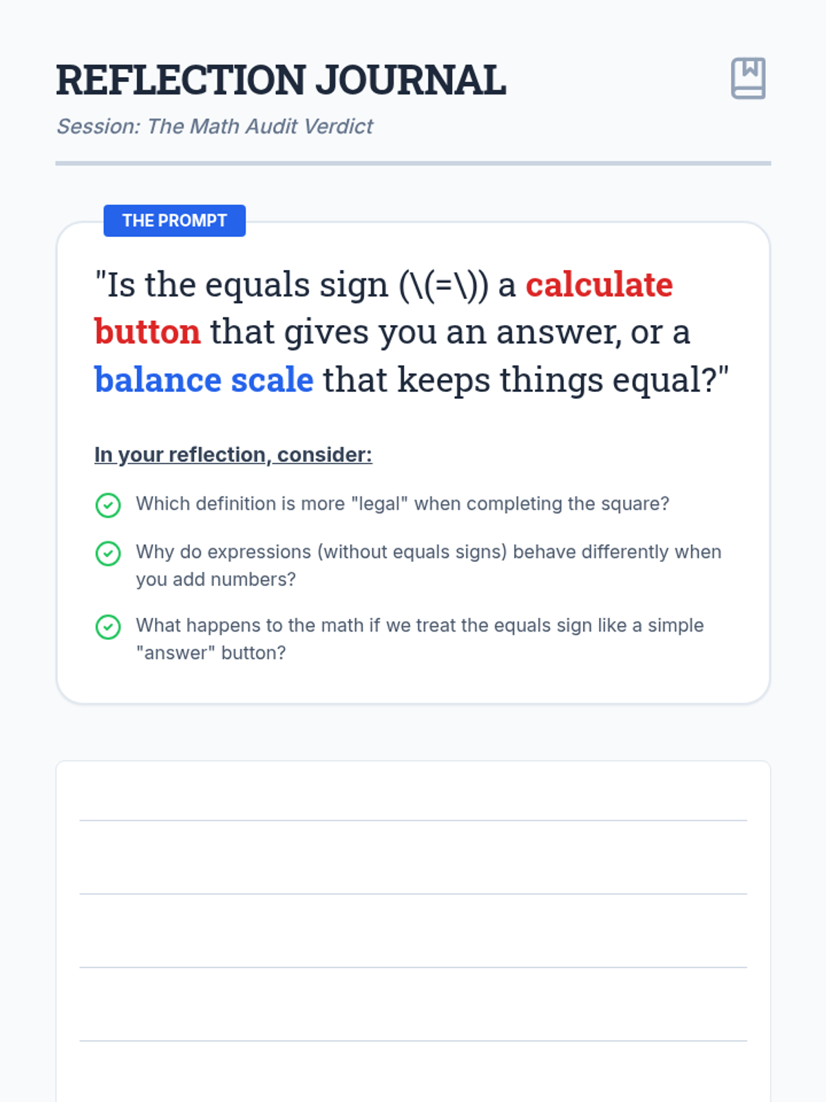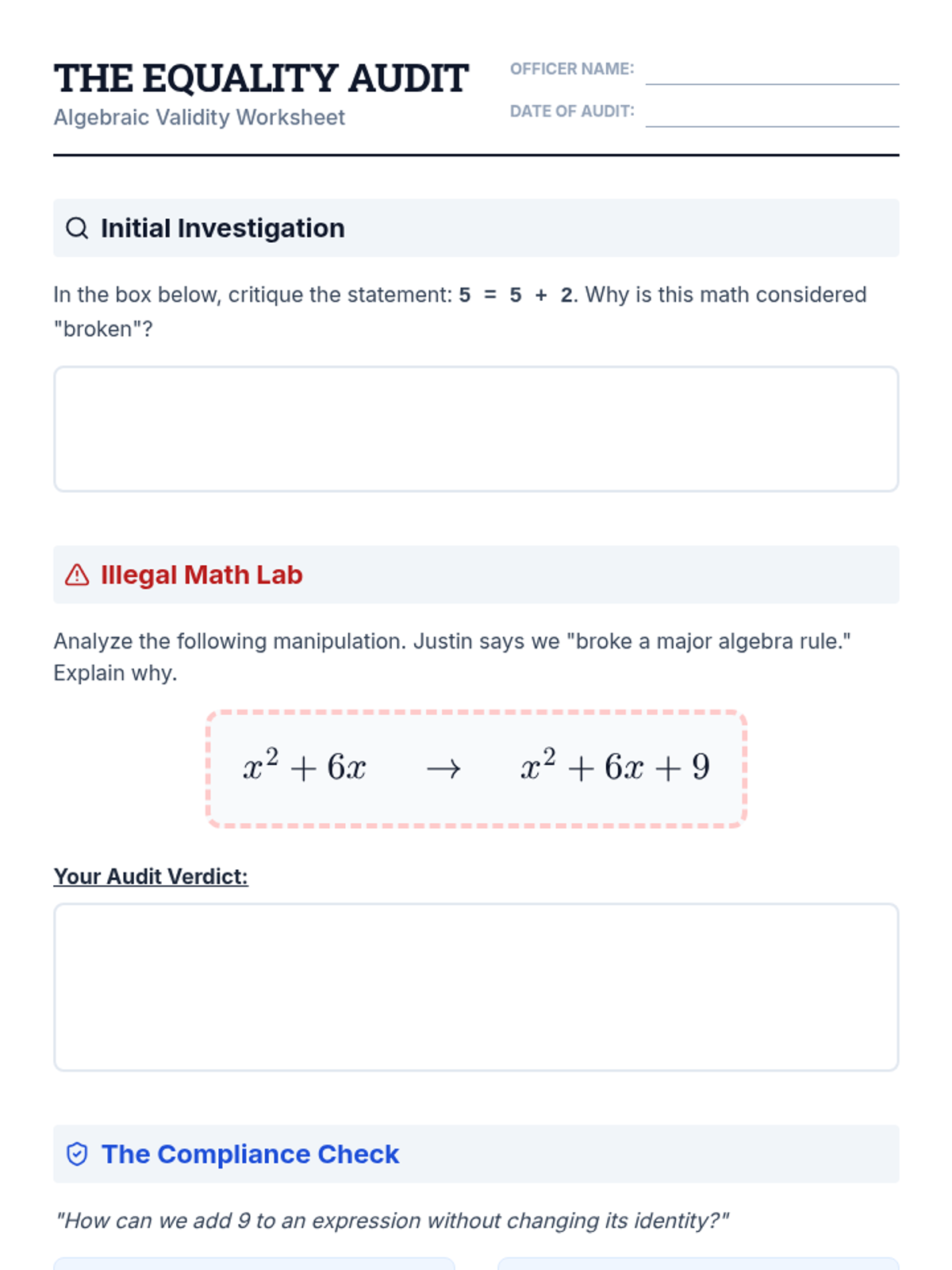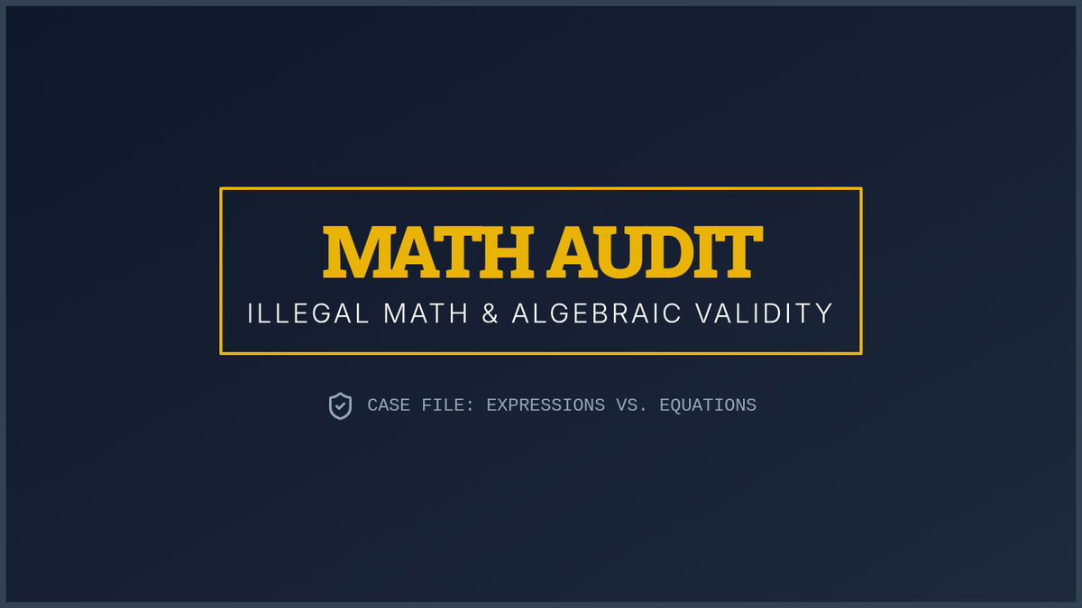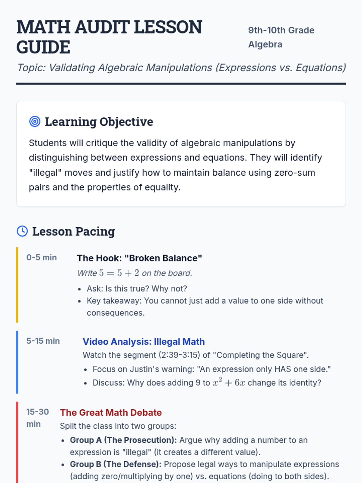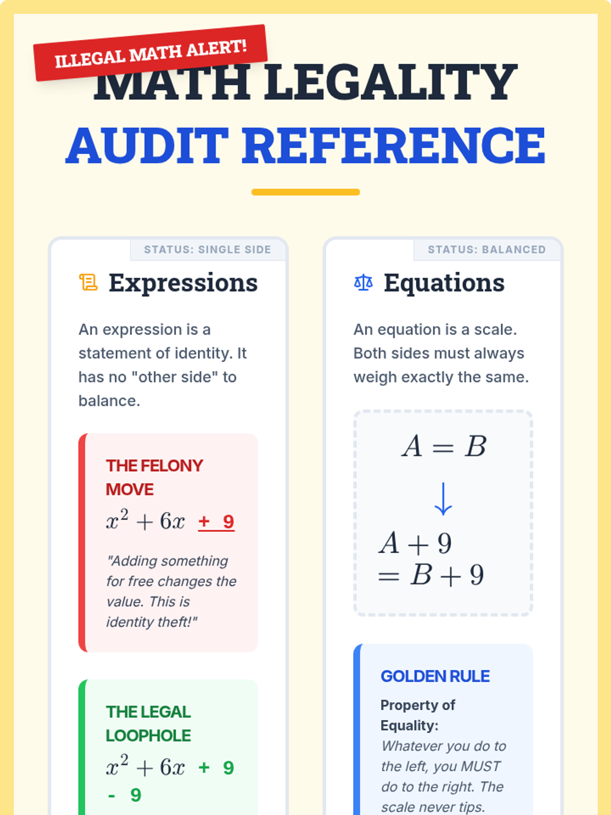 Students critique the validity of algebraic manipulations, distinguishing between expressions and equations using the 'Illegal Math' concept. They explore how to maintain algebraic balance through zero-sum pairs and equality properties.