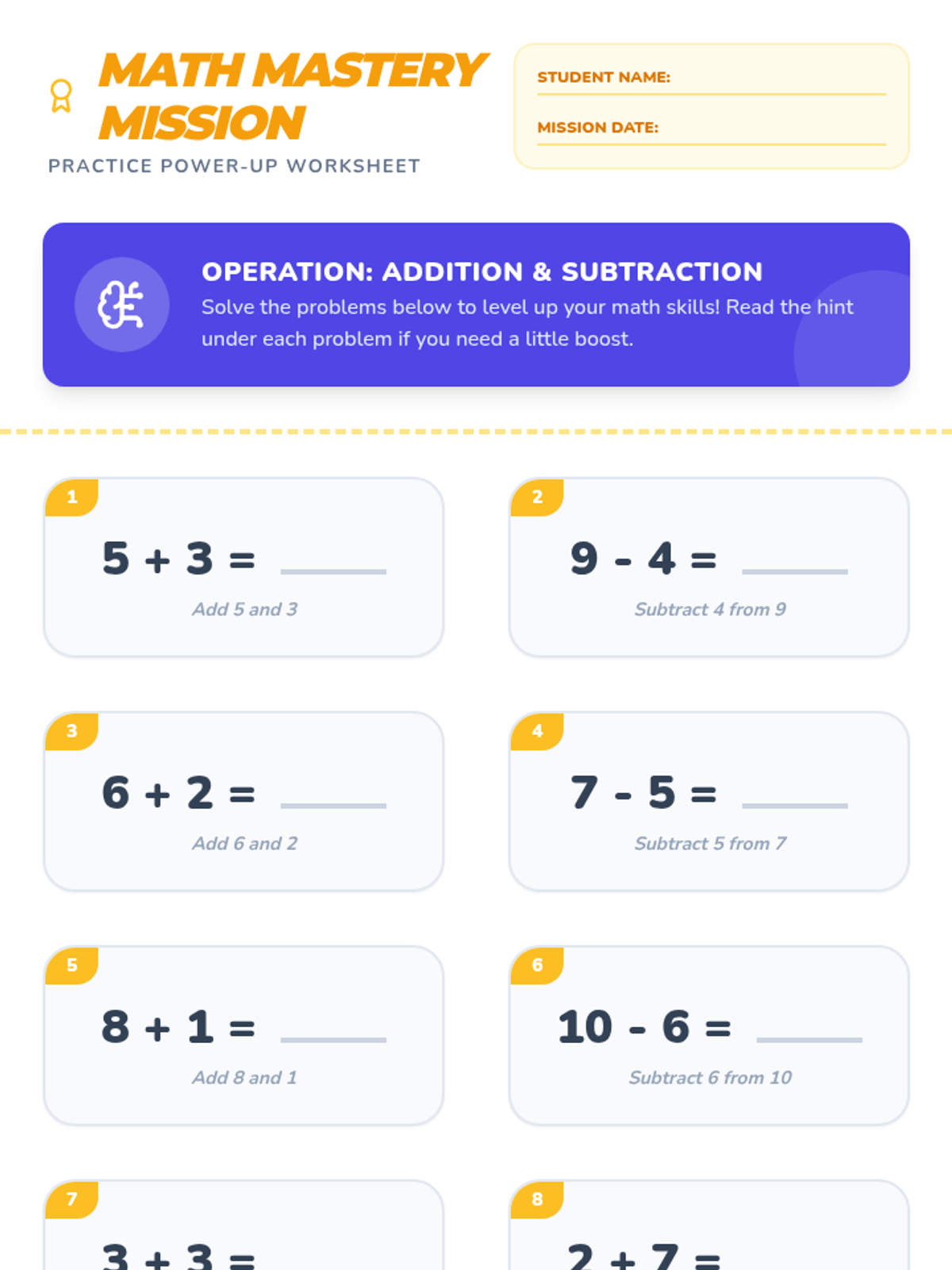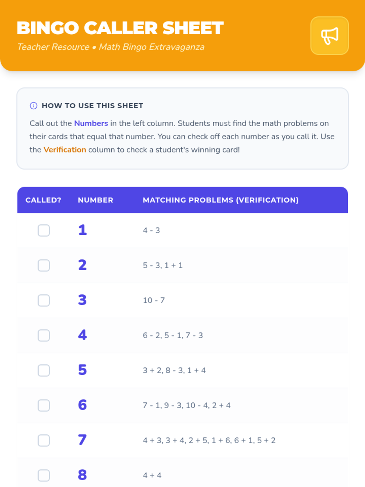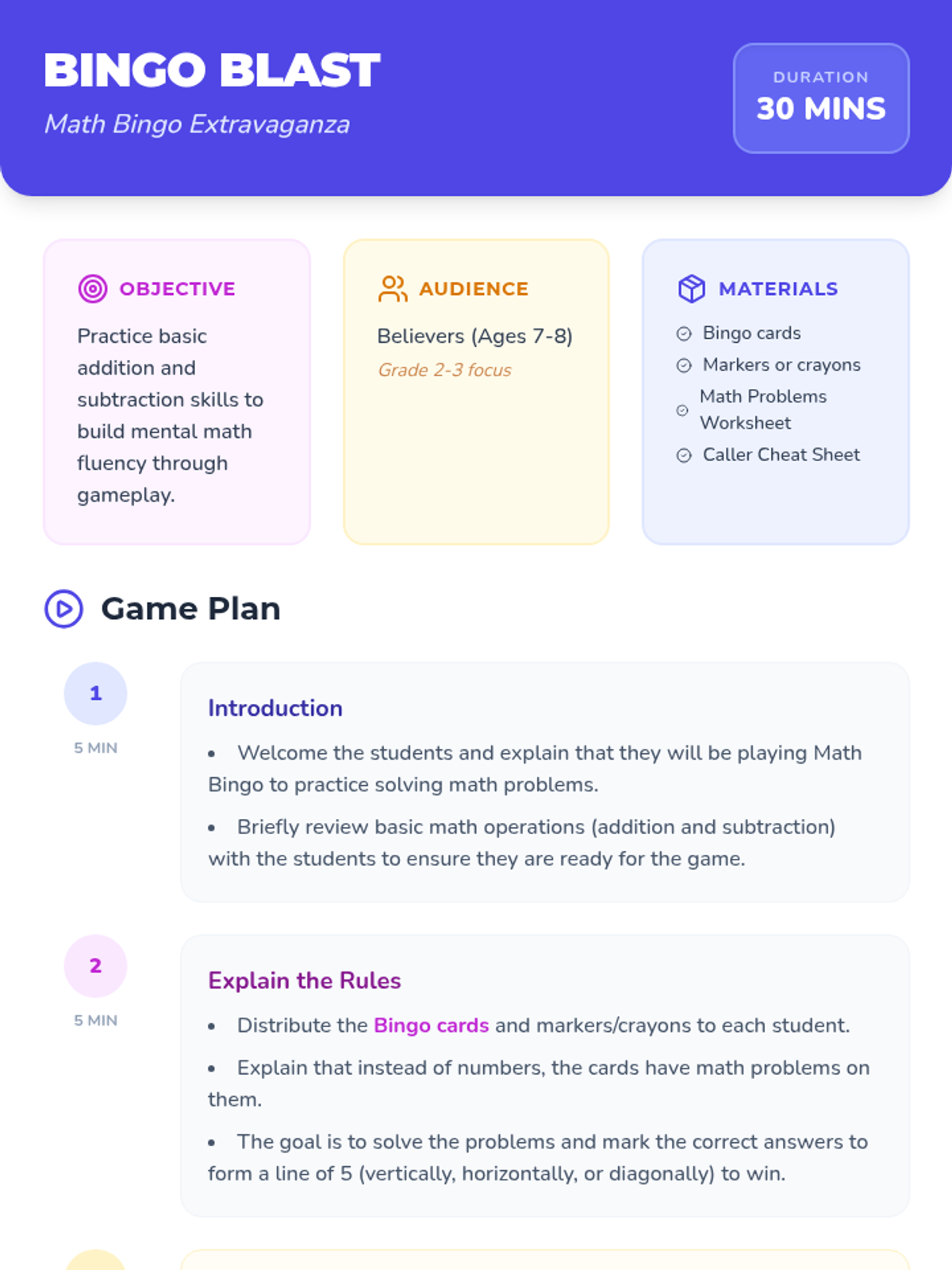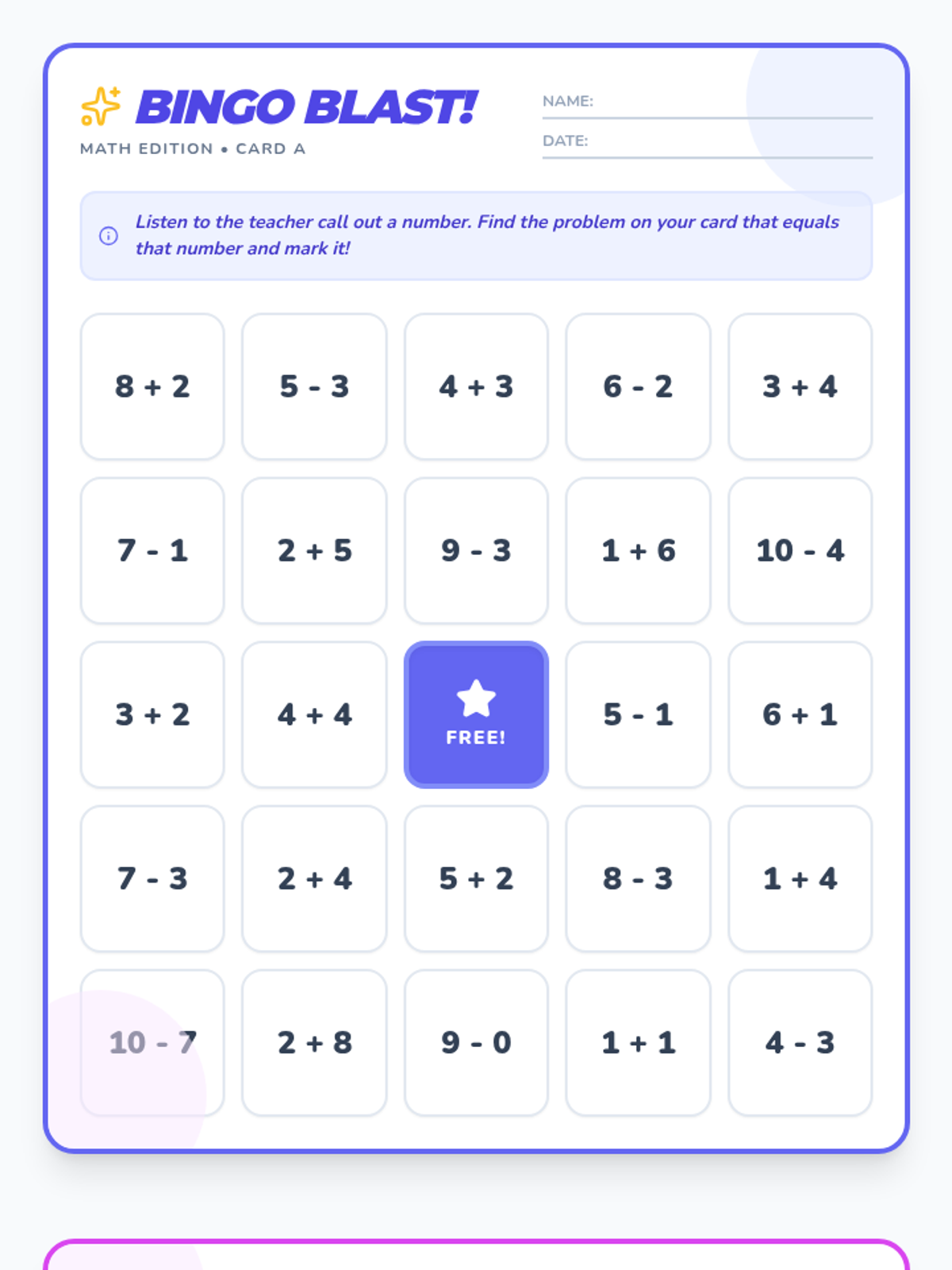 A fun and interactive lesson where students practice addition and subtraction by playing Bingo with math problems. This lesson helps students build fluency with basic operations in a gamified environment.