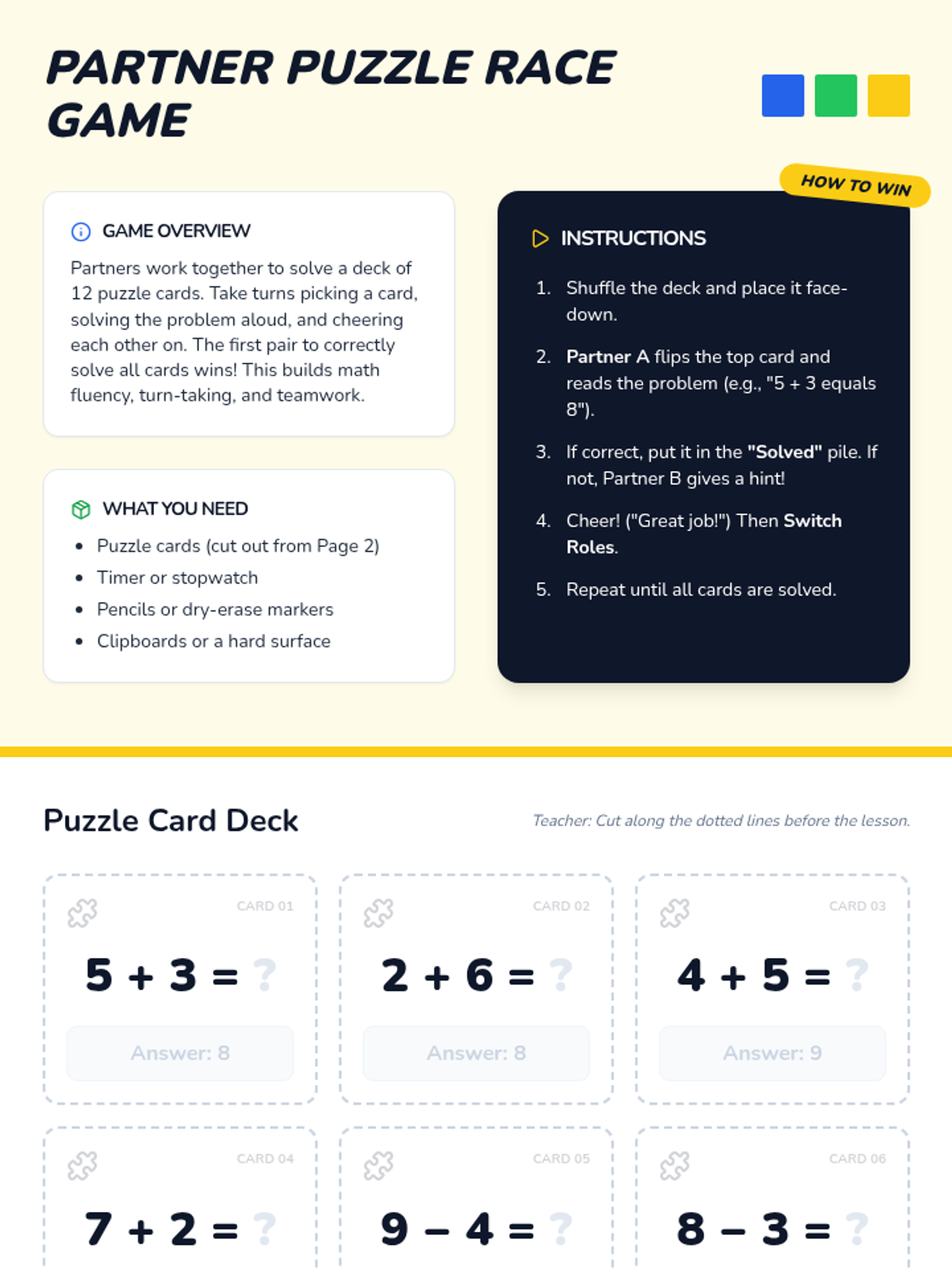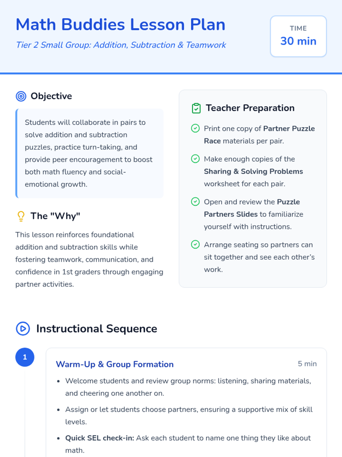 A small-group lesson for 1st graders that blends foundational addition and subtraction practice with social-emotional learning through collaborative games and partner work.