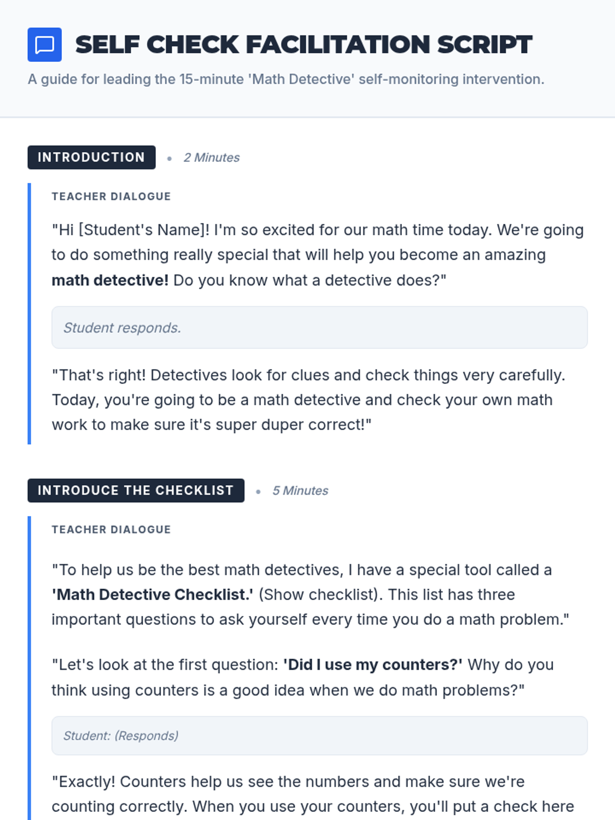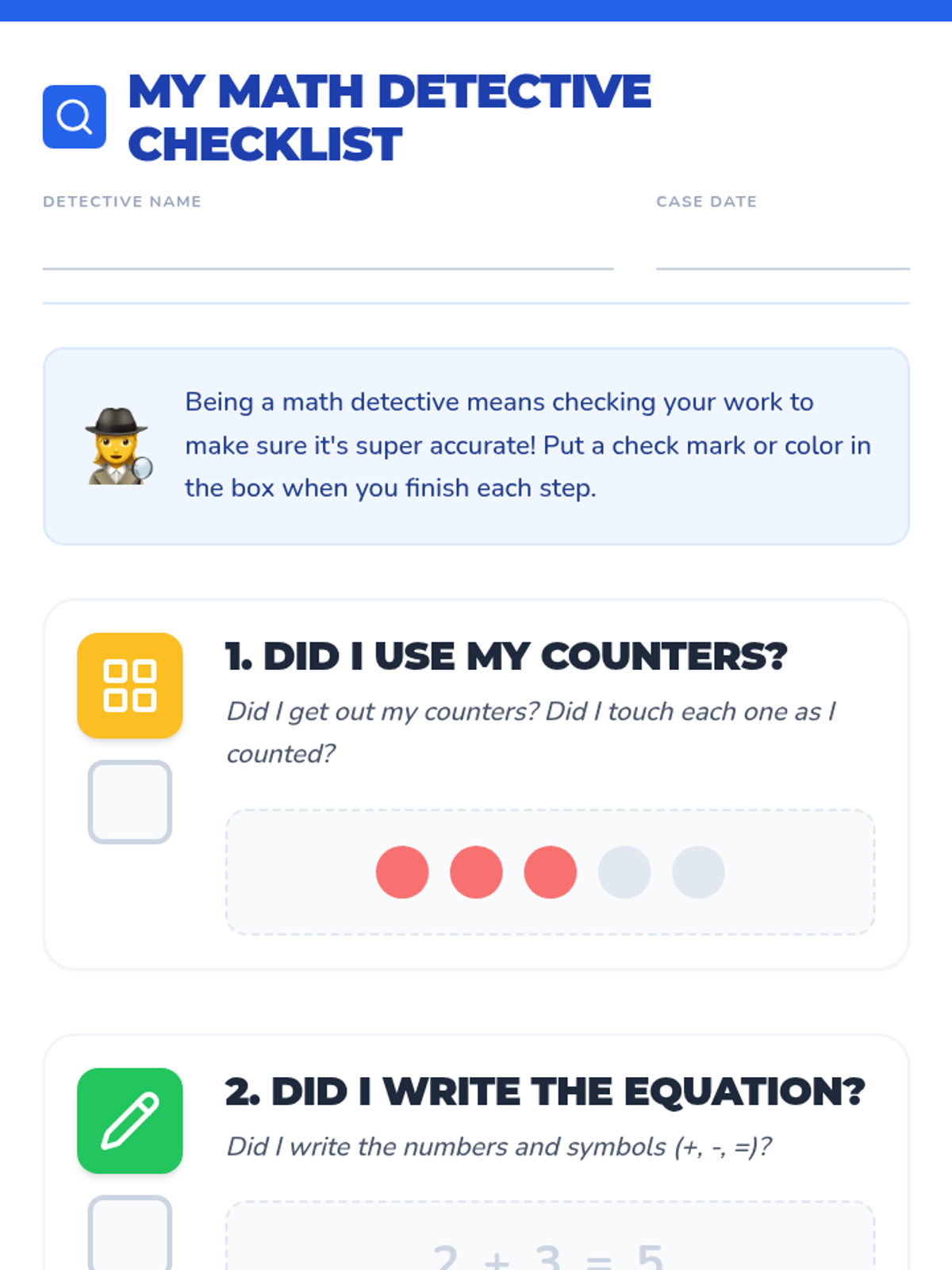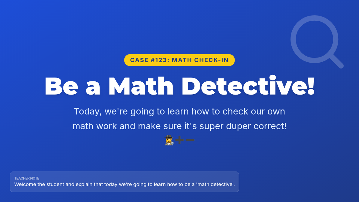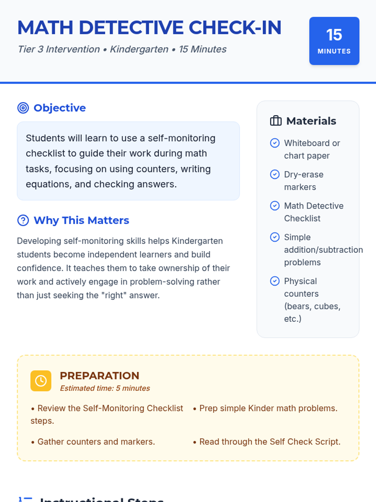 A Tier 3 Kindergarten intervention designed to build independence through a self-monitoring checklist. Students learn to use a 'Math Detective' checklist to track their work with counters, equations, and answer verification.