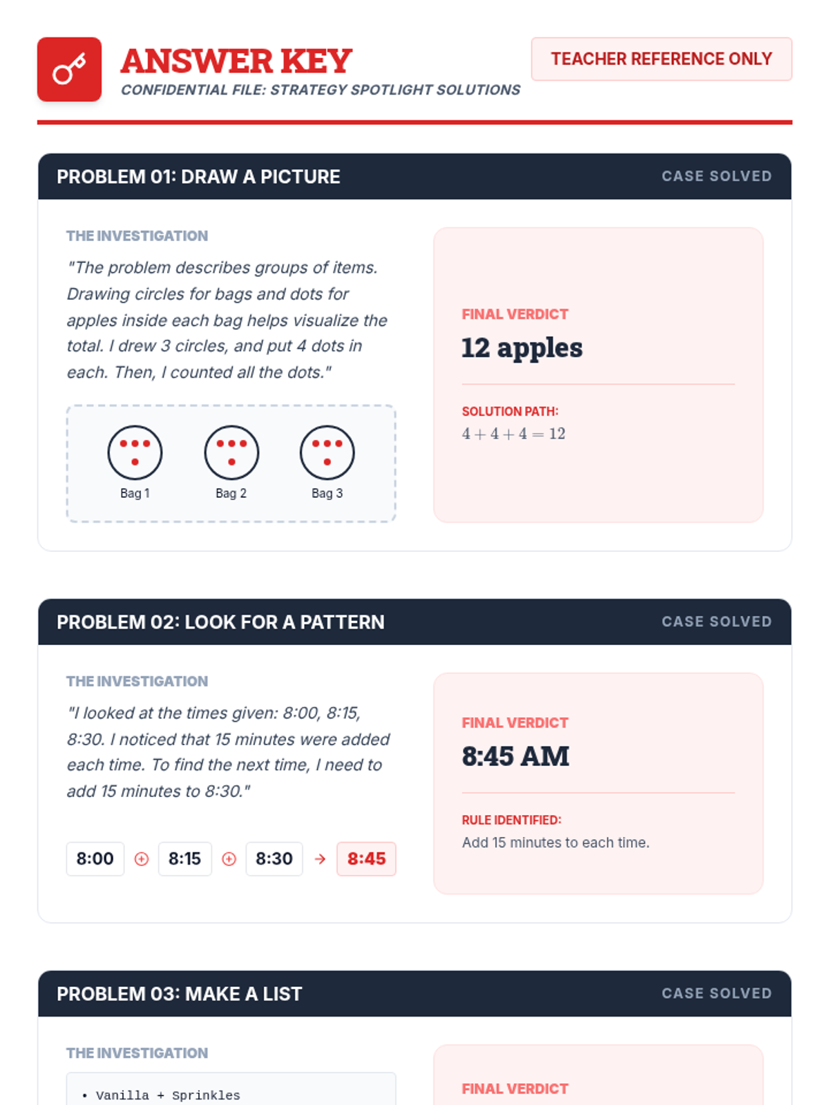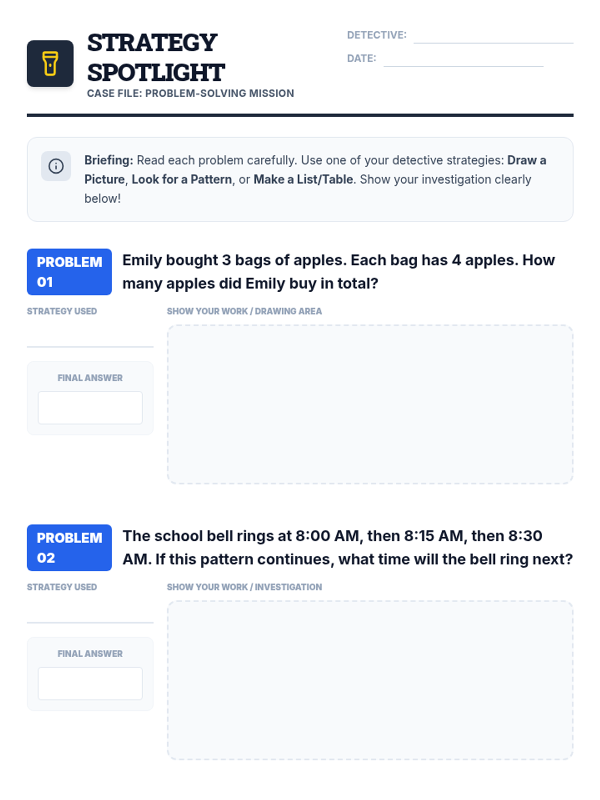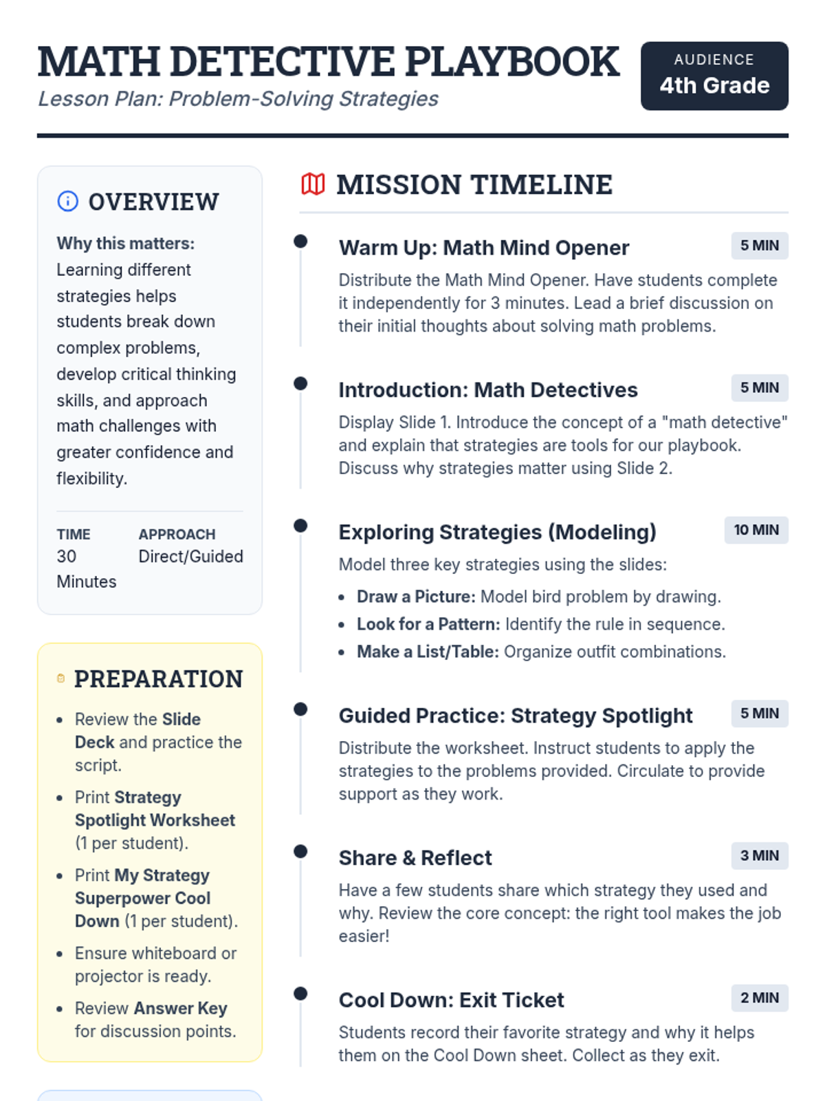 This lesson introduces 4th-grade students to effective strategies for solving math problems using a 'math detective' theme. Students explore strategies like drawing pictures, looking for patterns, and making lists to build confidence and flexibility in their problem-solving skills.