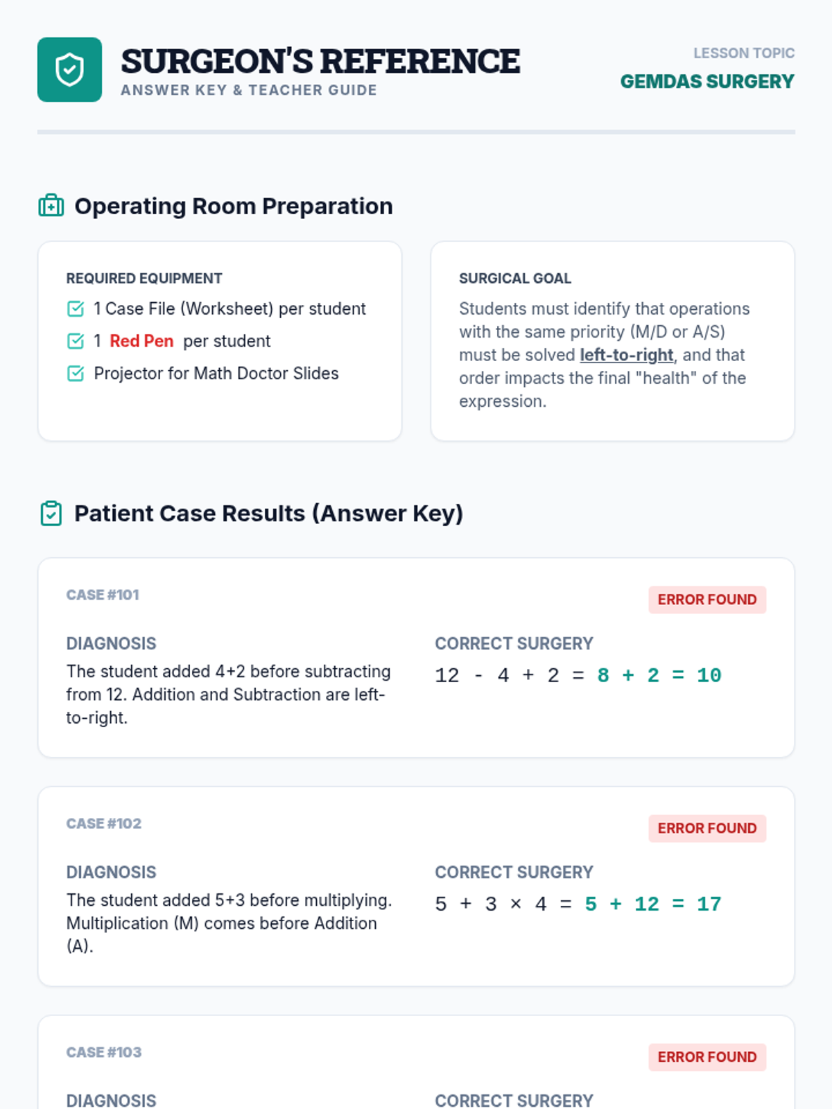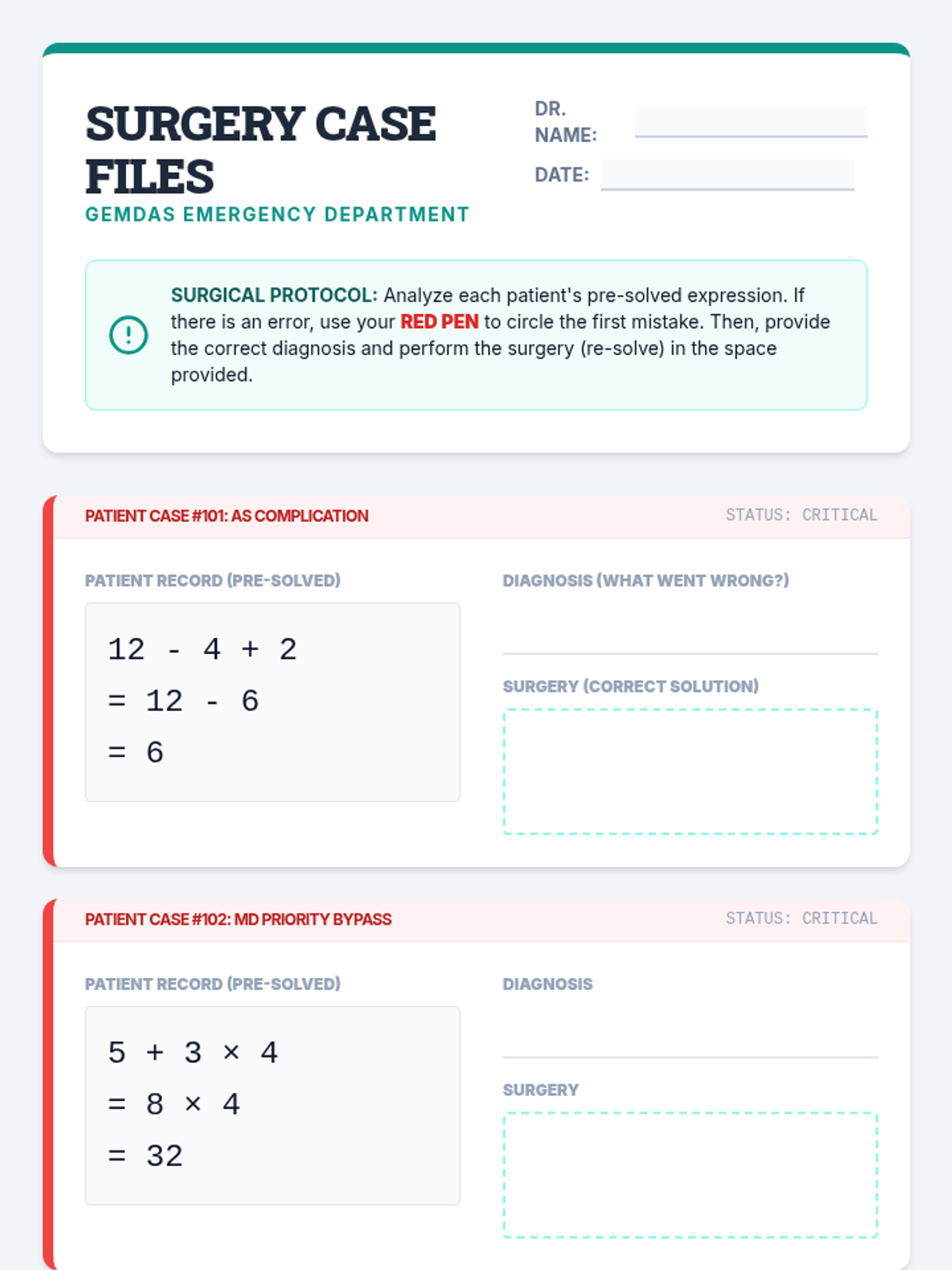 Students become 'Math Doctors' to diagnose and treat GEMDAS errors in pre-solved expressions, focusing on identifying common misconceptions in the order of operations.