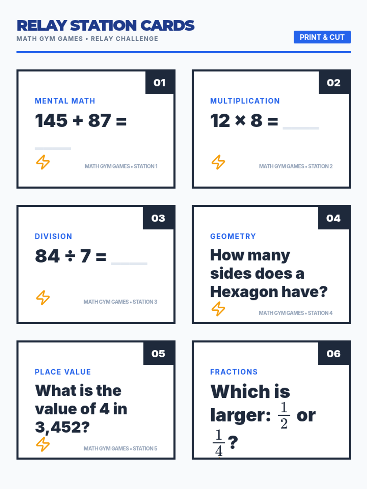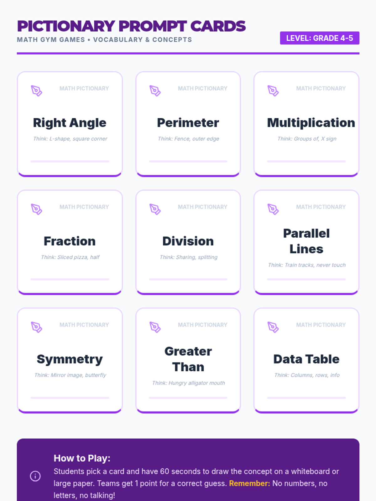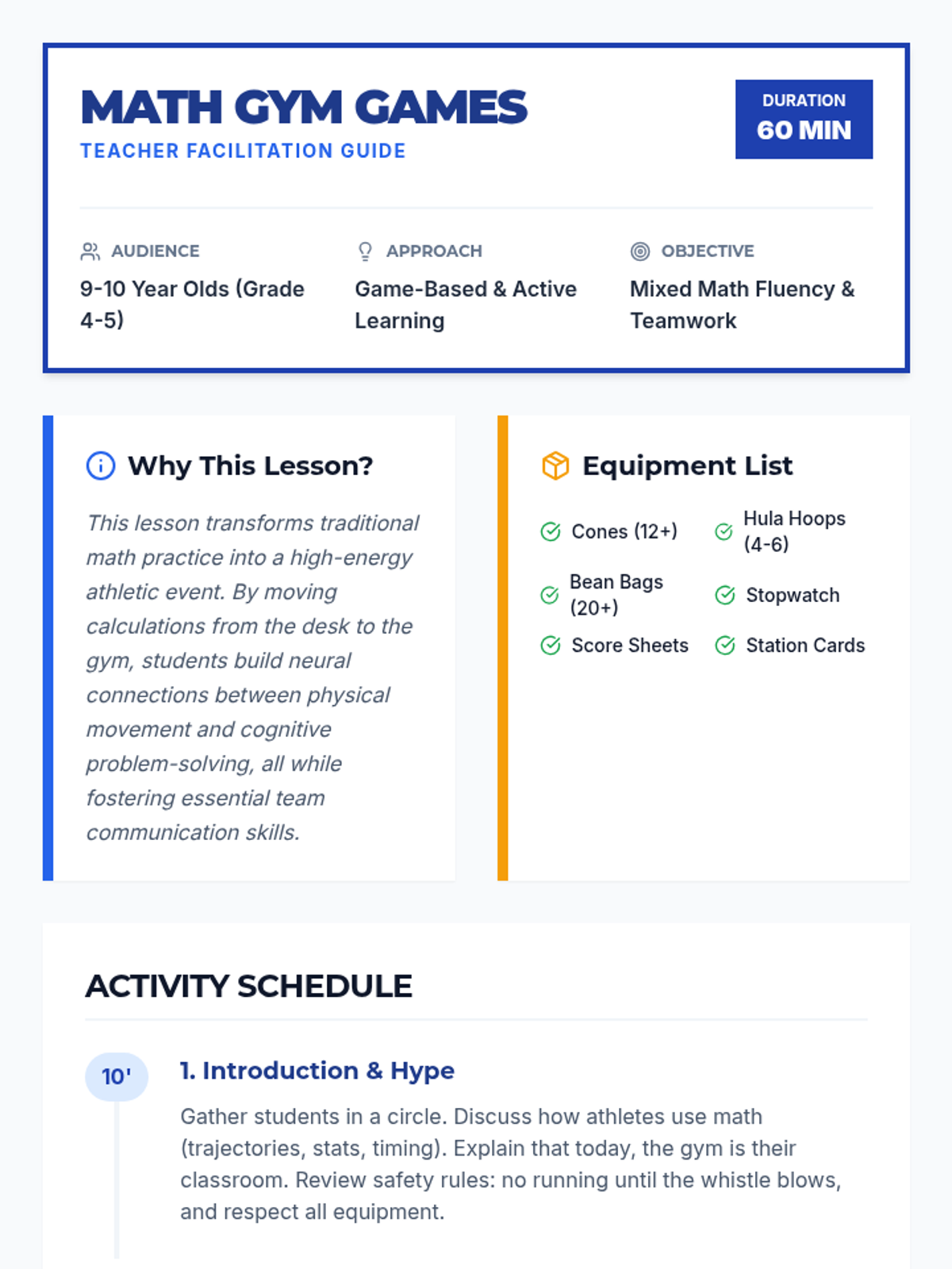 An active, gym-based lesson for 9-10 year olds that combines physical activity with math challenges. Students participate in relay races, obstacle courses, and math pictionary to reinforce addition, multiplication, and problem-solving skills.