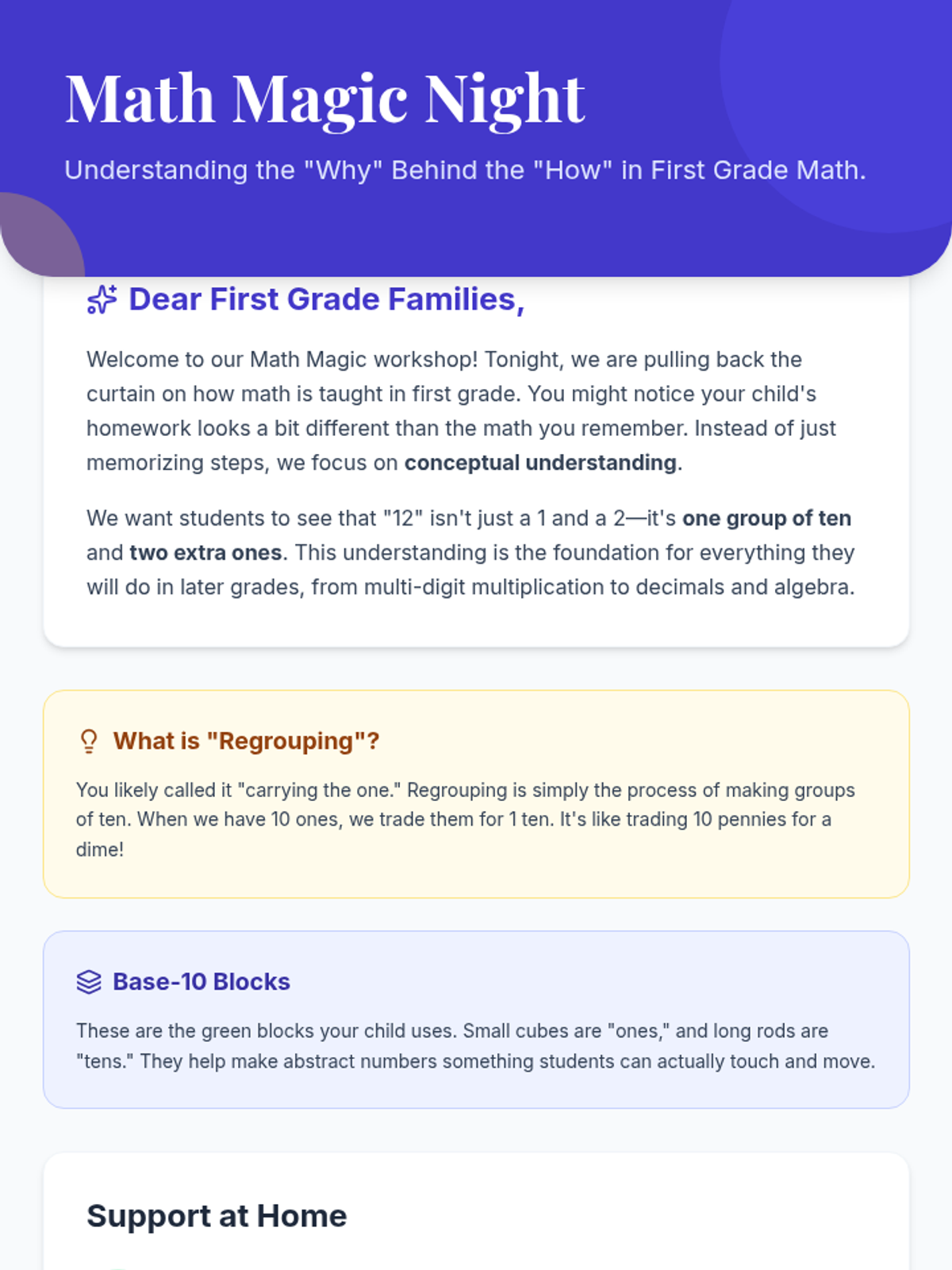 A specialized workshop for first-grade parents to demystify 'new math' regrouping strategies using base-10 blocks and visual models. Parents will bridge the gap between their own rote-memorized childhood math and the conceptual understanding their children are building today.