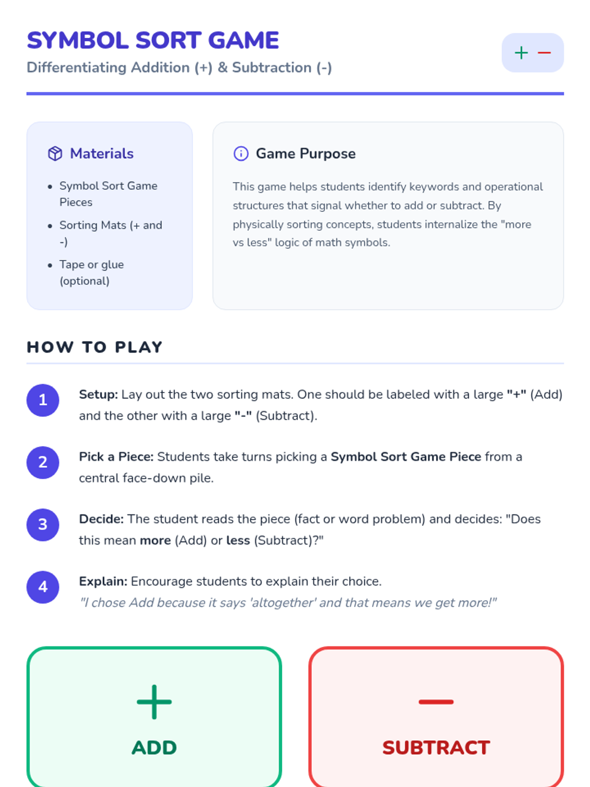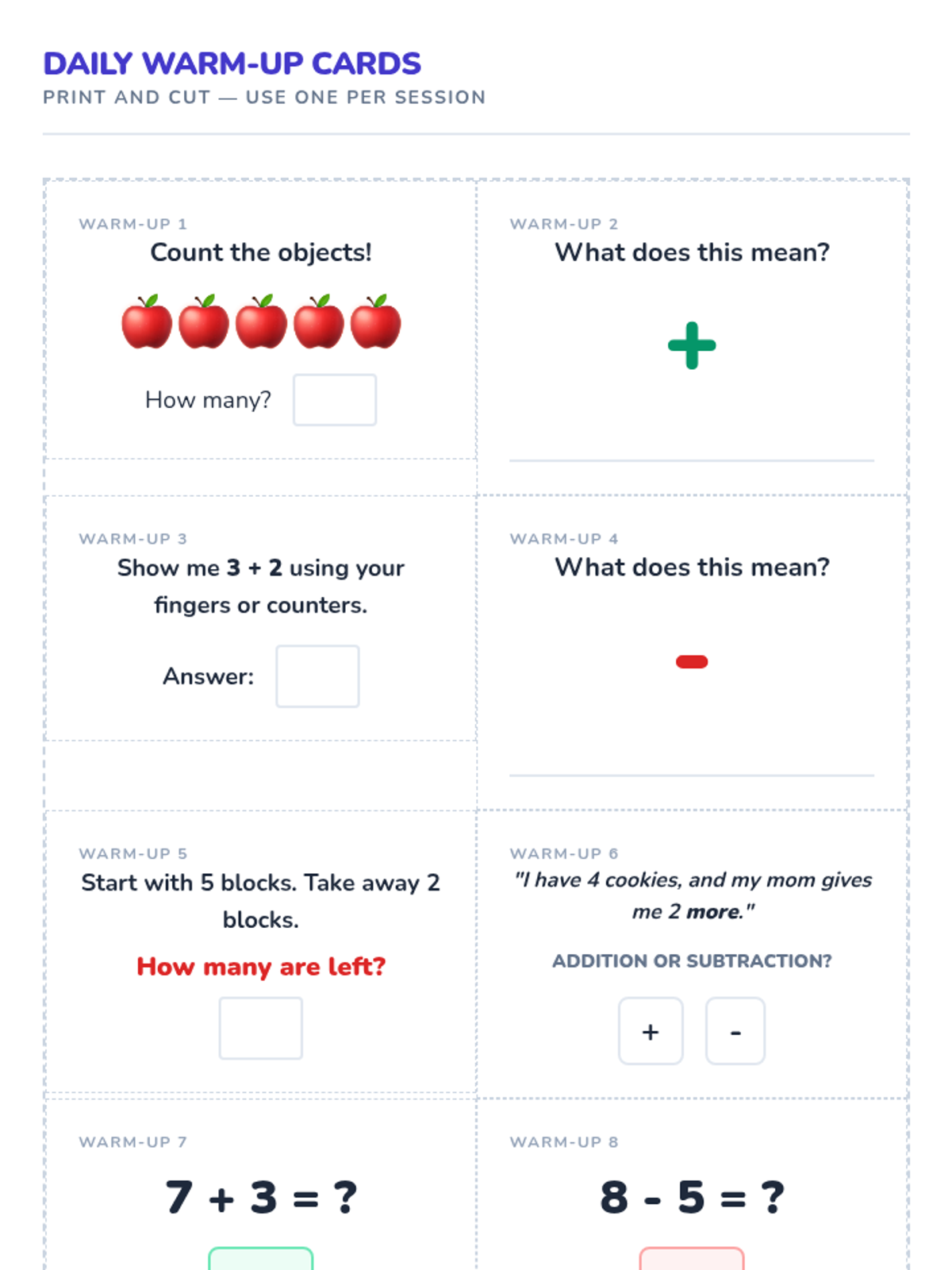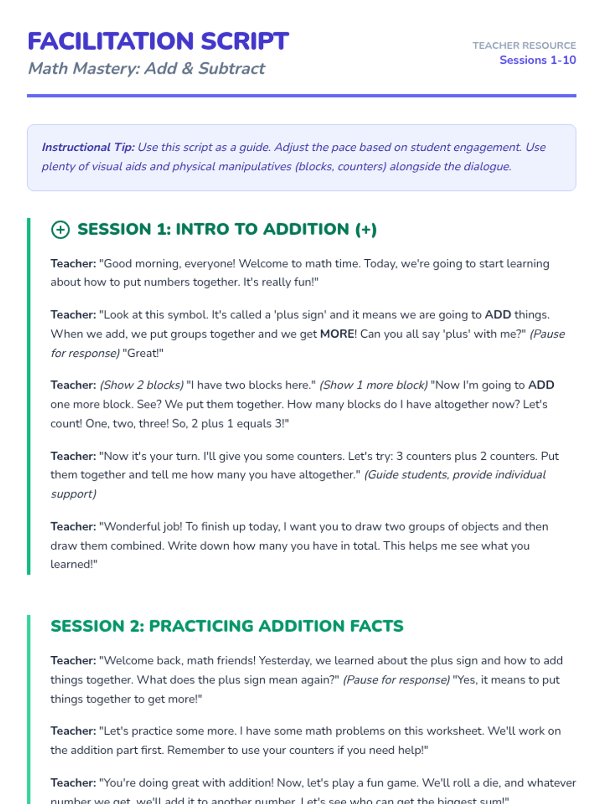 A 10-session intervention designed for small groups to master addition and subtraction within 20, understanding place value up to the hundreds, and correctly using math symbols. This lesson provides hands-on support and repetitive practice for foundational math success.