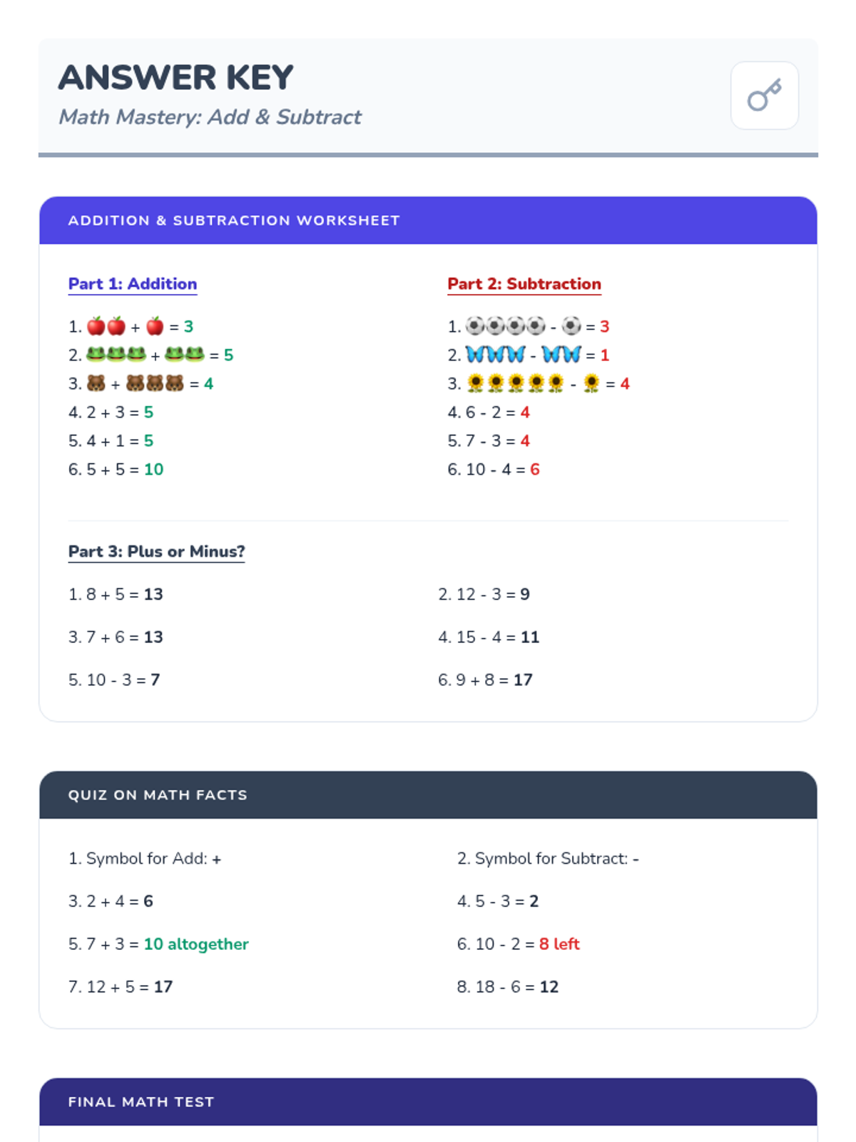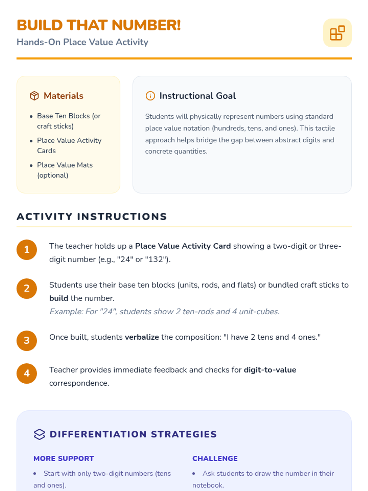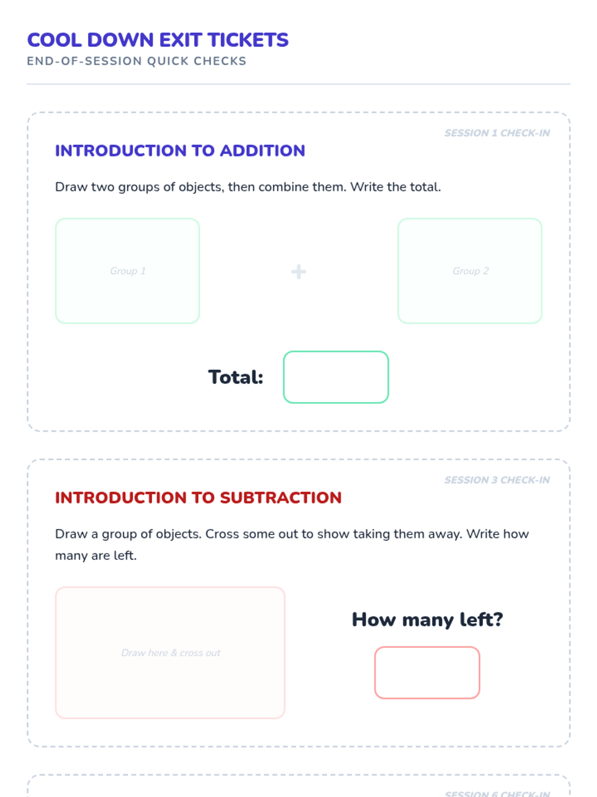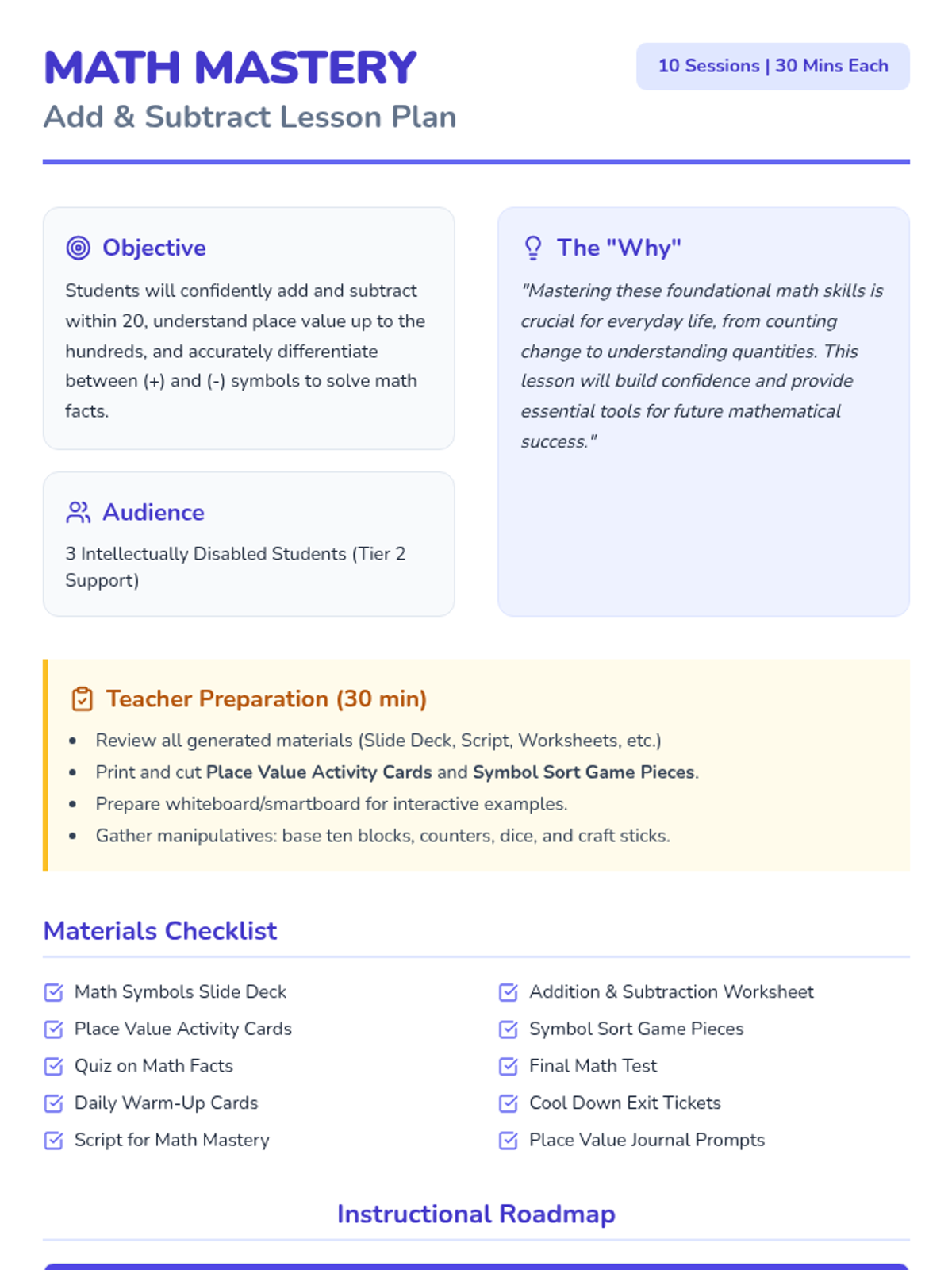 A 10-session intervention designed for small groups to master addition and subtraction within 20, understanding place value up to the hundreds, and correctly using math symbols. This lesson provides hands-on support and repetitive practice for foundational math success.