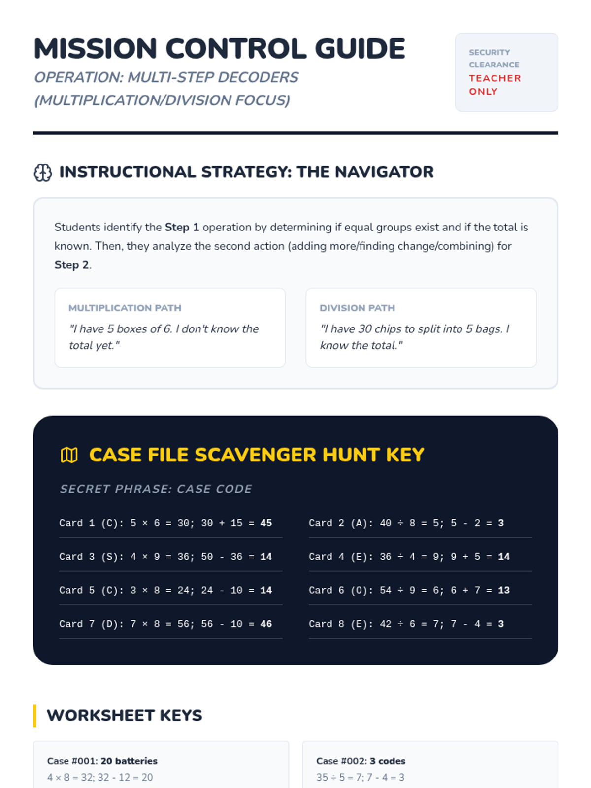 A lesson focused on solving two-step word problems involving multiplication and division, using a 'Secret Agent' decoder strategy to identify whether to multiply or divide based on group totals.