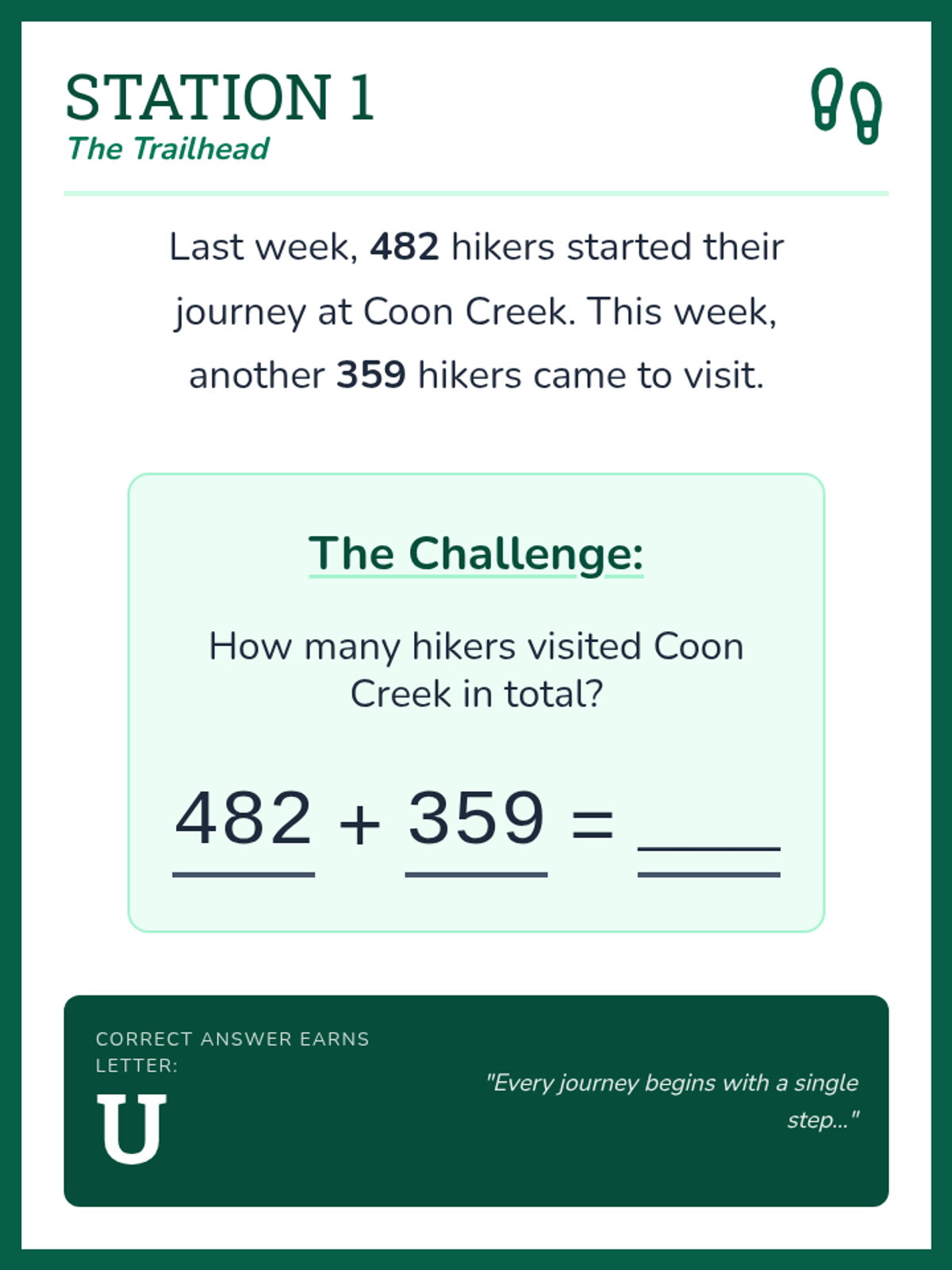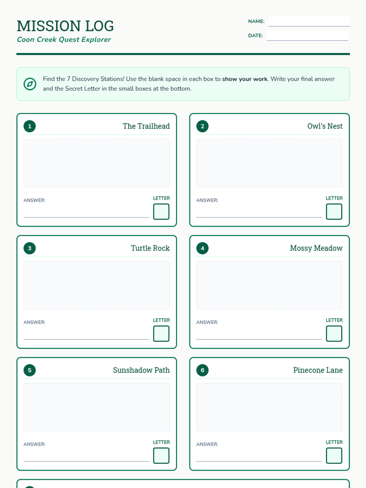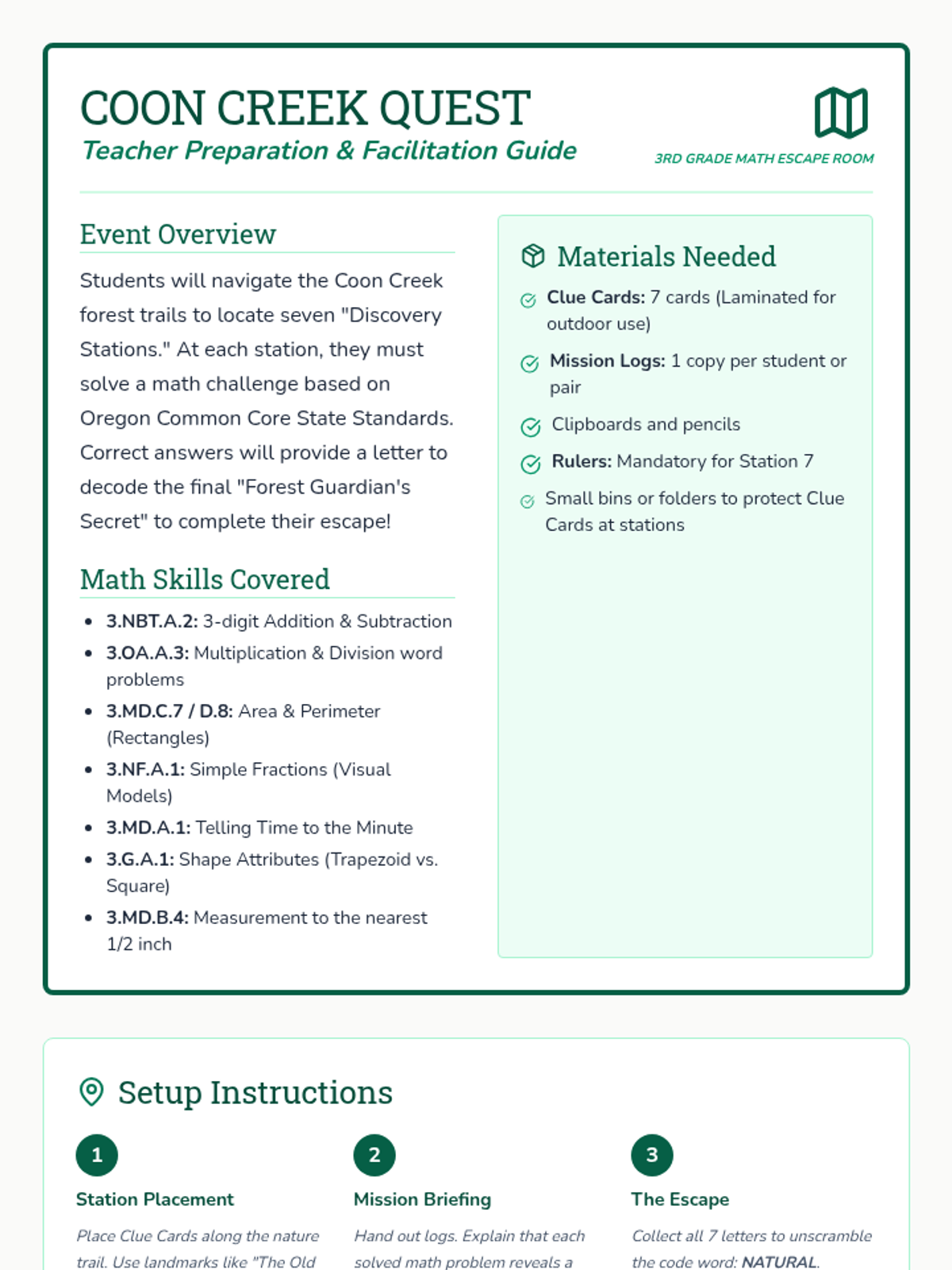 An outdoor math escape room set in the Coon Creek forest, reviewing 3rd-grade math standards including addition/subtraction, multiplication/division, area/perimeter, fractions, time, shapes, and measurement.