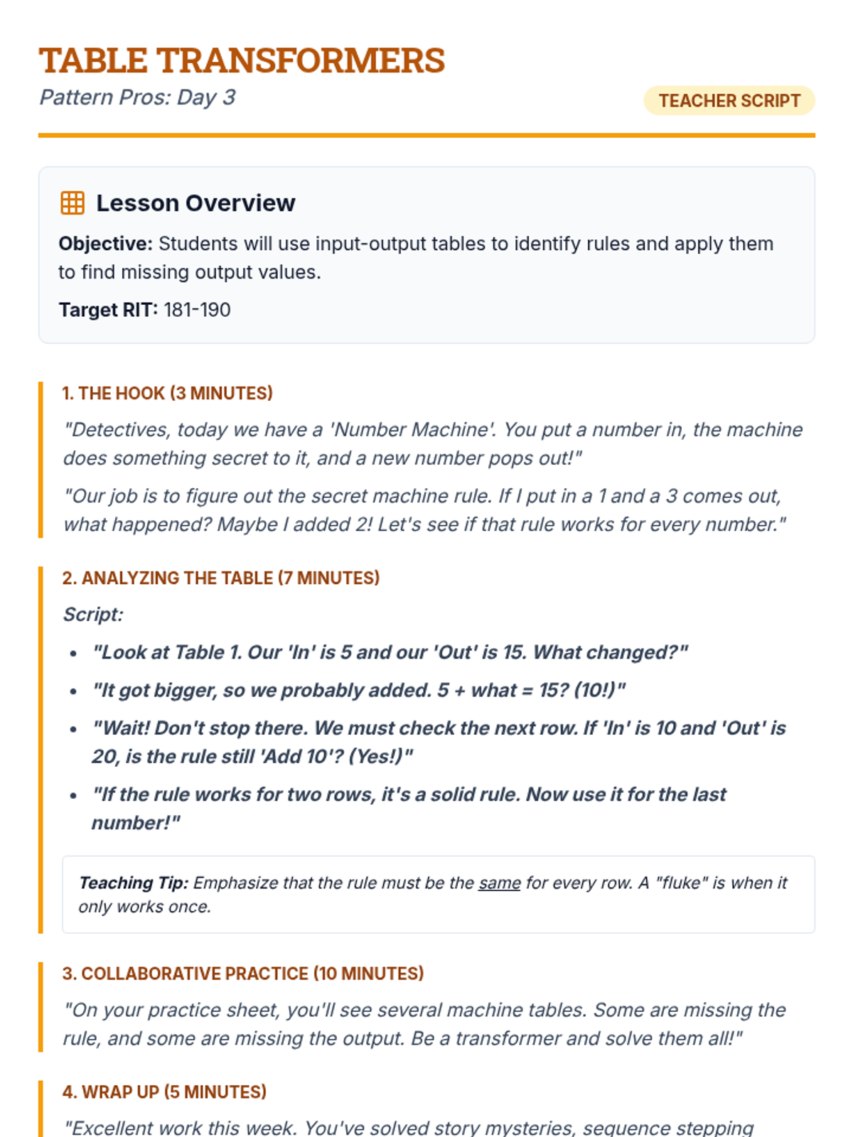 Introduces input/output tables as 'pattern machines,' teaching students to identify the operational rule and apply it to find missing values.