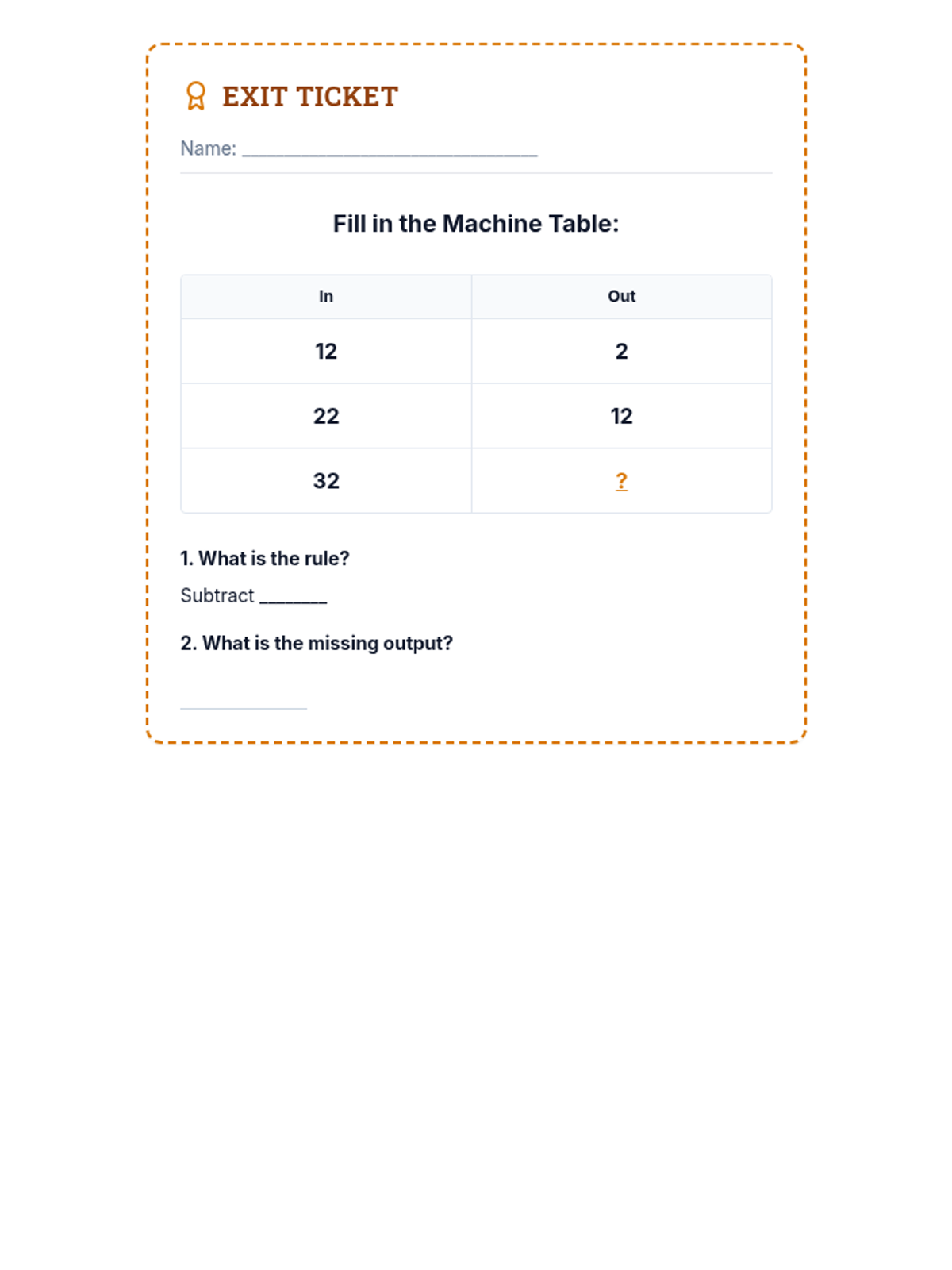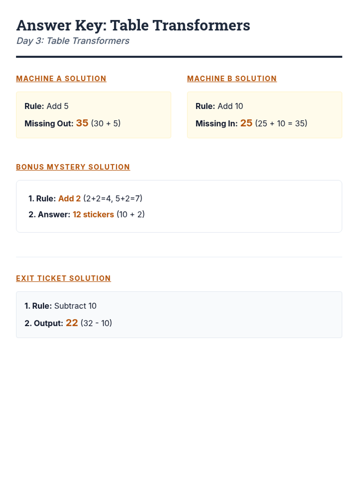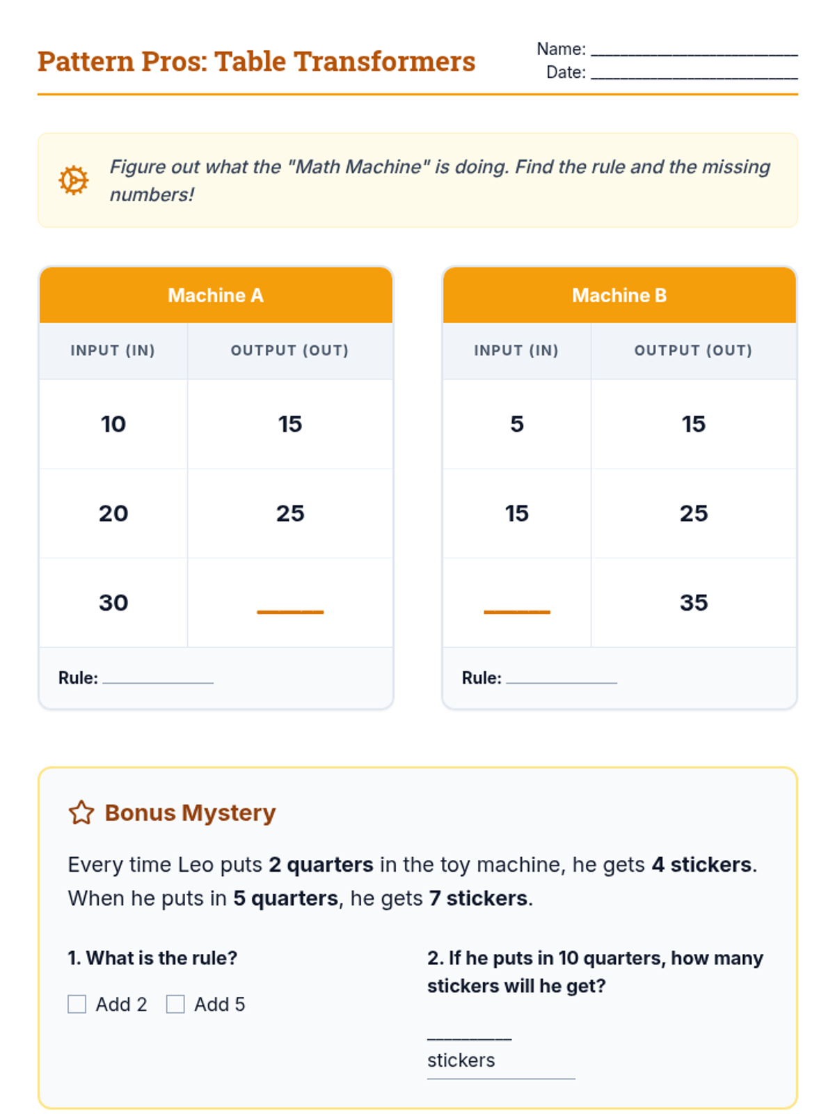 Students analyze input-output tables to identify constant addition or subtraction rules and apply those rules to find missing values.
