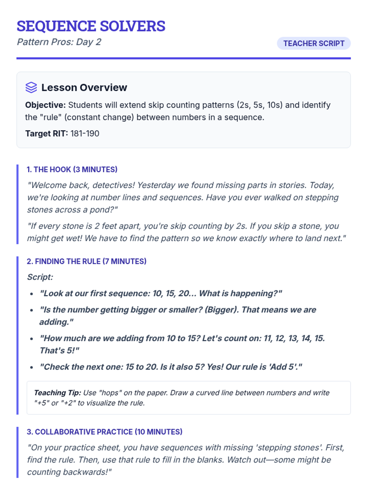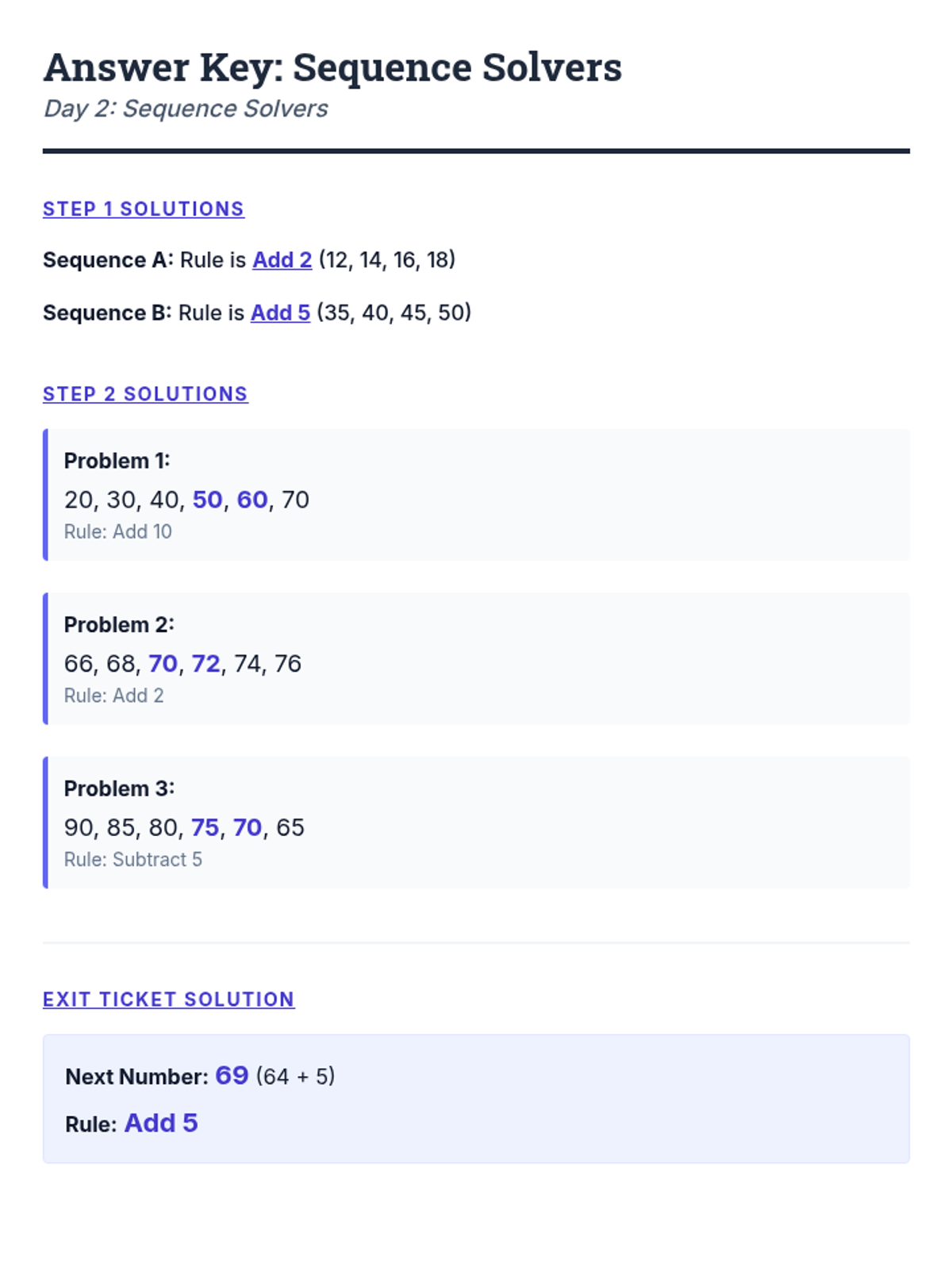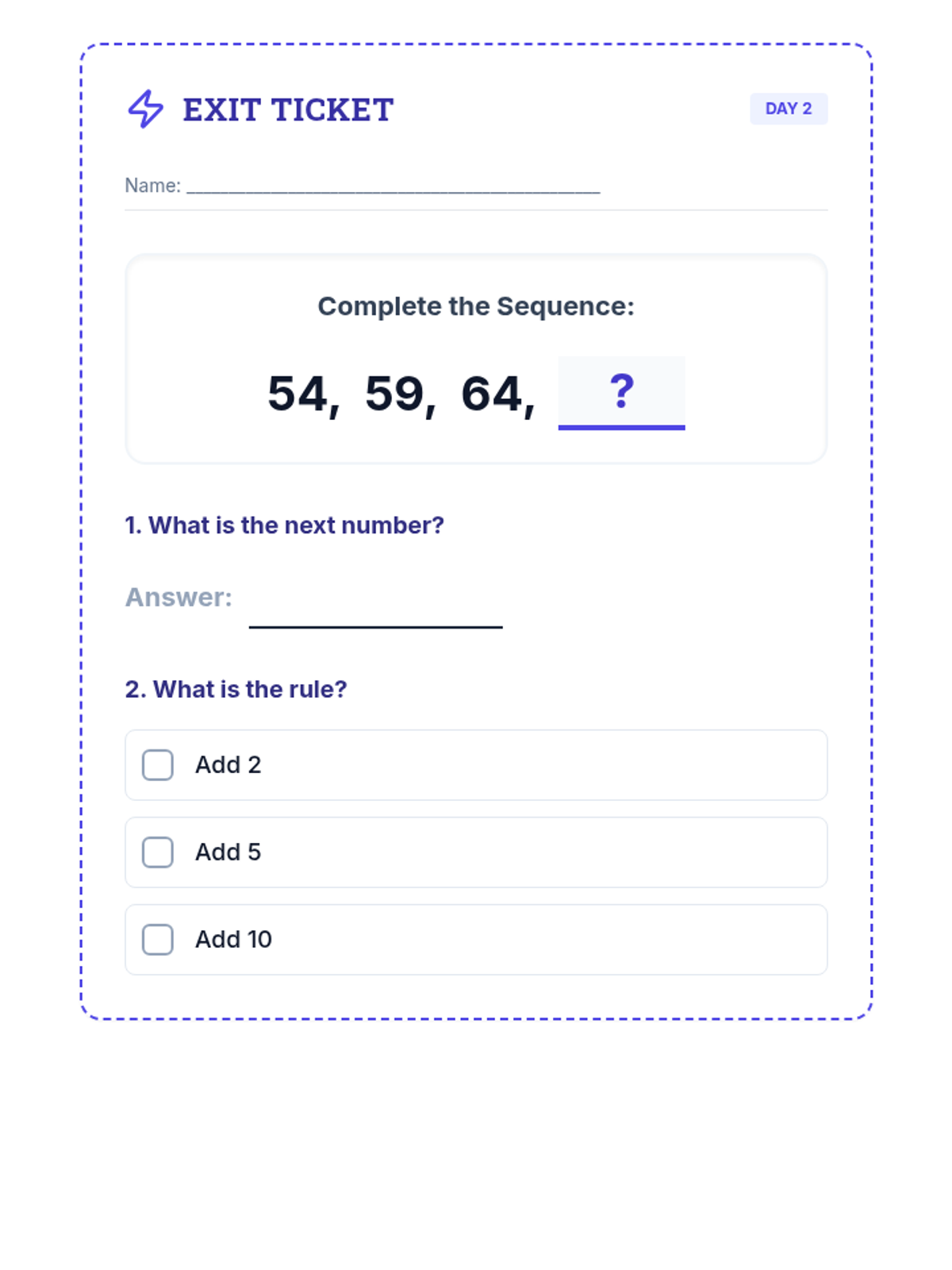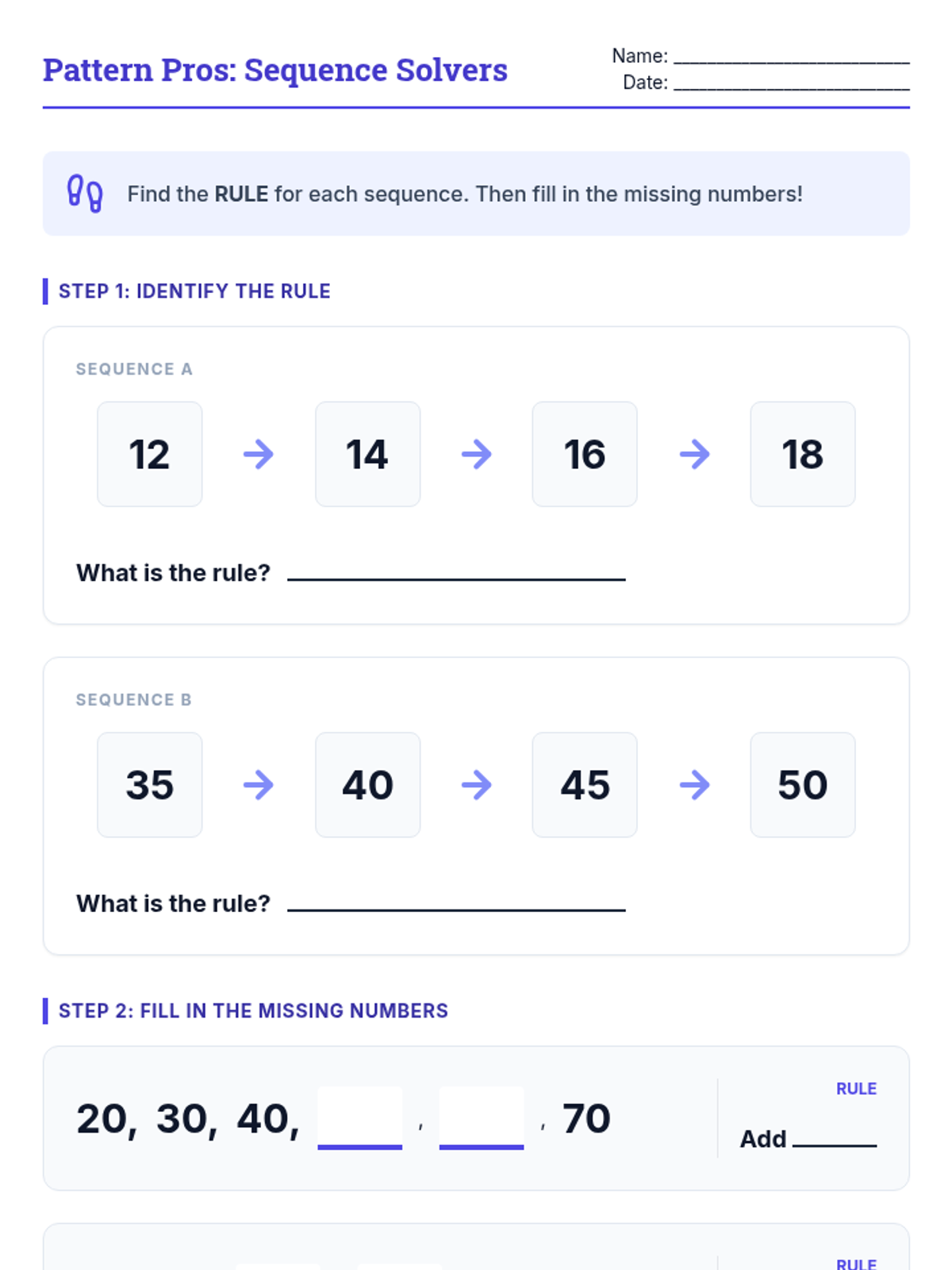 Students identify and extend skip counting patterns by 2s, 5s, and 10s, and practice finding the underlying rule for various number sequences.