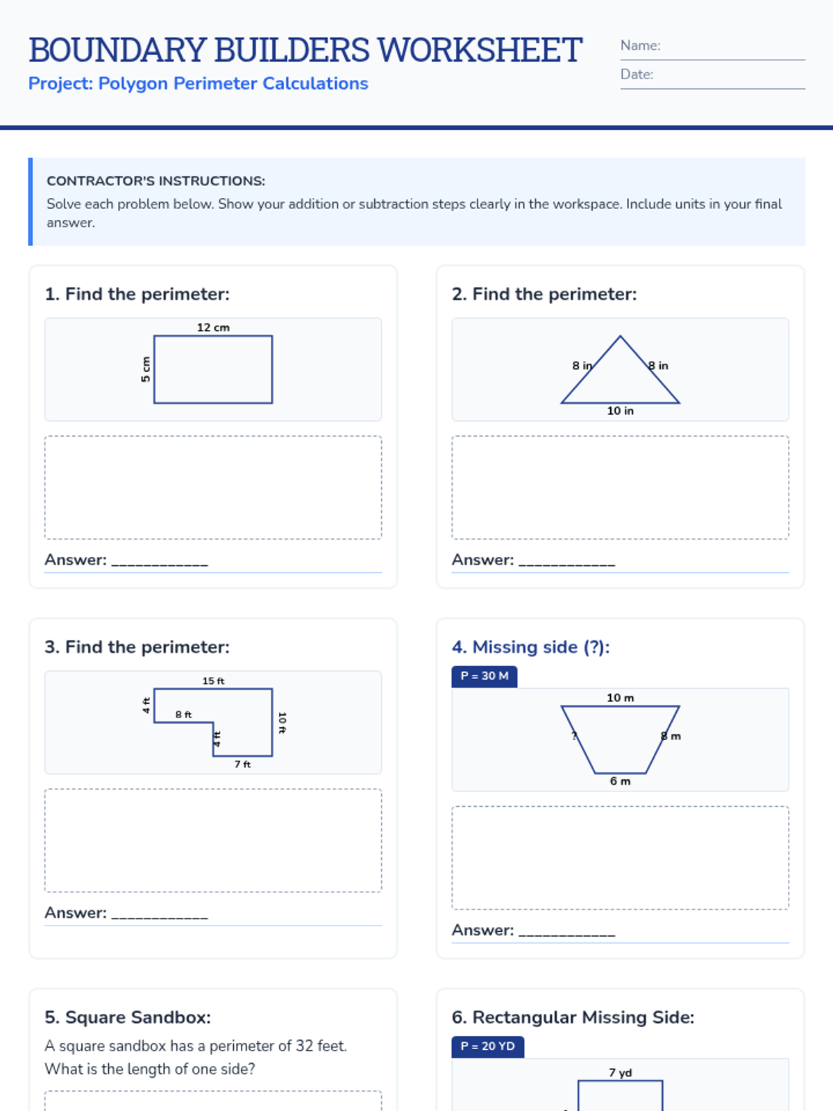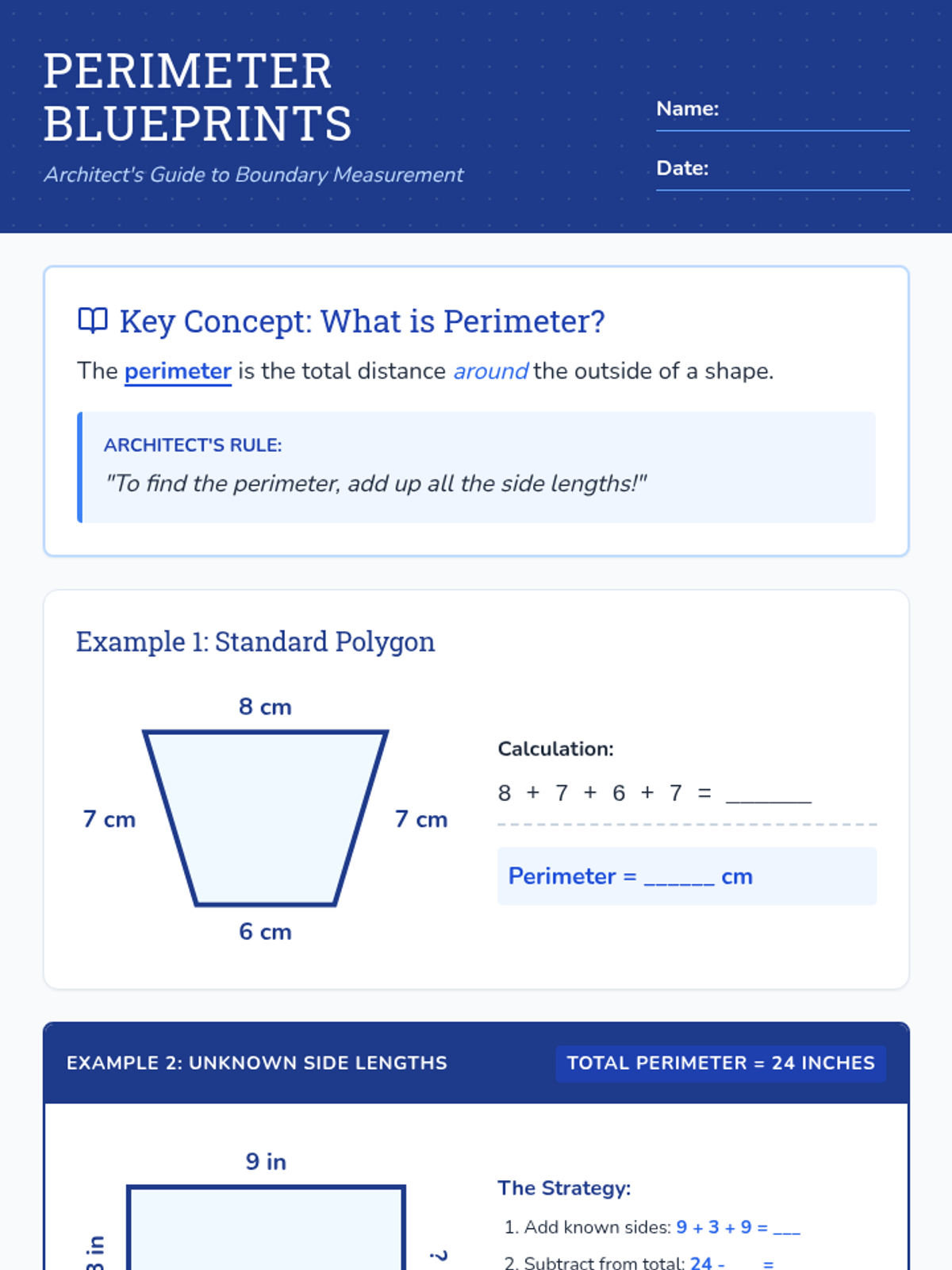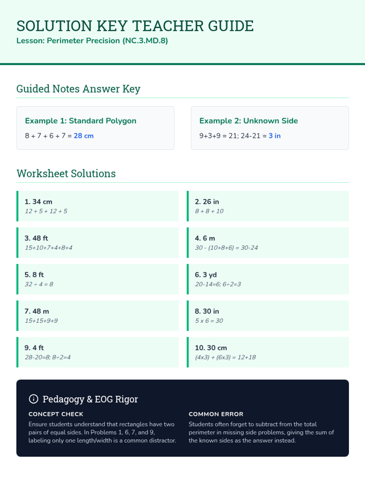 A comprehensive lesson on finding the perimeter of polygons and determining unknown side lengths when given the total perimeter, modeled after NC.3.MD.8 standards.