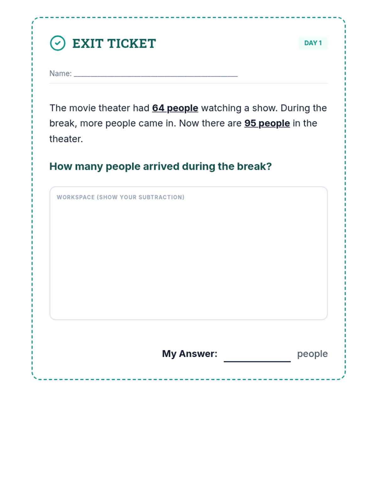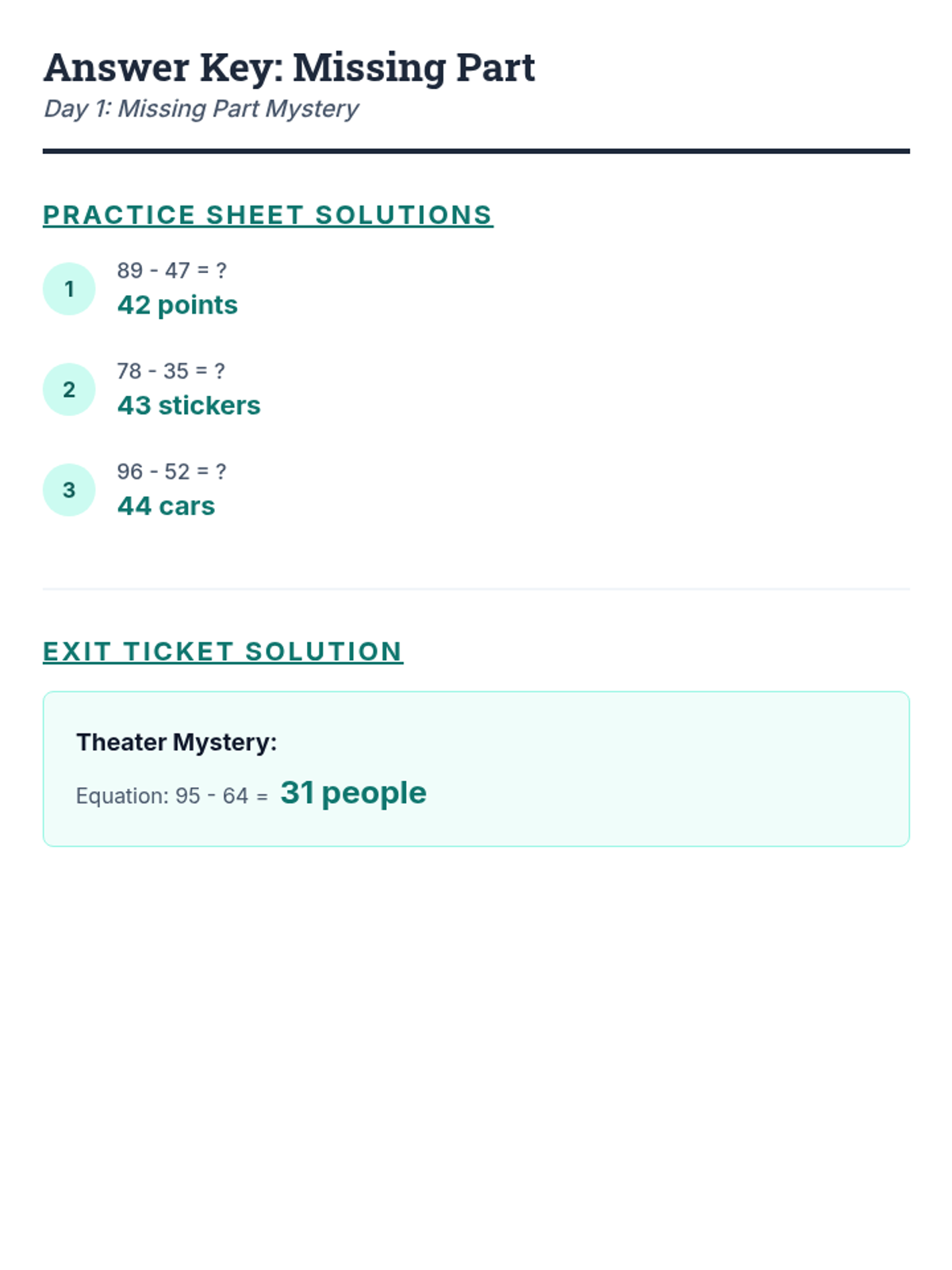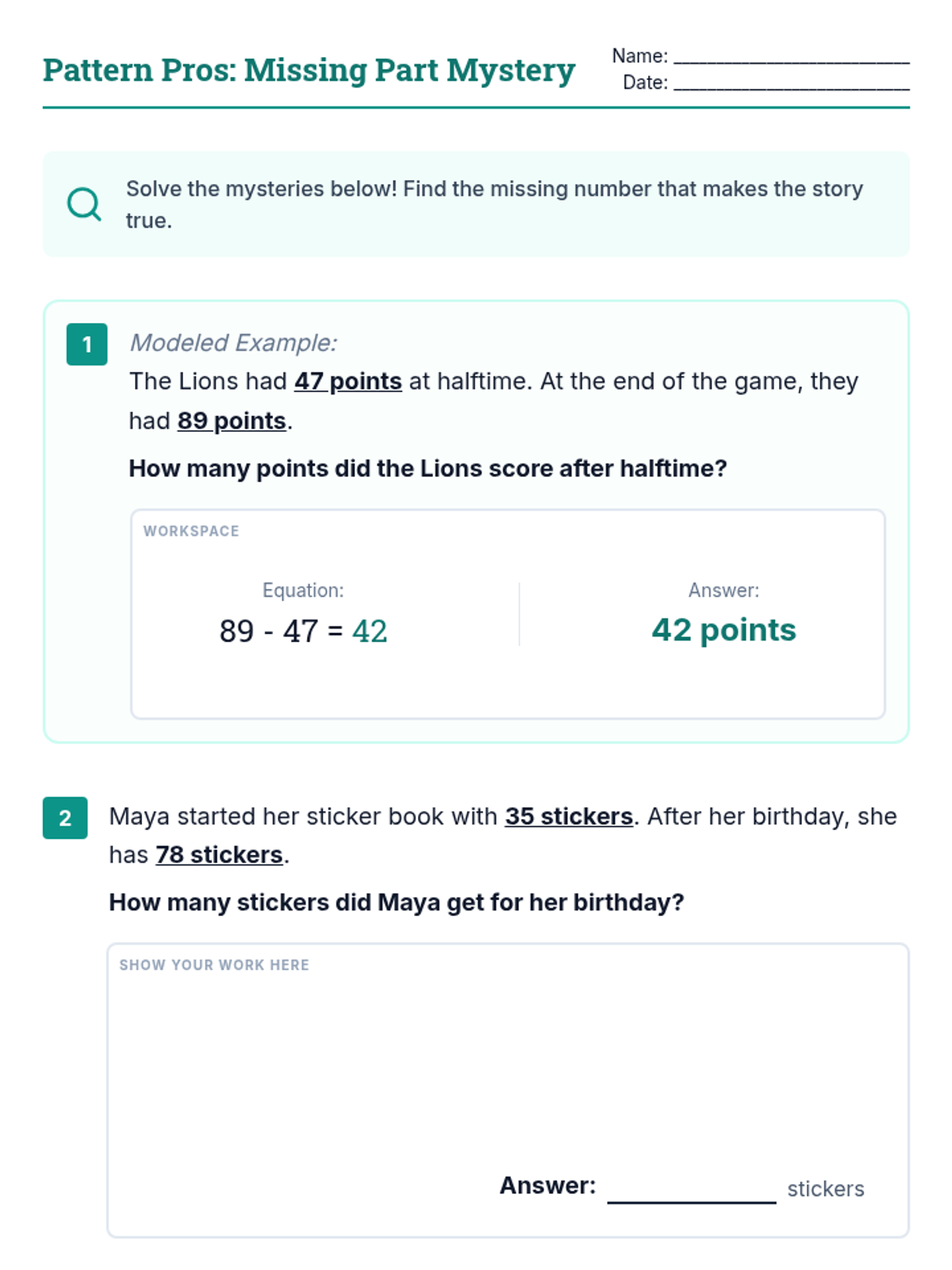 Students solve missing addend word problems within 100, focusing on finding the 'change' in a story context using subtraction strategies.