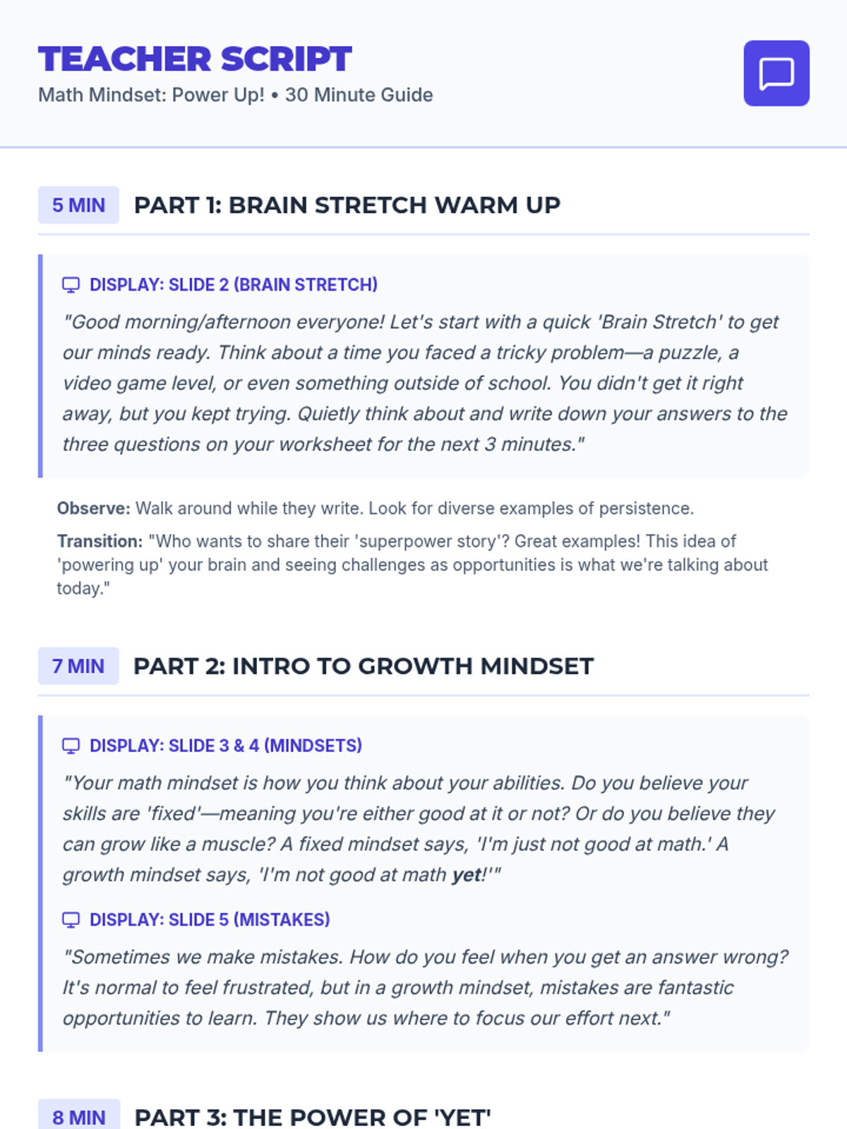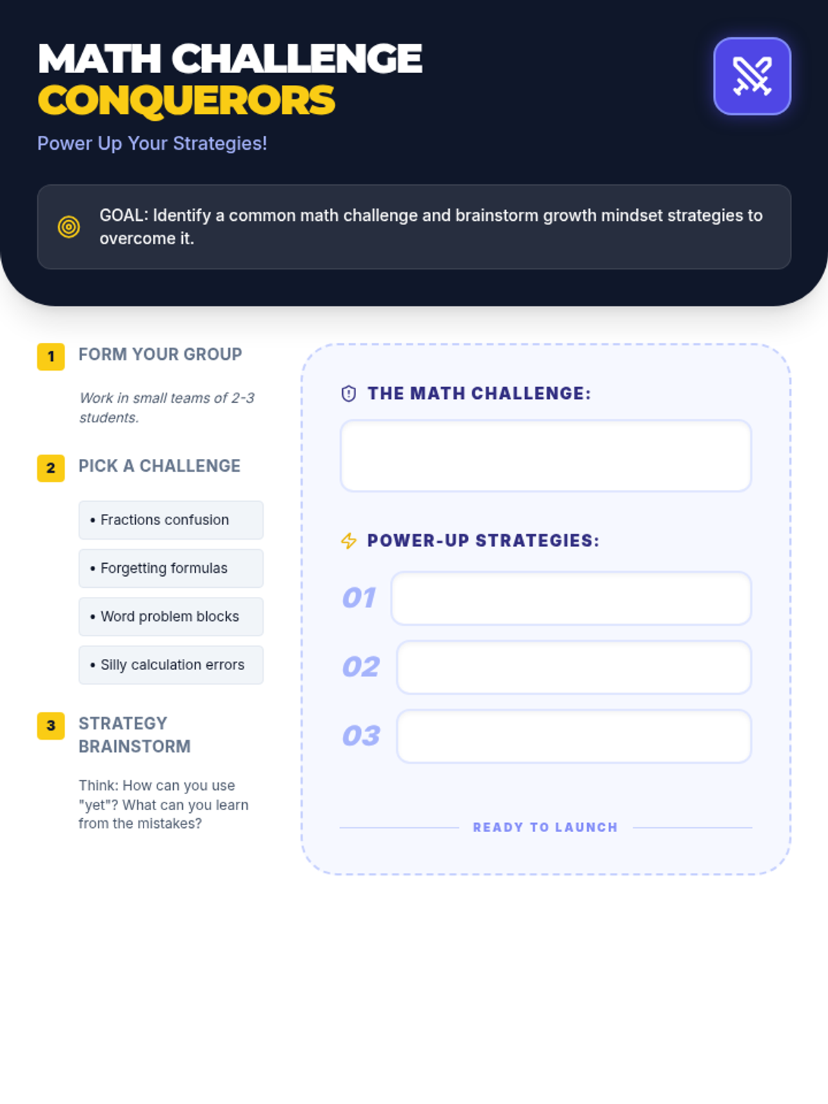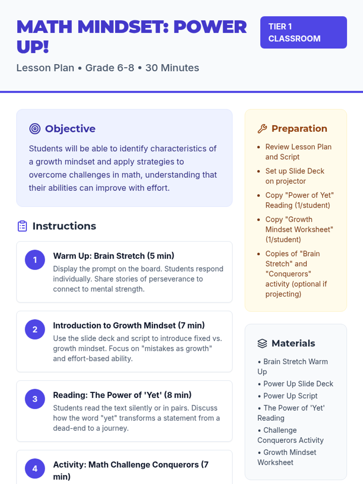 A 30-minute middle school lesson focused on cultivating a growth mindset in mathematics, teaching students to embrace challenges and mistakes as learning opportunities.