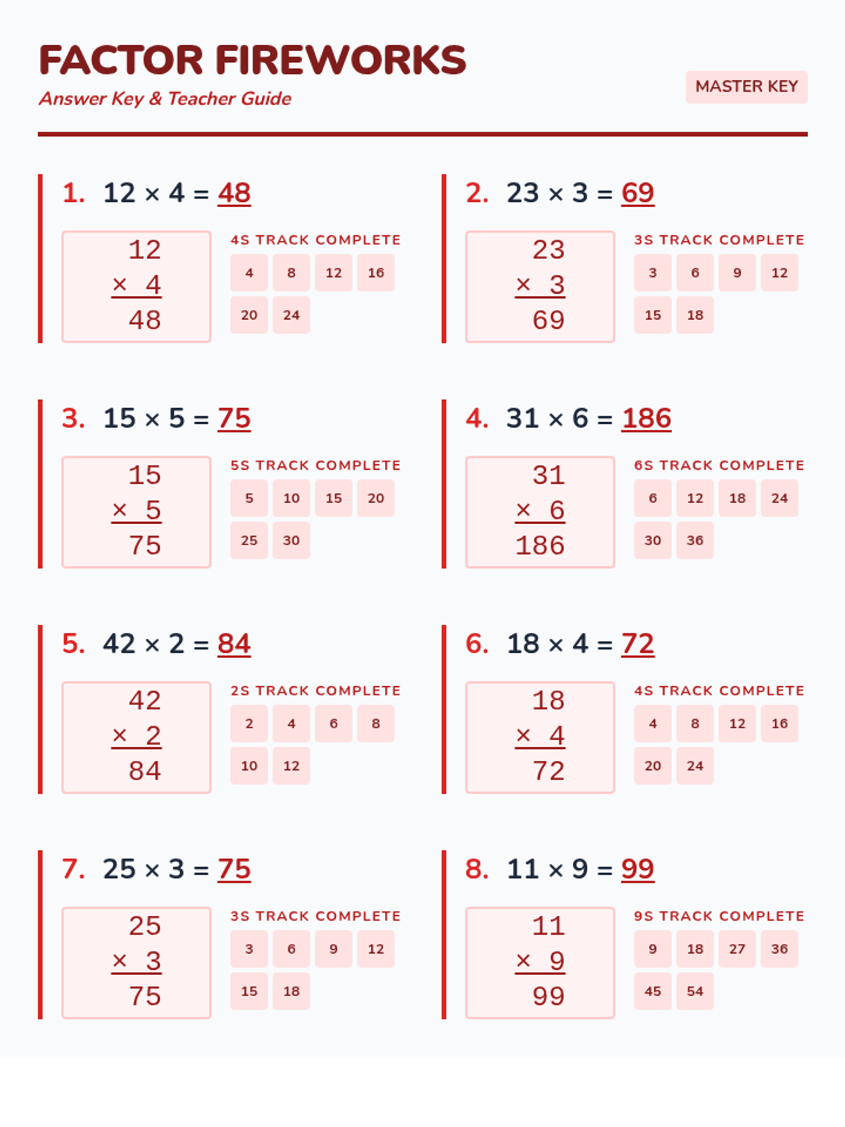 Students apply their knowledge of fact families to solve division problems, understanding division as the inverse of multiplication with single-digit divisors.