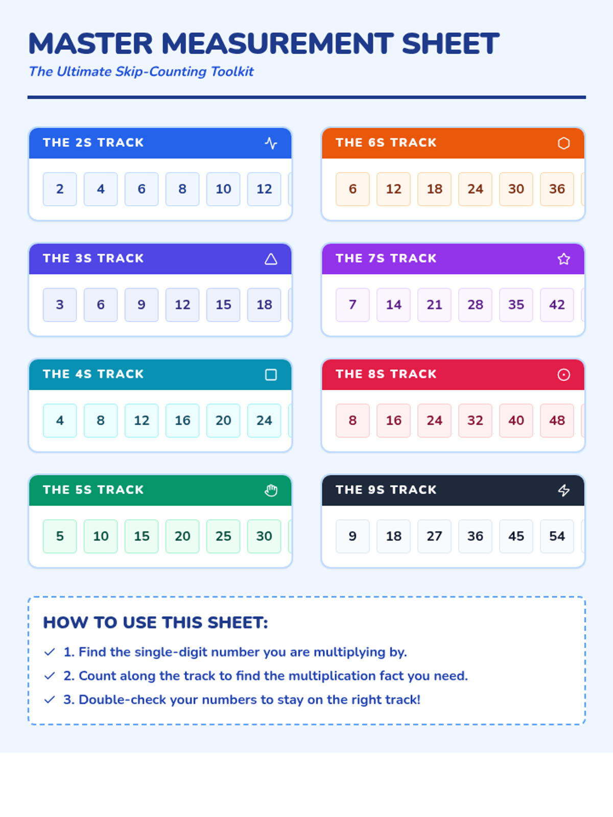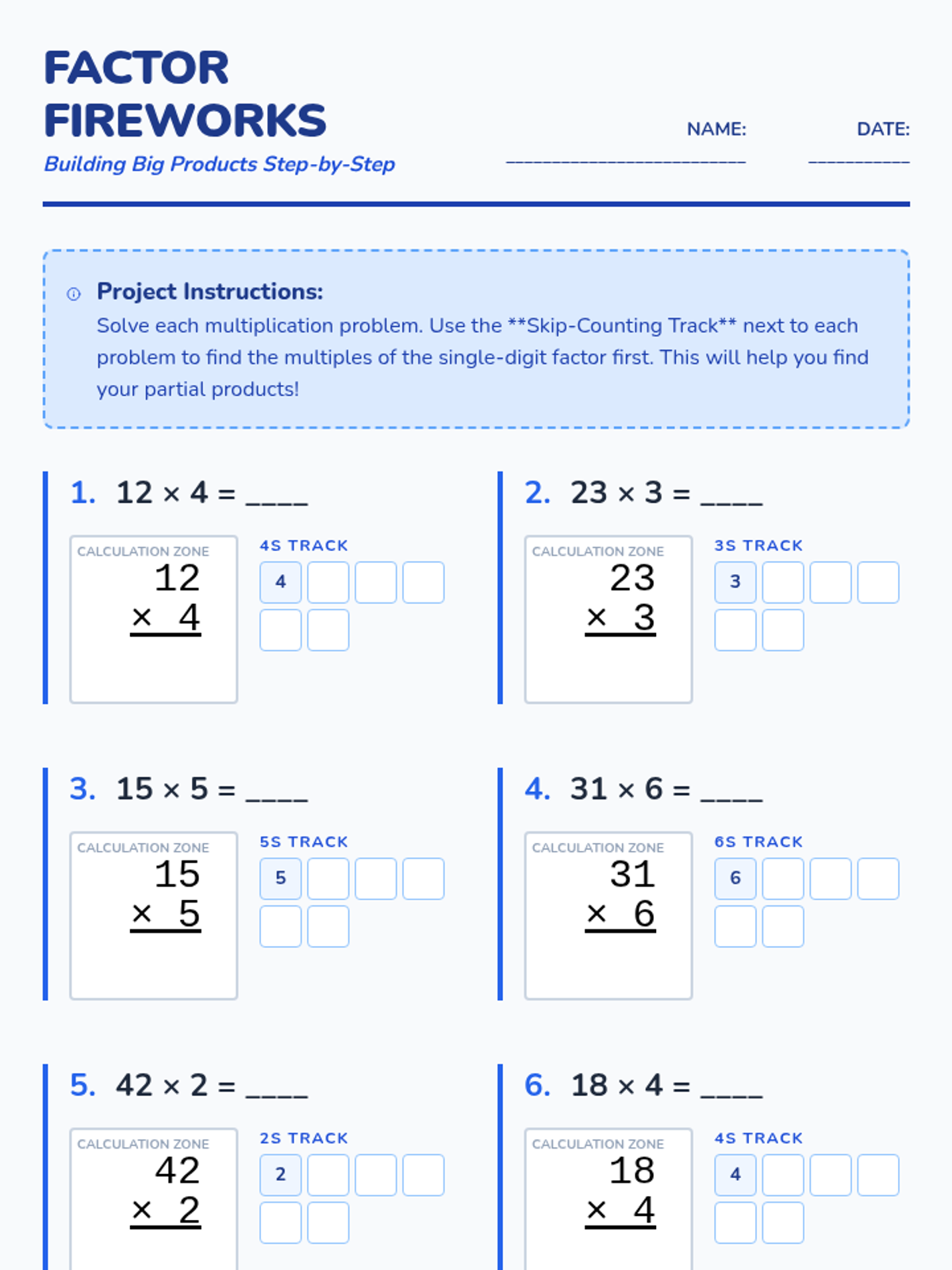 A focused lesson on multiplying double-digit numbers by single-digit numbers using skip-counting tracks and visual organizers to bridge the gap between basic facts and multi-digit algorithms.