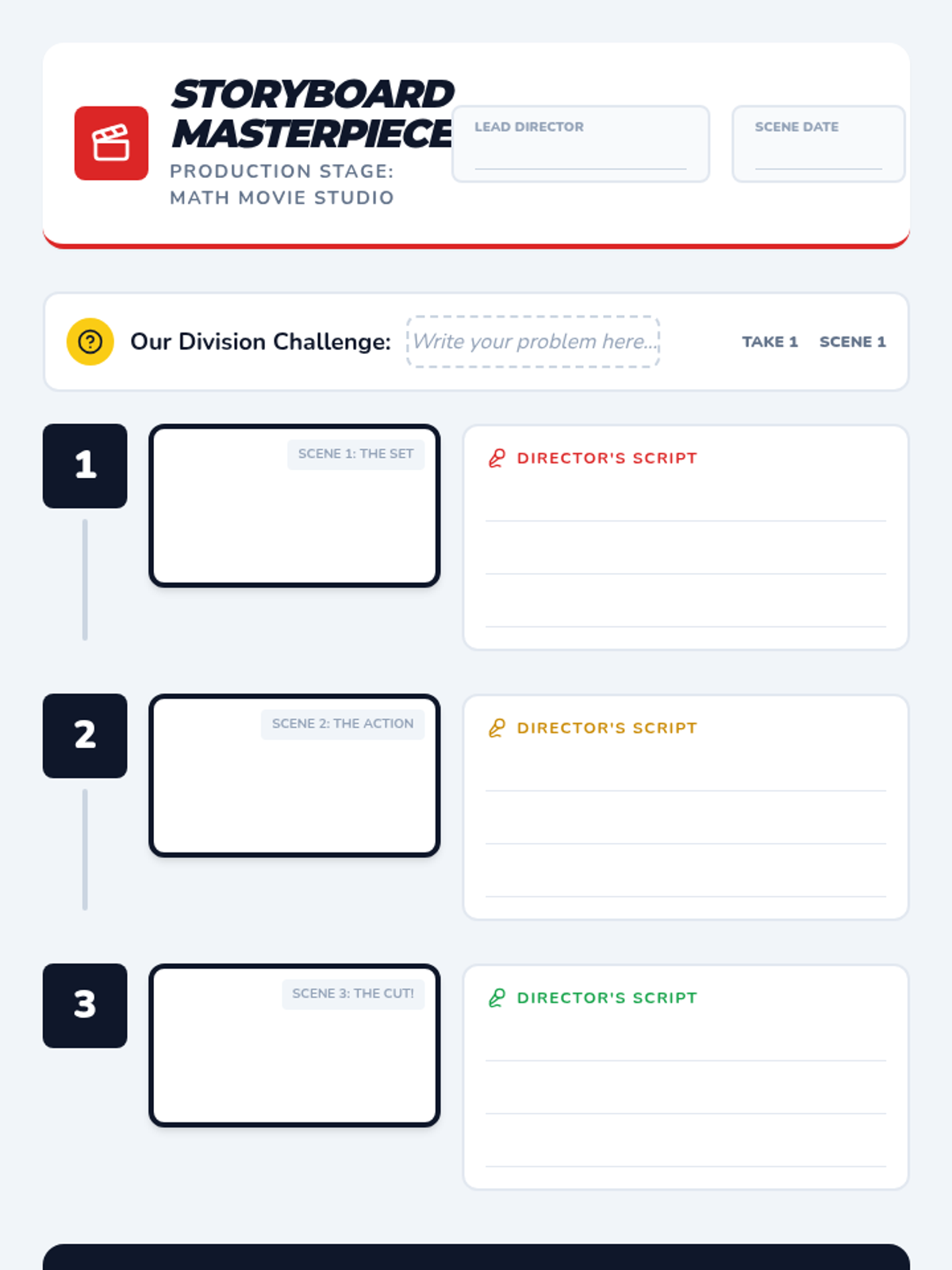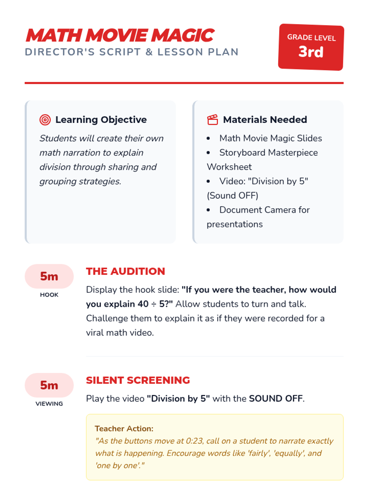 A 3rd-grade math lesson where students become movie directors, creating storyboards and scripts to narrate division problems using sharing and grouping strategies.