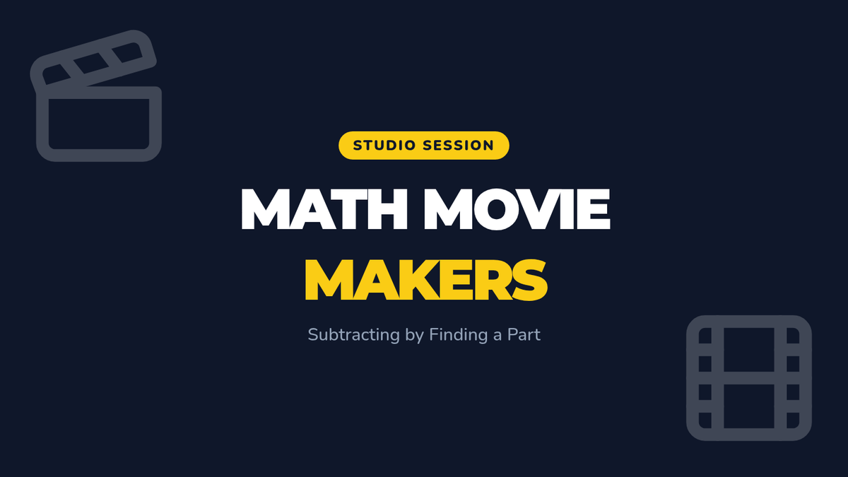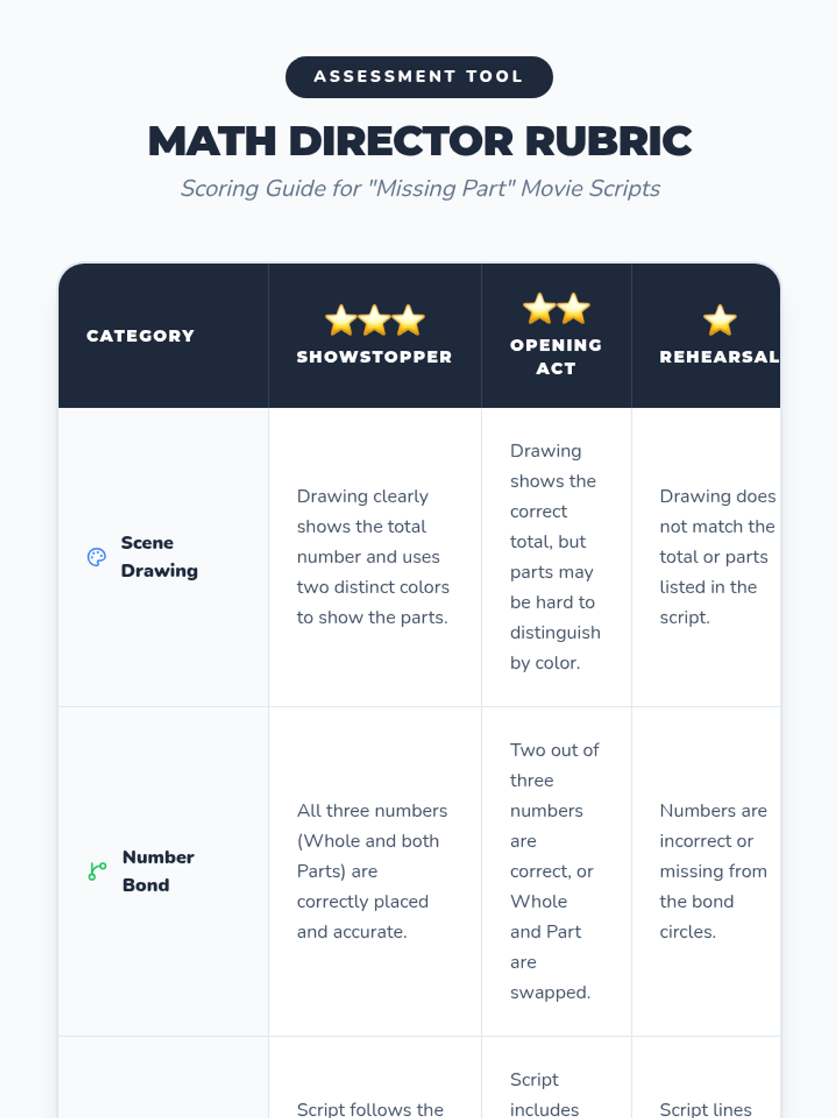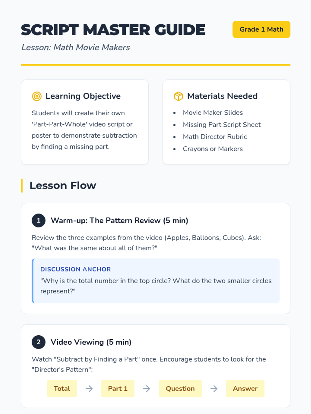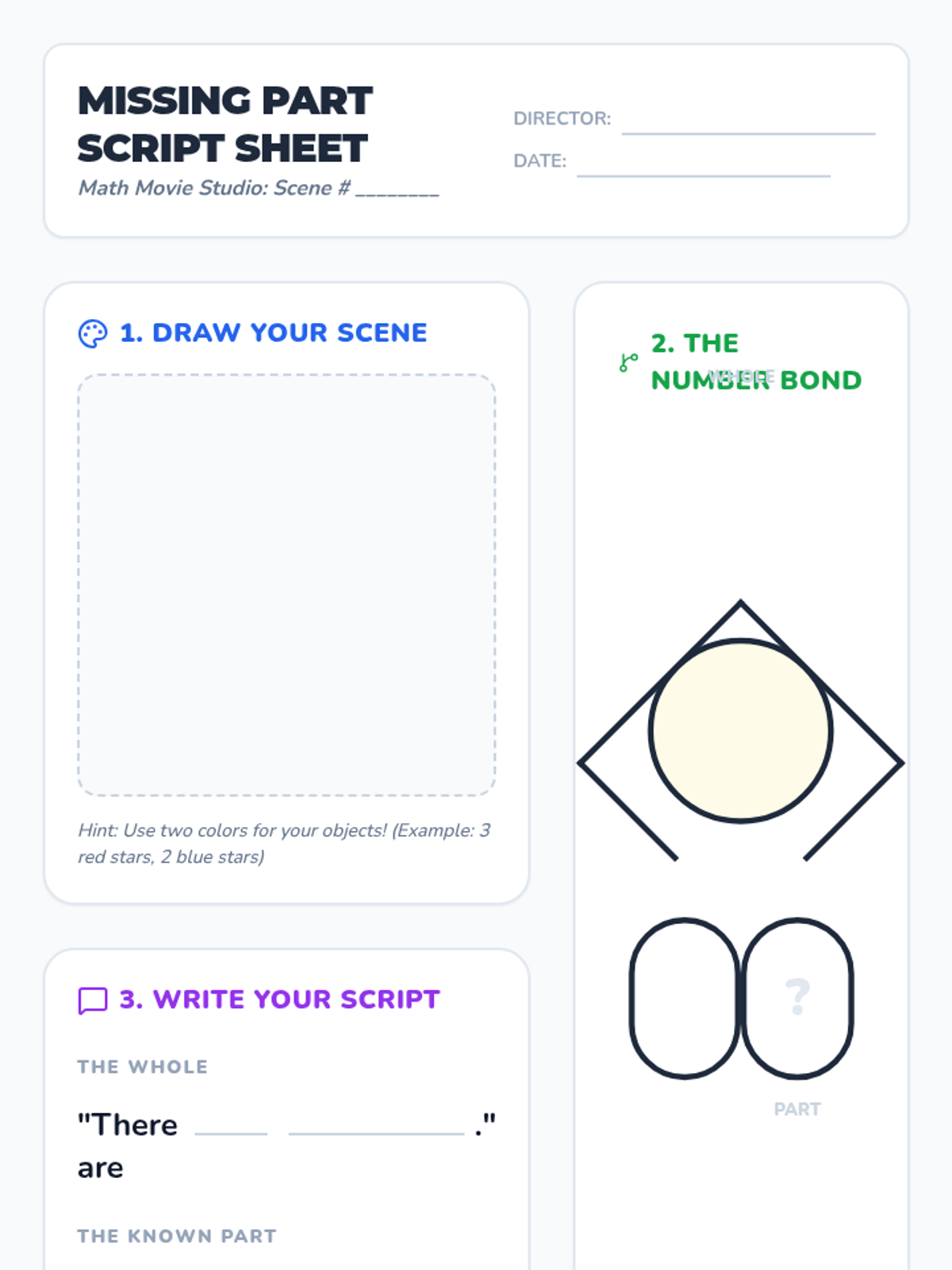 A 1st-grade math lesson where students become 'scriptwriters' for a math movie, creating their own part-part-whole scenarios using number bonds and drawings. Students use a 'Total -> Part -> Question' pattern to teach subtraction by finding a missing part.