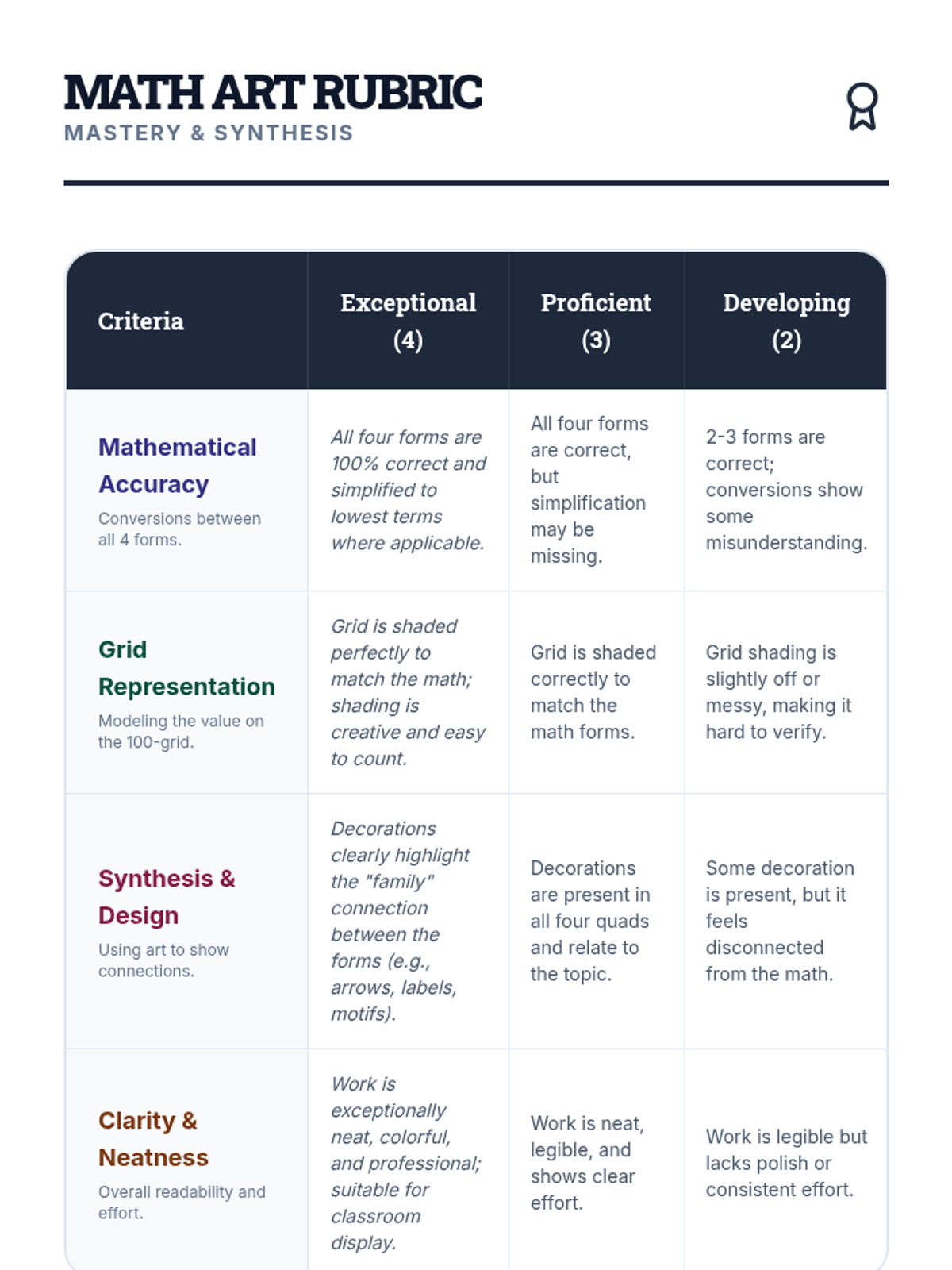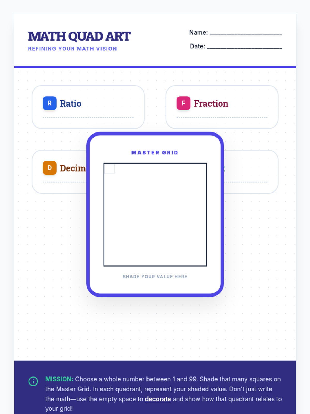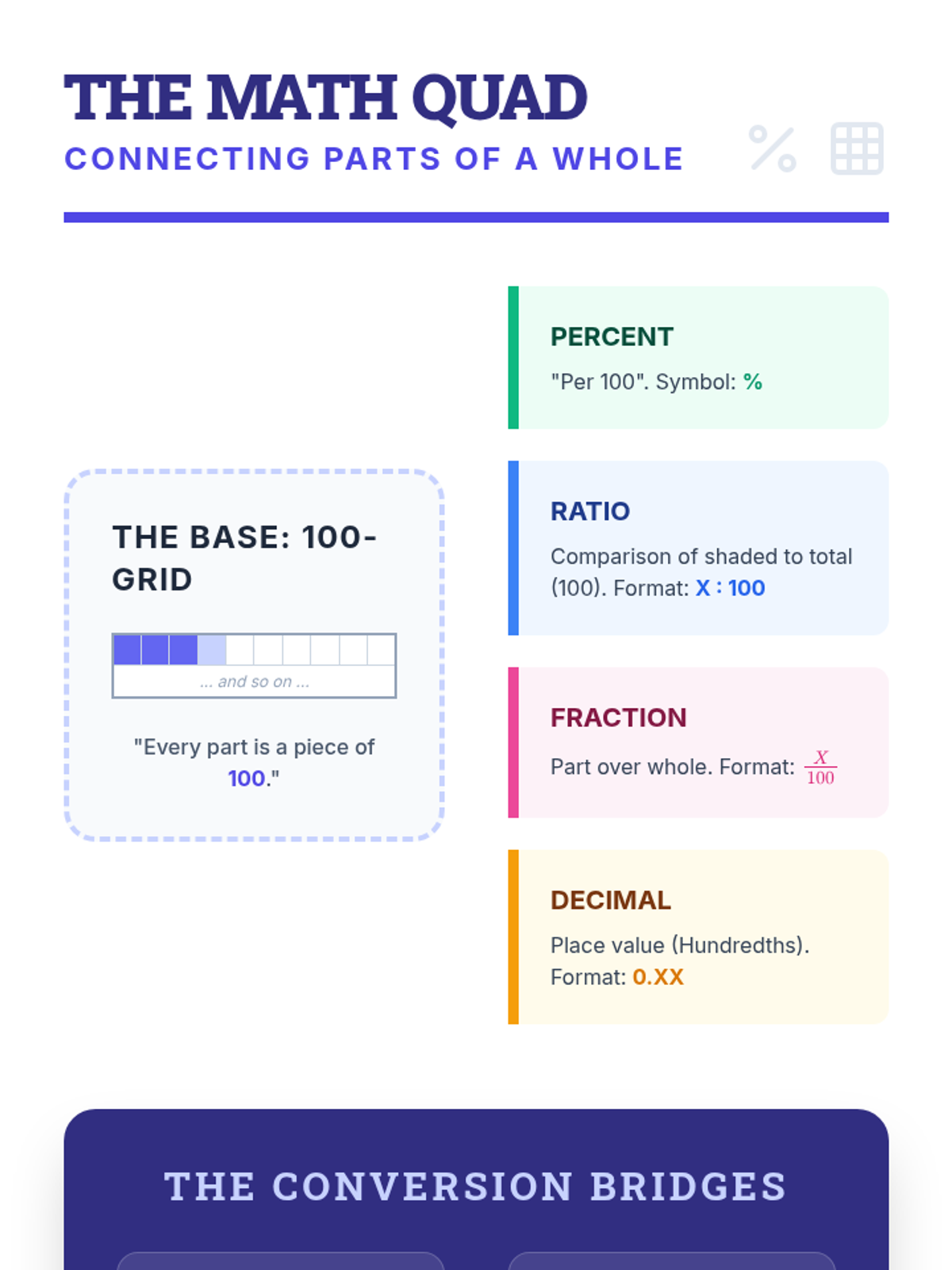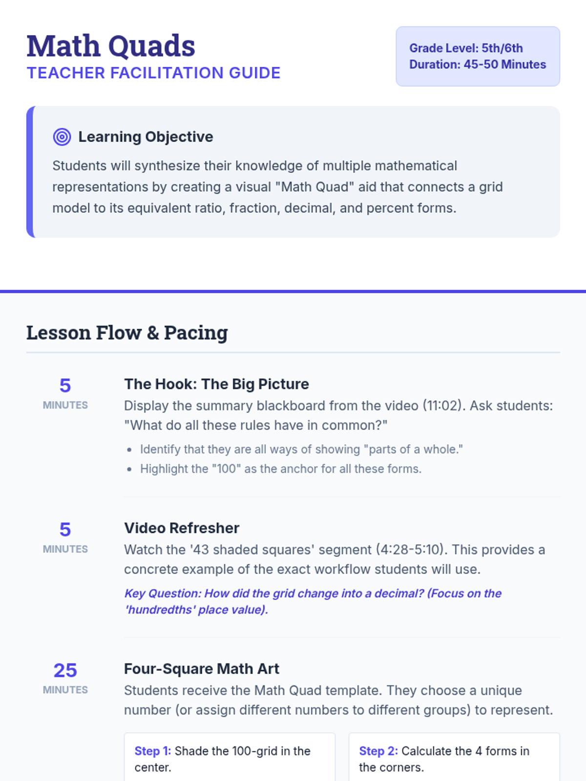 Students synthesize their understanding of ratios, fractions, decimals, and percentages by creating a multi-modal visual representation of a single value. This lesson uses a visual 100-grid model as the core to bridge concrete and abstract mathematical concepts.