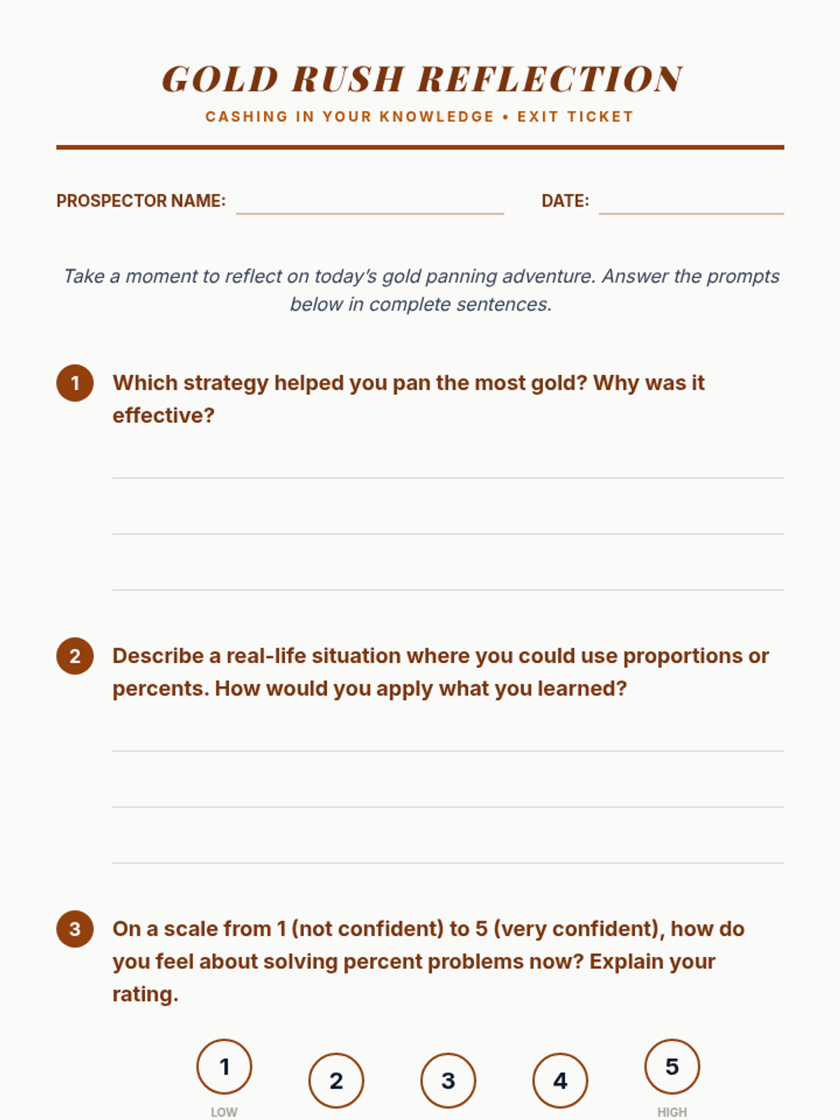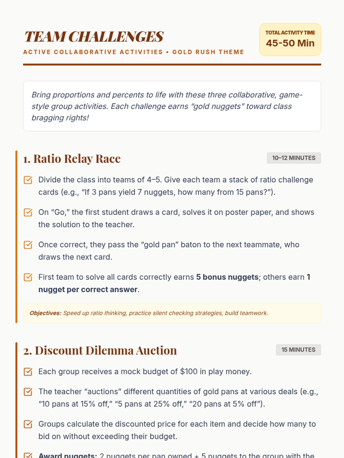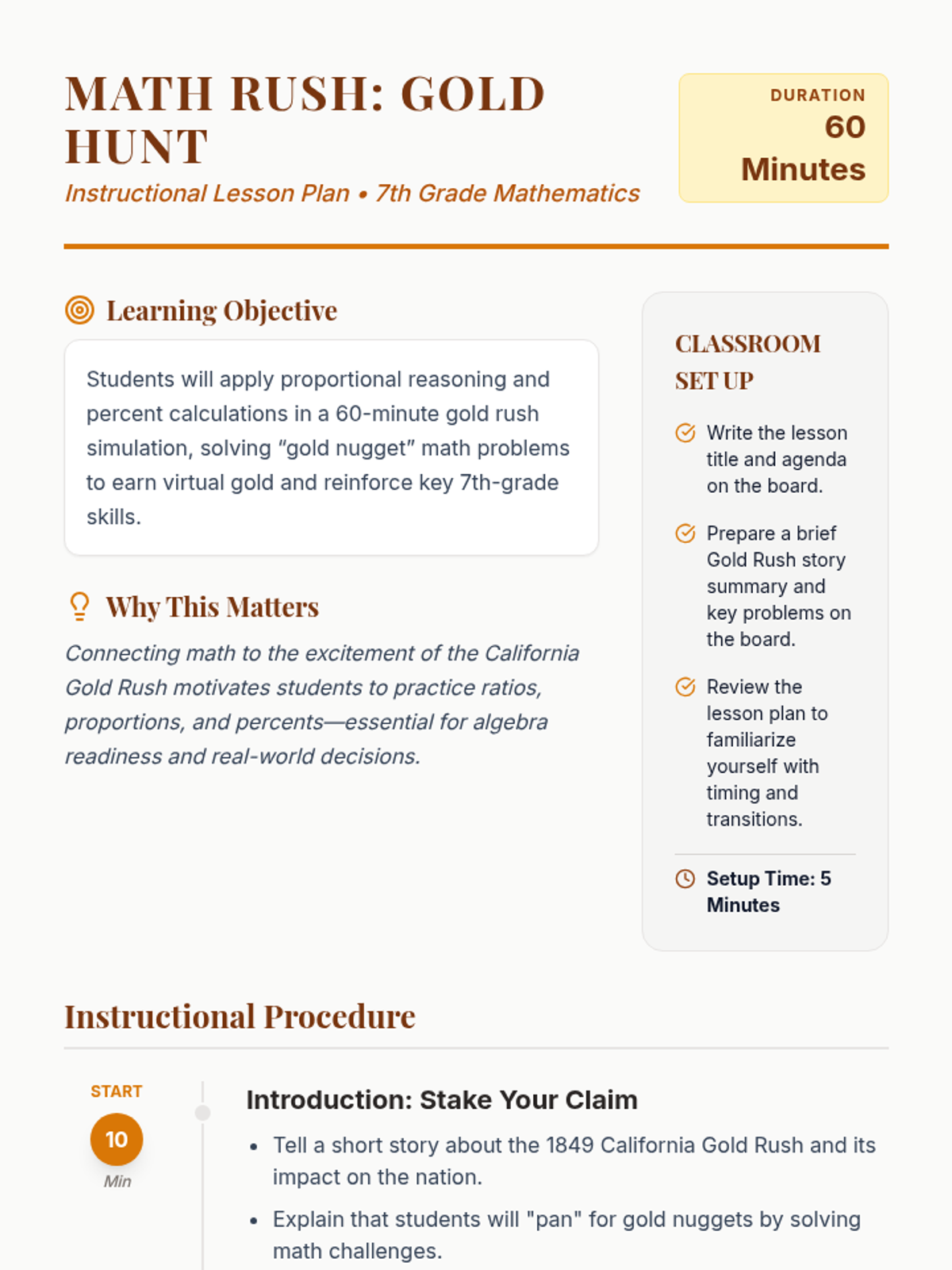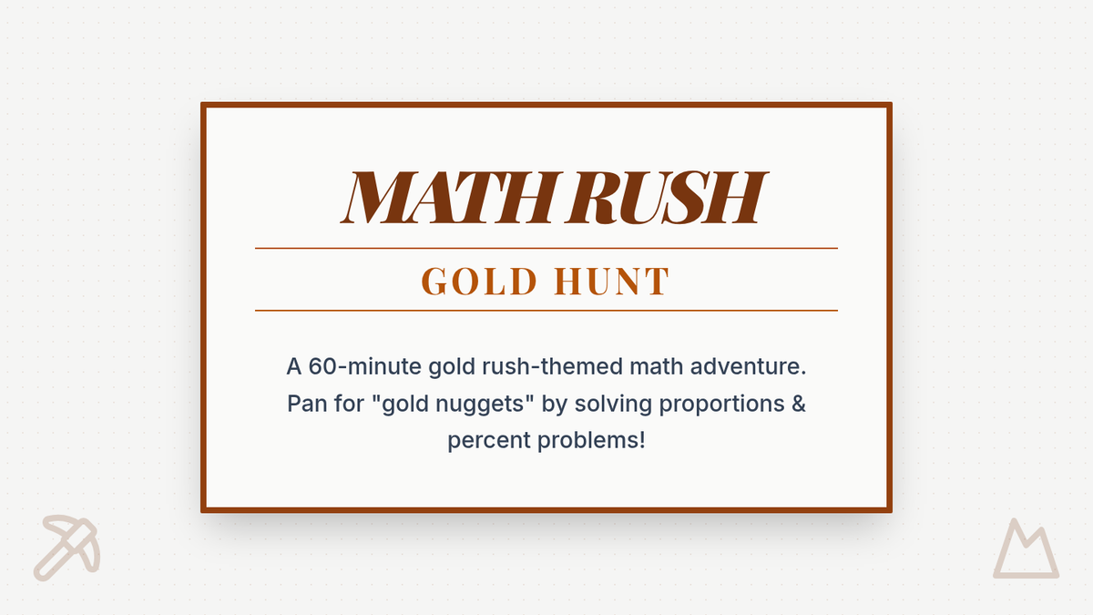 A 60-minute gold rush-themed math lesson where students solve proportional reasoning and percent problems to earn 'gold nuggets'. This lesson combines historical context with active problem-solving to reinforce 7th-grade math standards.