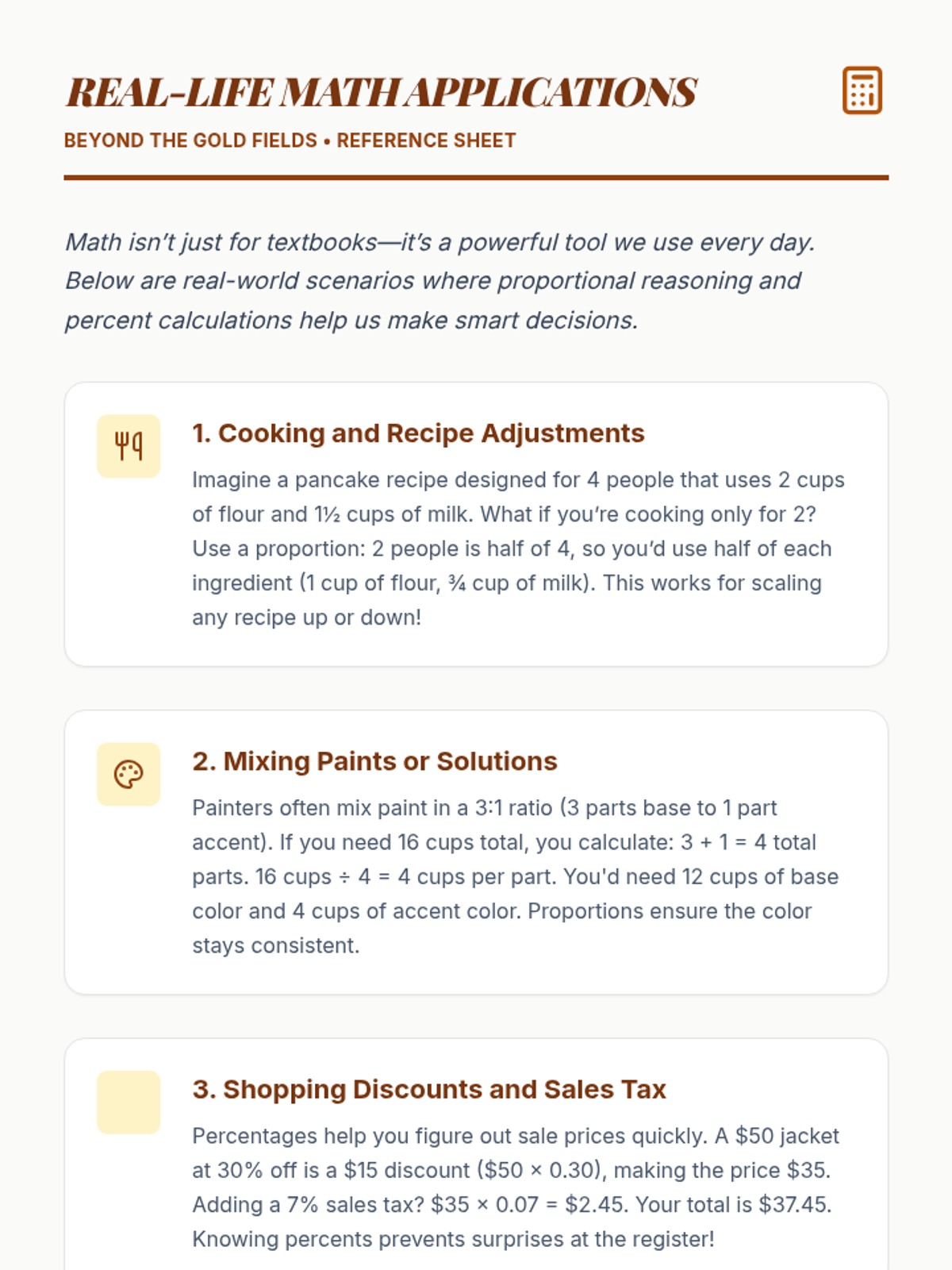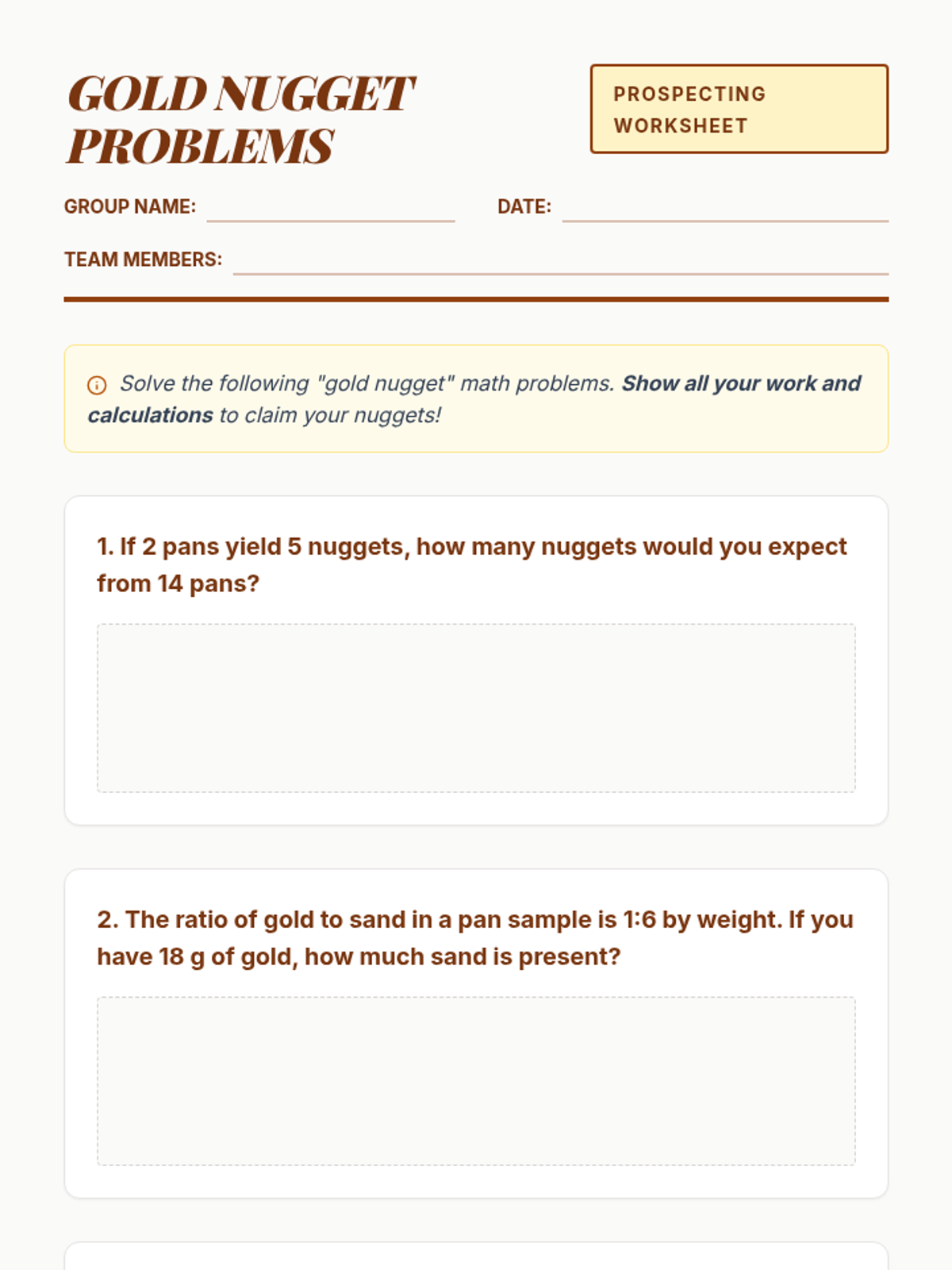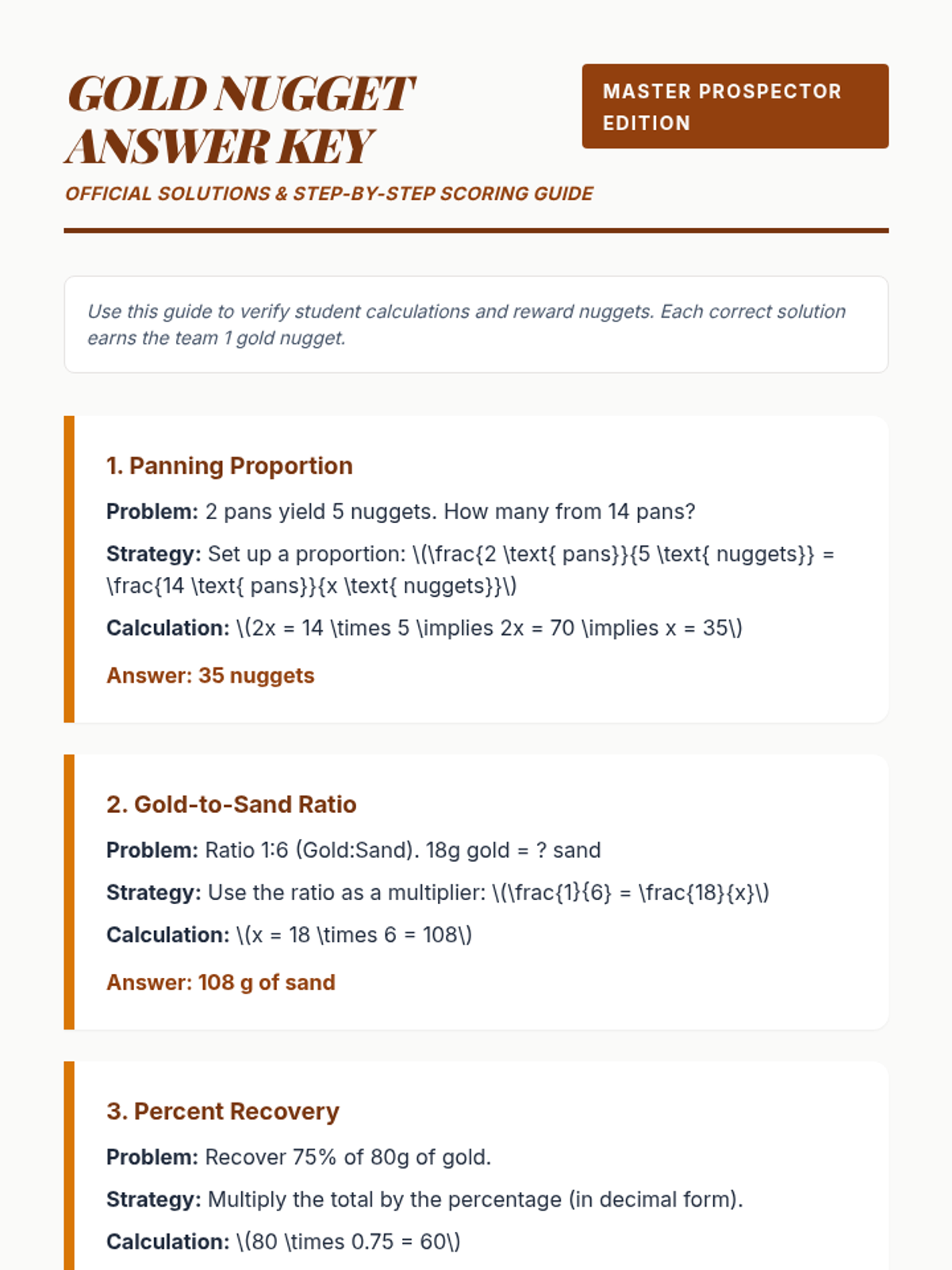 A 60-minute gold rush-themed math lesson where students solve proportional reasoning and percent problems to earn 'gold nuggets'. This lesson combines historical context with active problem-solving to reinforce 7th-grade math standards.