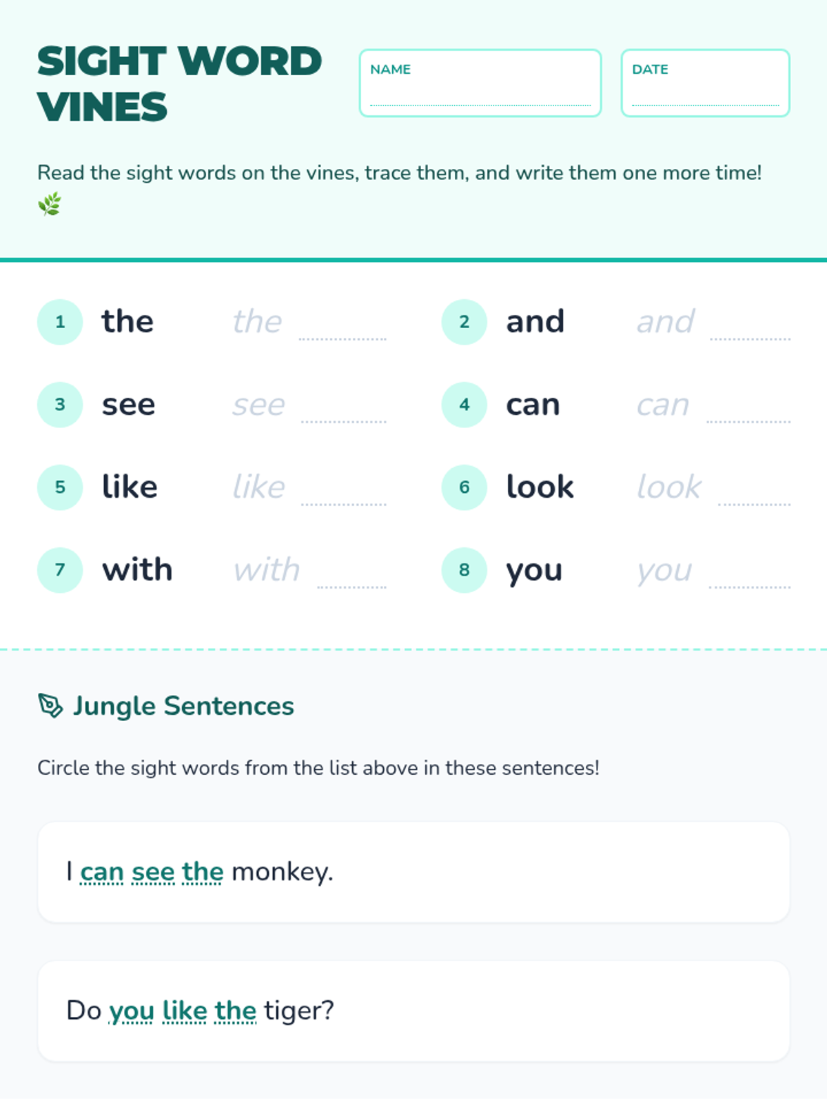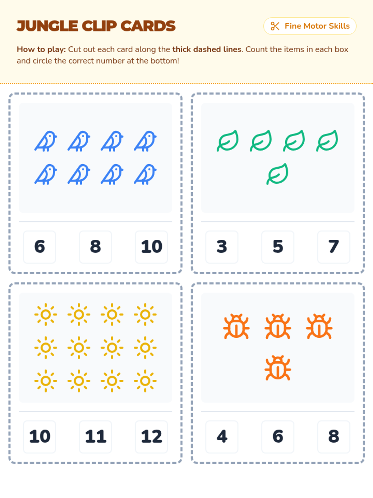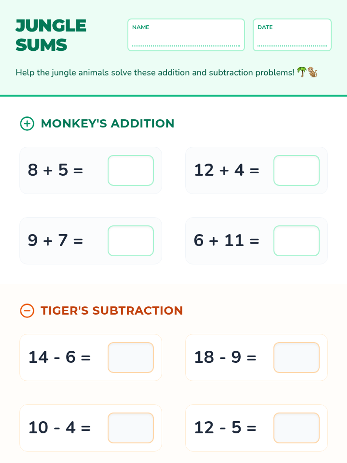 A vibrant collection of first-grade math activities set in a lush jungle. Students practice addition, subtraction, number comparison, and counting while developing fine motor cutting skills and reinforcing sight words.