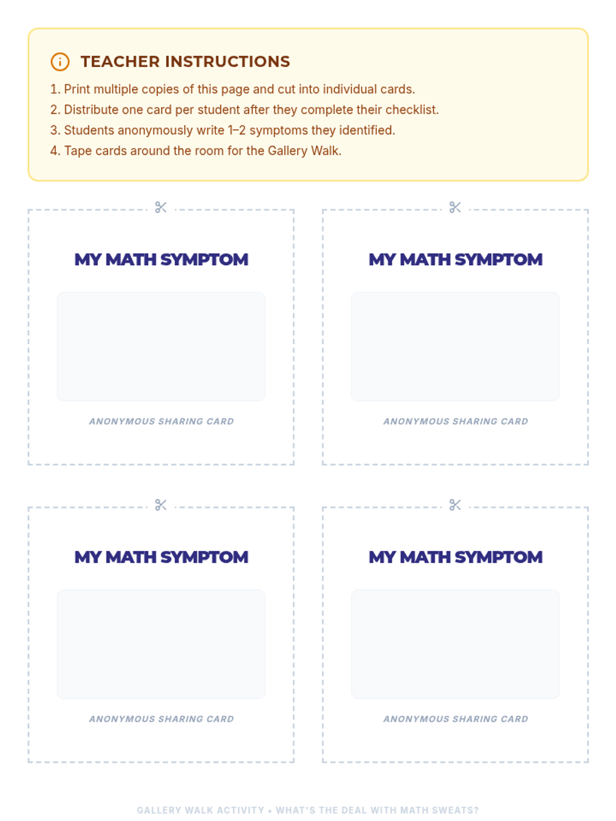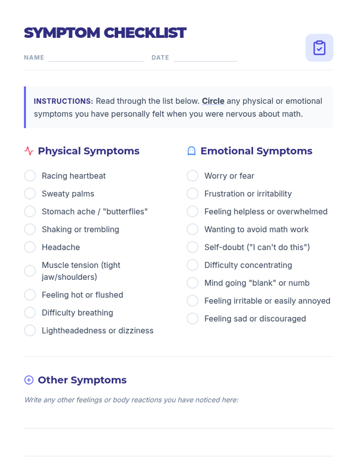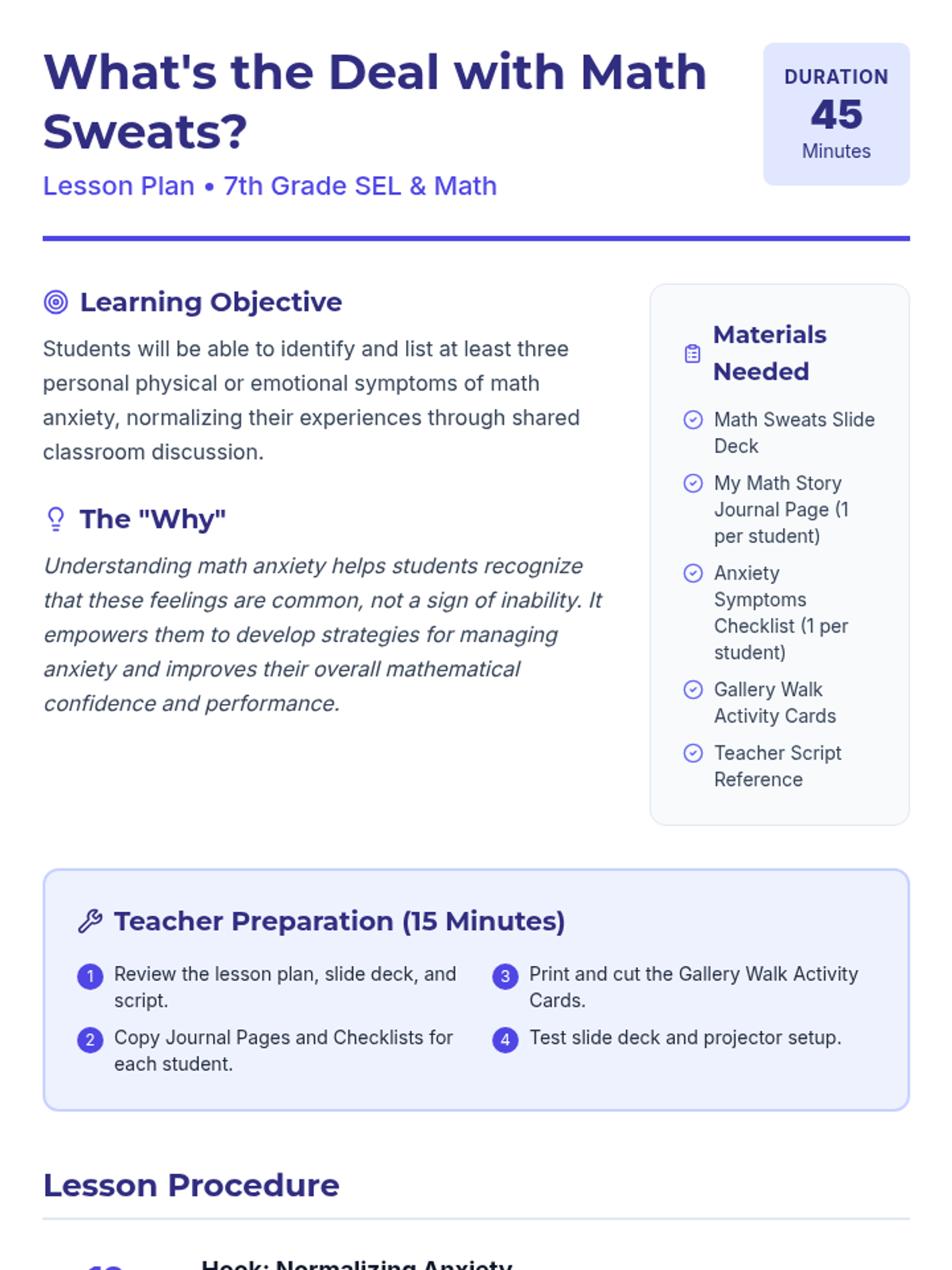 A 45-minute lesson for 7th graders to recognize and normalize the physical and emotional symptoms of math anxiety through reflection, checklists, and a gallery walk activity.
