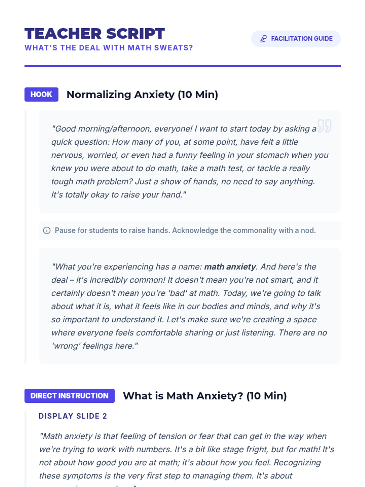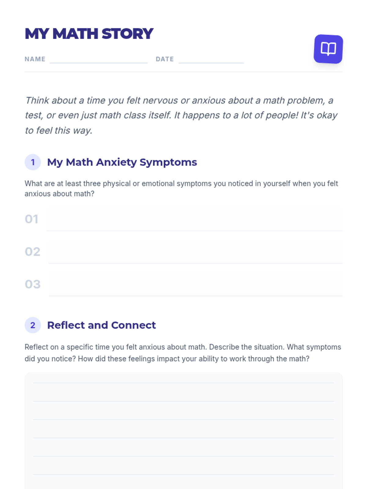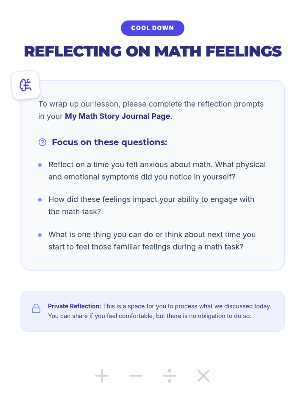 A 45-minute lesson for 7th graders to recognize and normalize the physical and emotional symptoms of math anxiety through reflection, checklists, and a gallery walk activity.