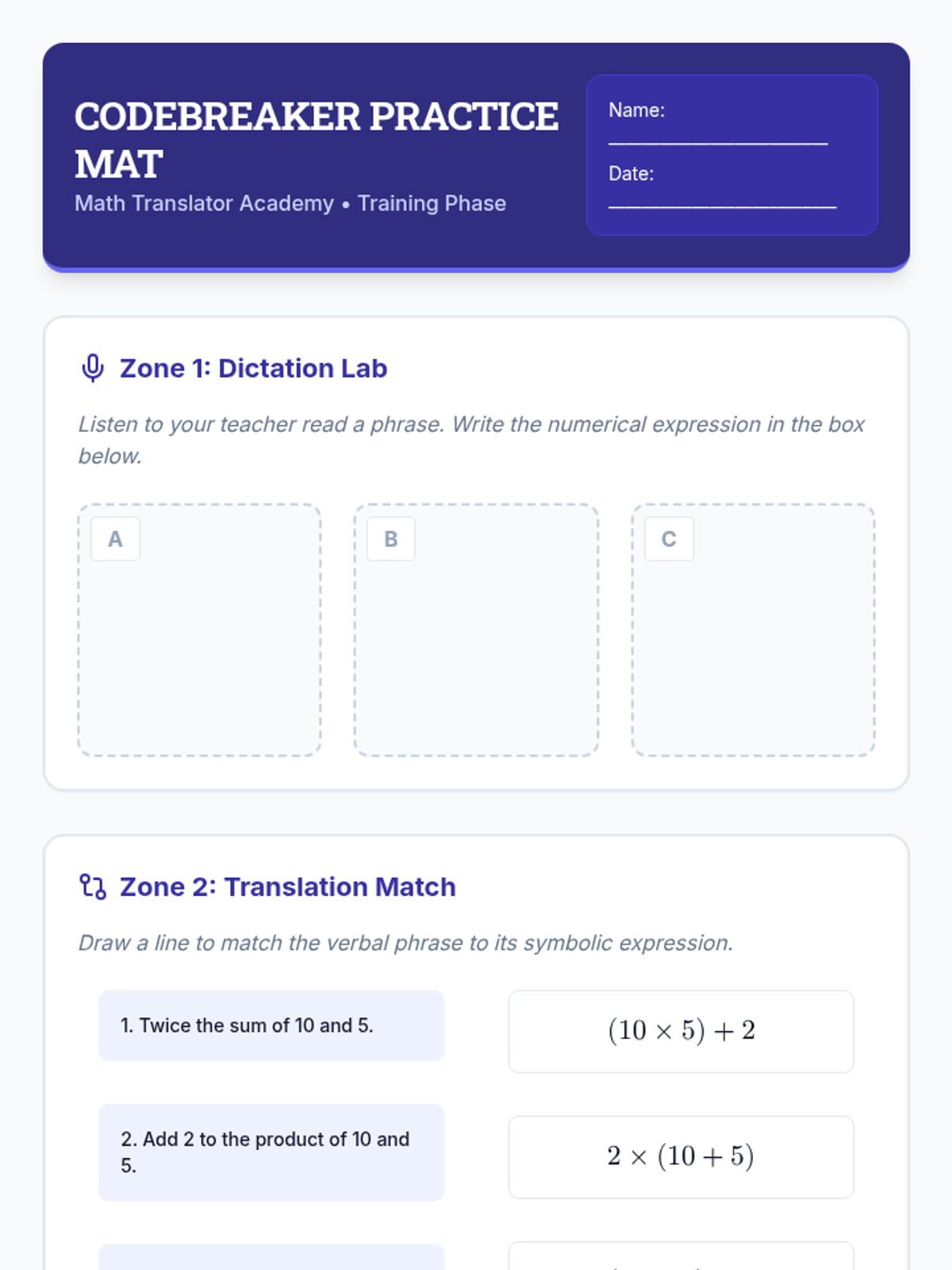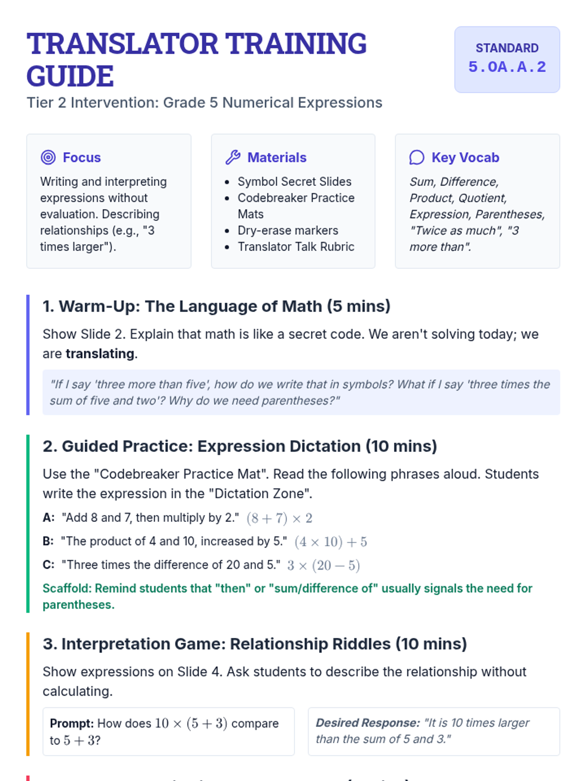 A Tier 2 small group intervention focused on translating verbal phrases into numerical expressions and describing their relationships without evaluation, aligned with Colorado Standard 5.OA.A.2. Students use scaffolded activities, expression dictation, and oral explanations to master the language of symbols.