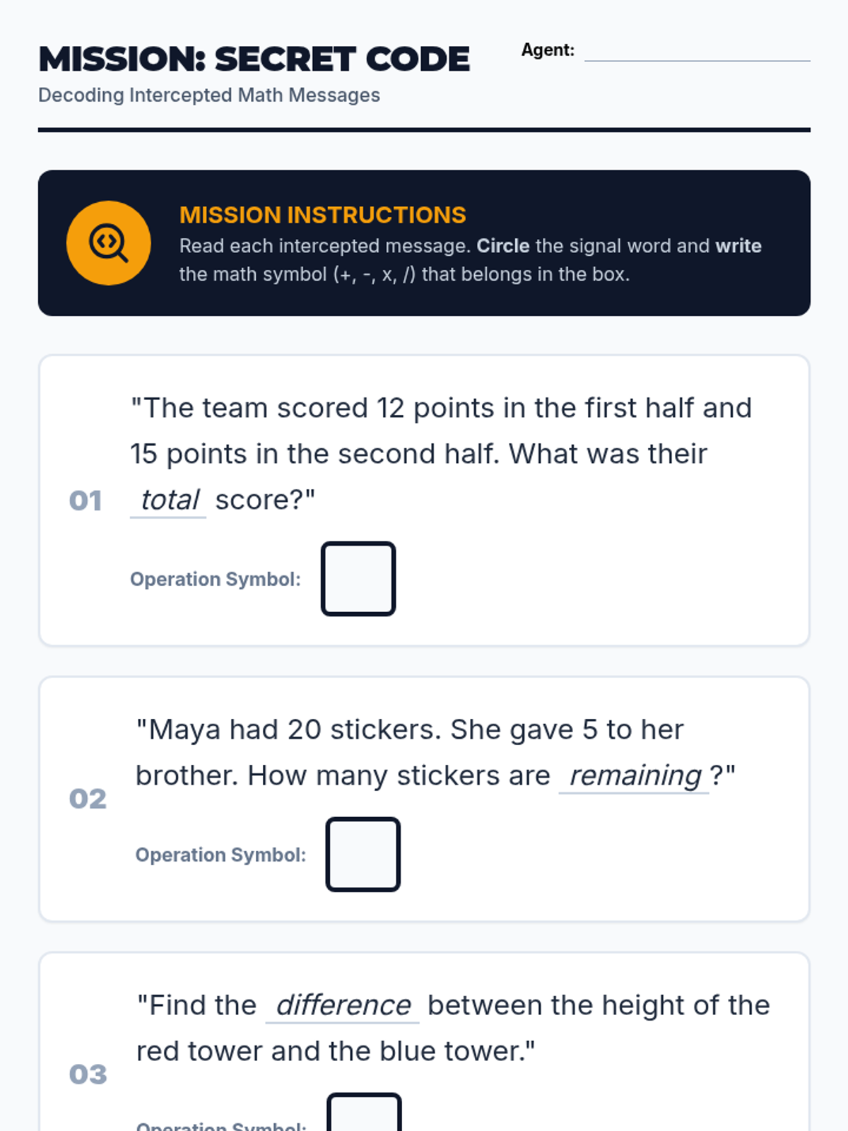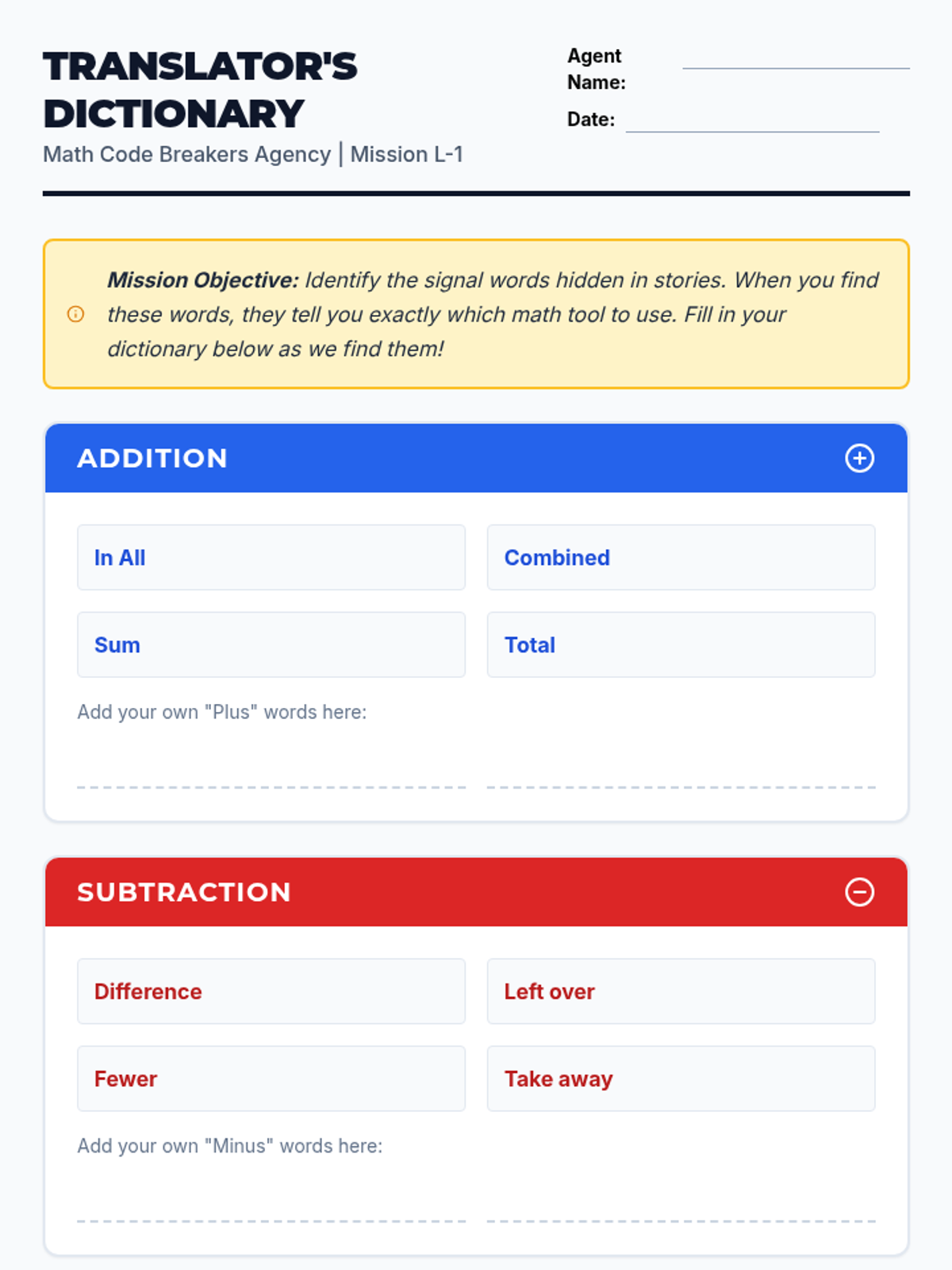 Students learn to identify mathematical signal words and connect them to operational symbols (+, -, x, /) using a personal dictionary and decoding activities.