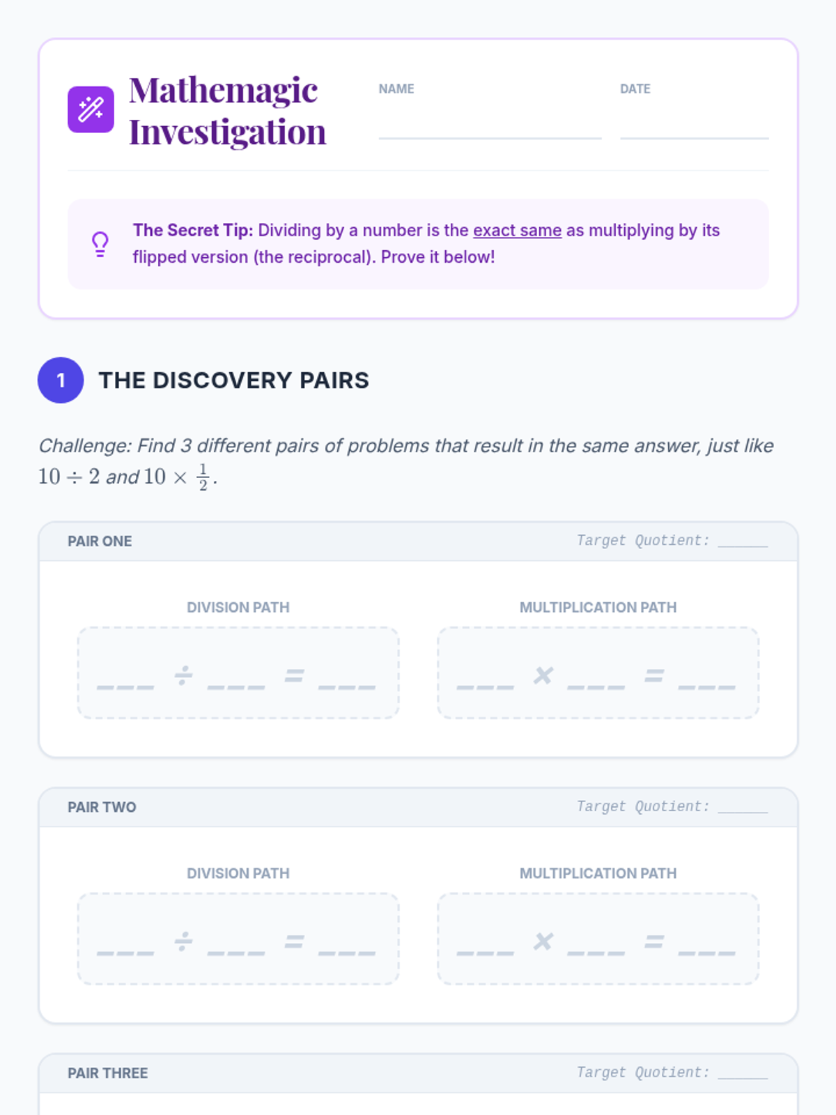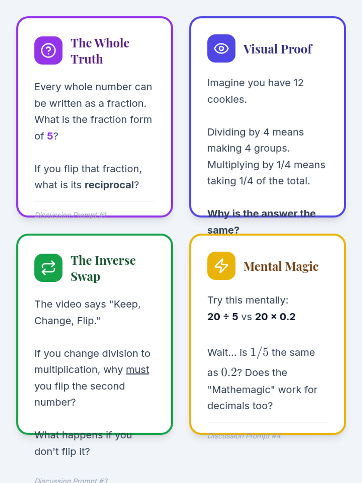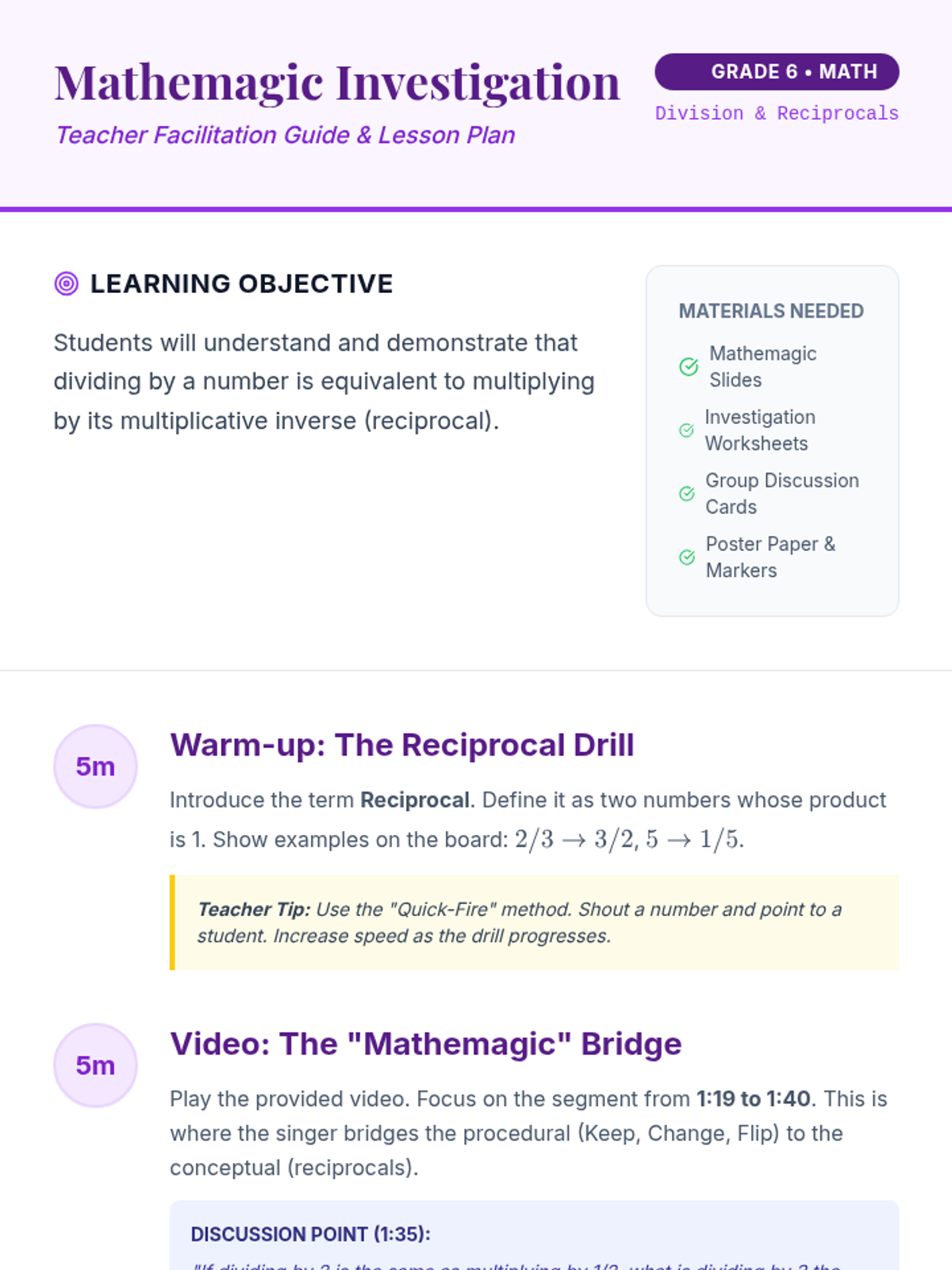 A 6th-grade math lesson exploring the conceptual link between dividing by a number and multiplying by its reciprocal using the 'Keep, Change, Flip' strategy.