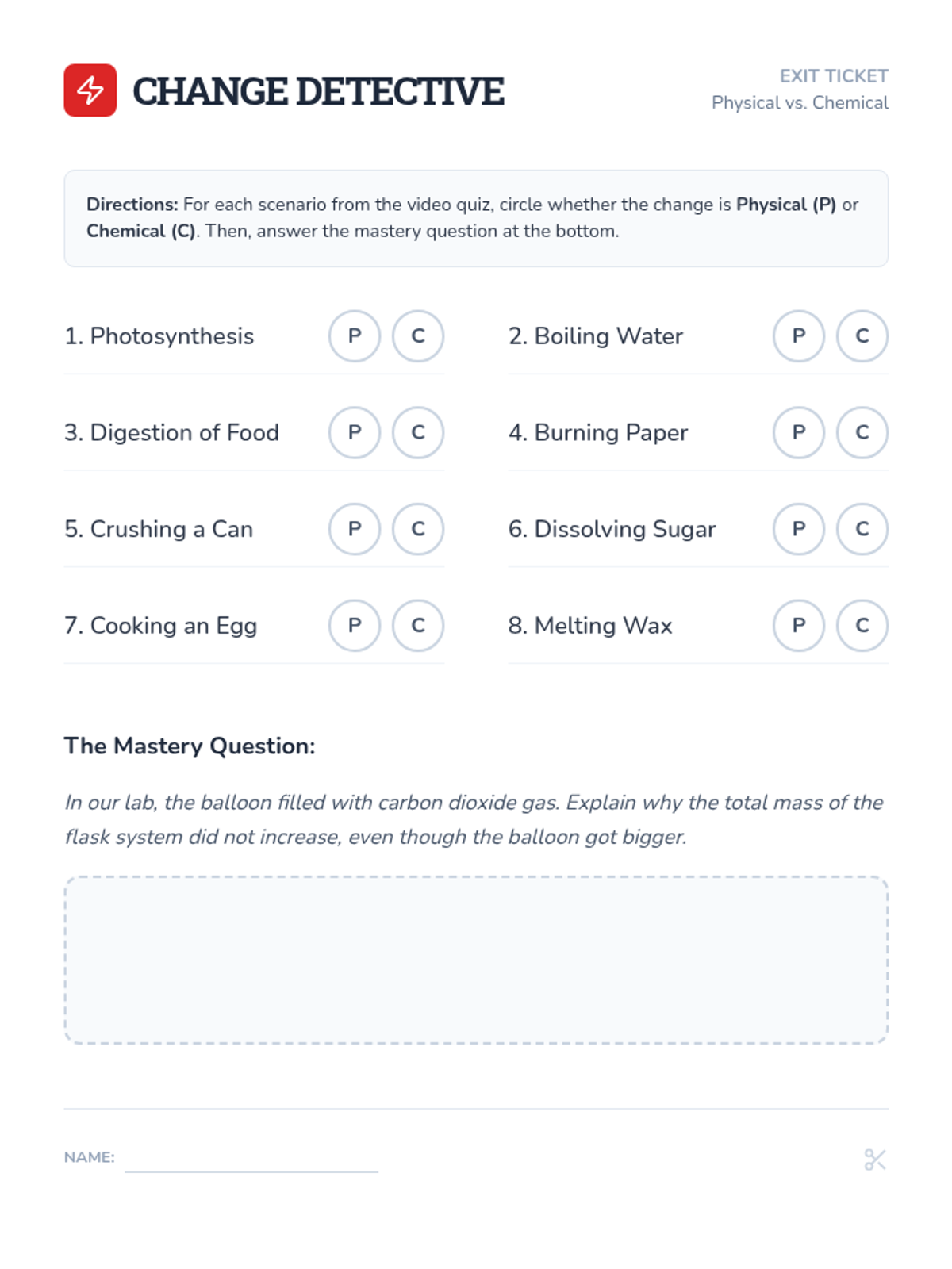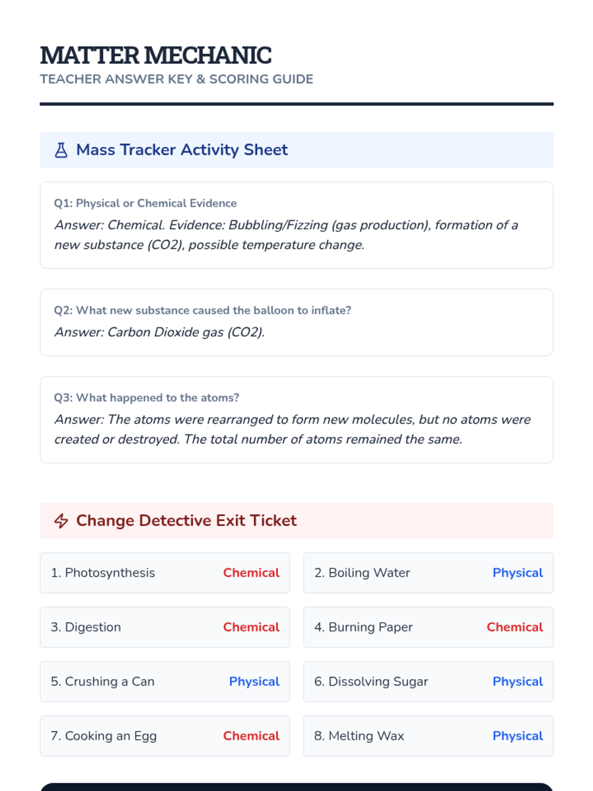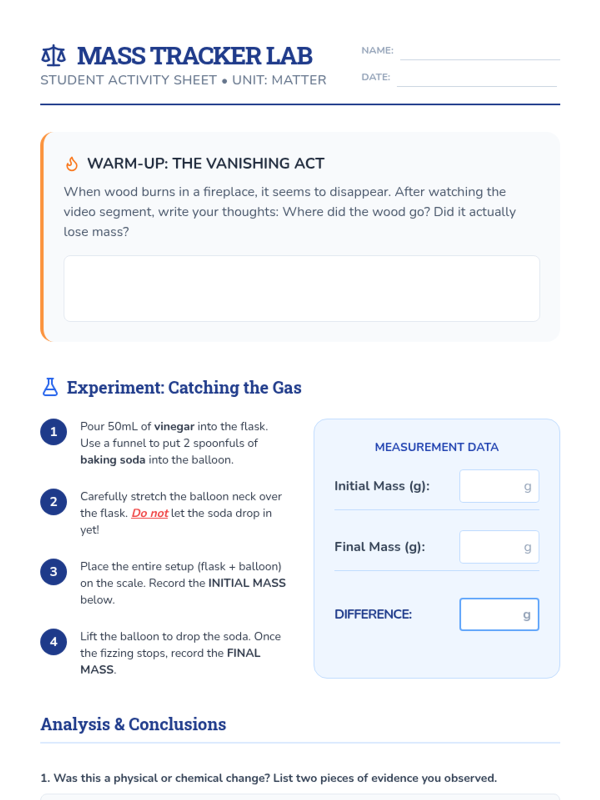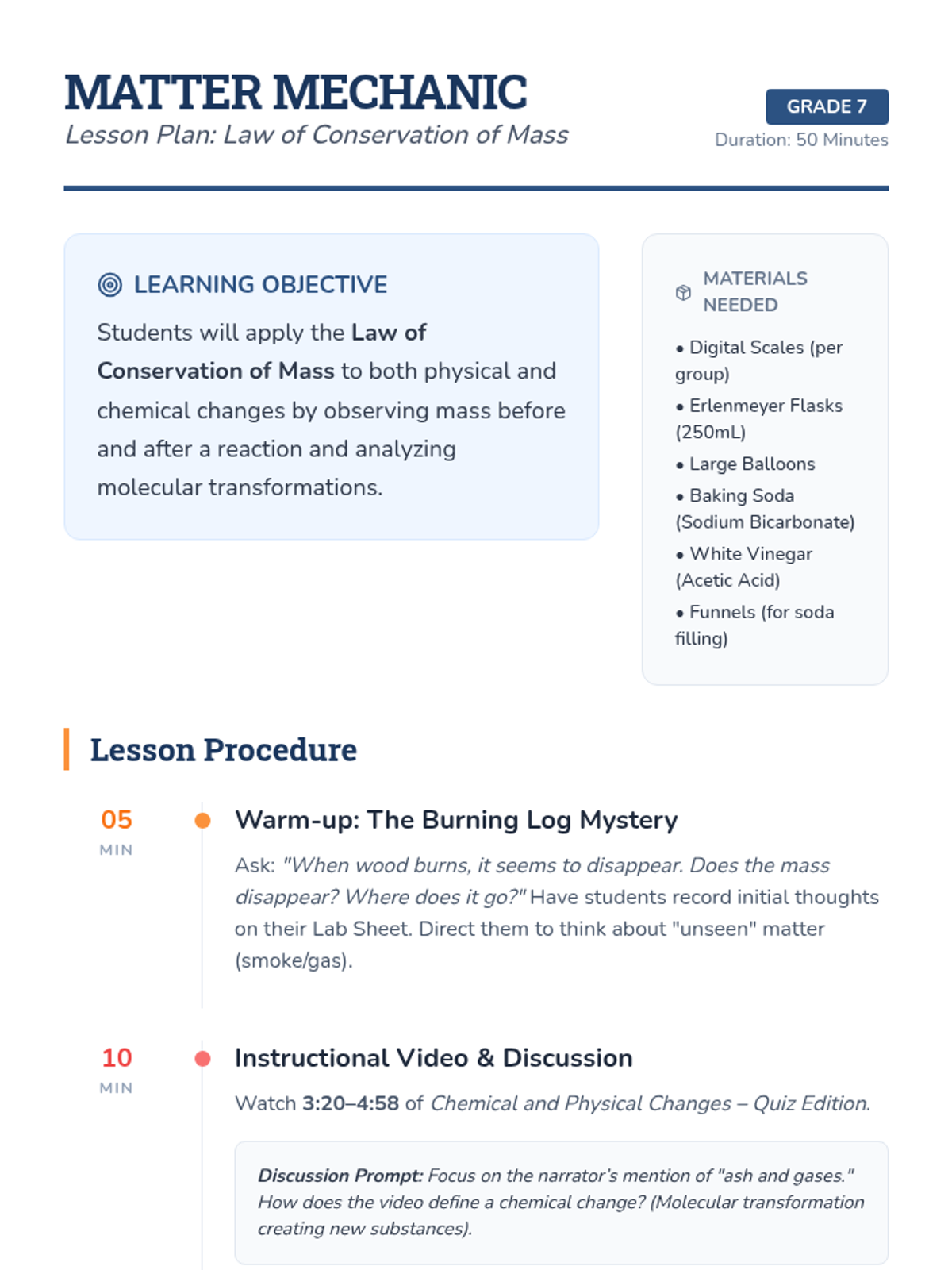 A hands-on chemistry lesson where students use a vinegar and baking soda reaction to prove the Law of Conservation of Mass, supported by a deep dive into chemical vs. physical changes.