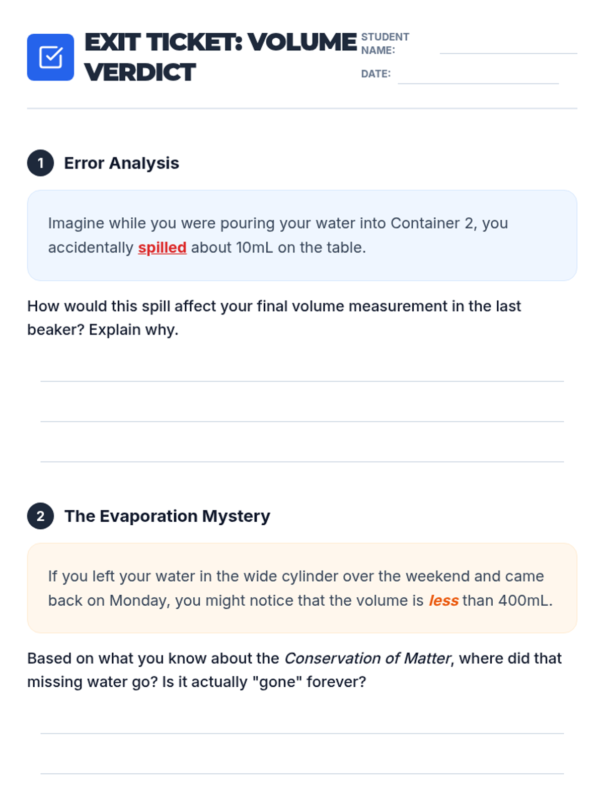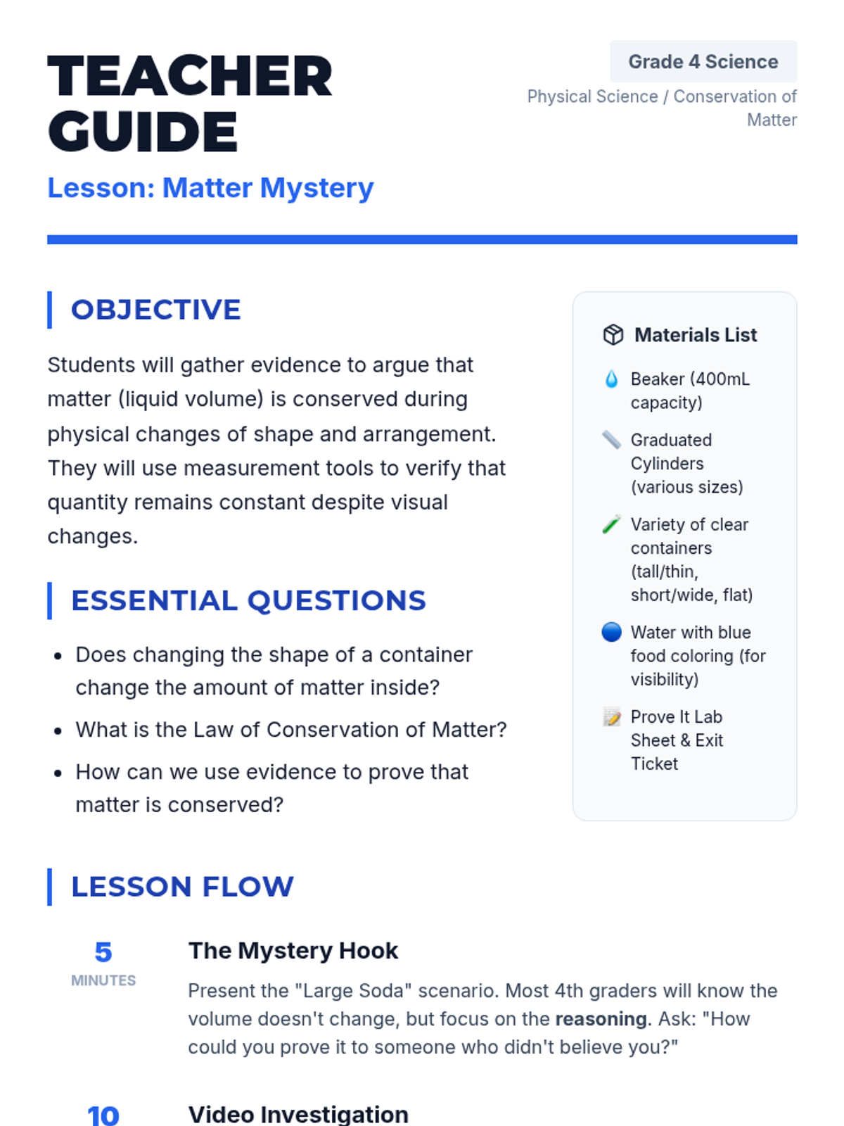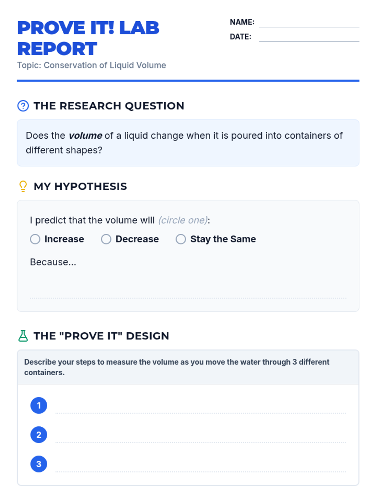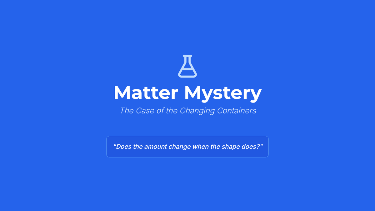 A 4th-grade science lesson where students investigate the conservation of liquid volume through a video analysis and a hands-on 'Prove It' lab activity. Students will gather evidence to show that while shape changes, volume remains constant.