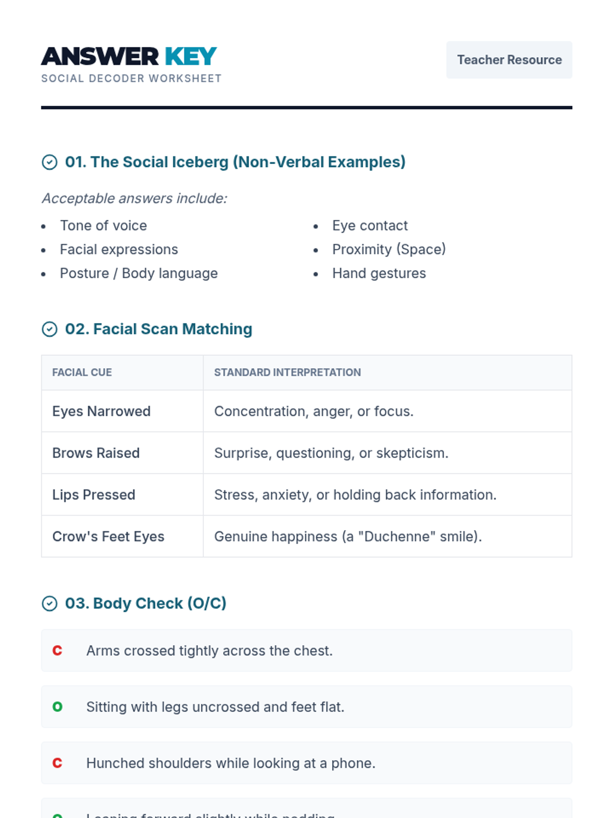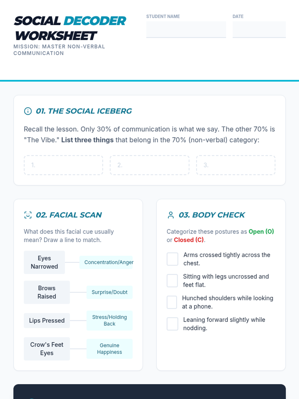 A social skills lesson designed for 8th-grade students to master non-verbal communication. It covers facial micro-expressions, posture, and spatial awareness to improve conversational competence.
