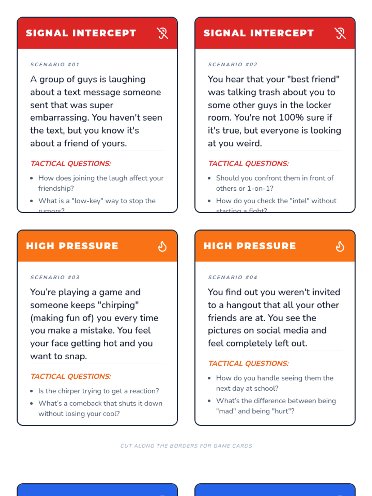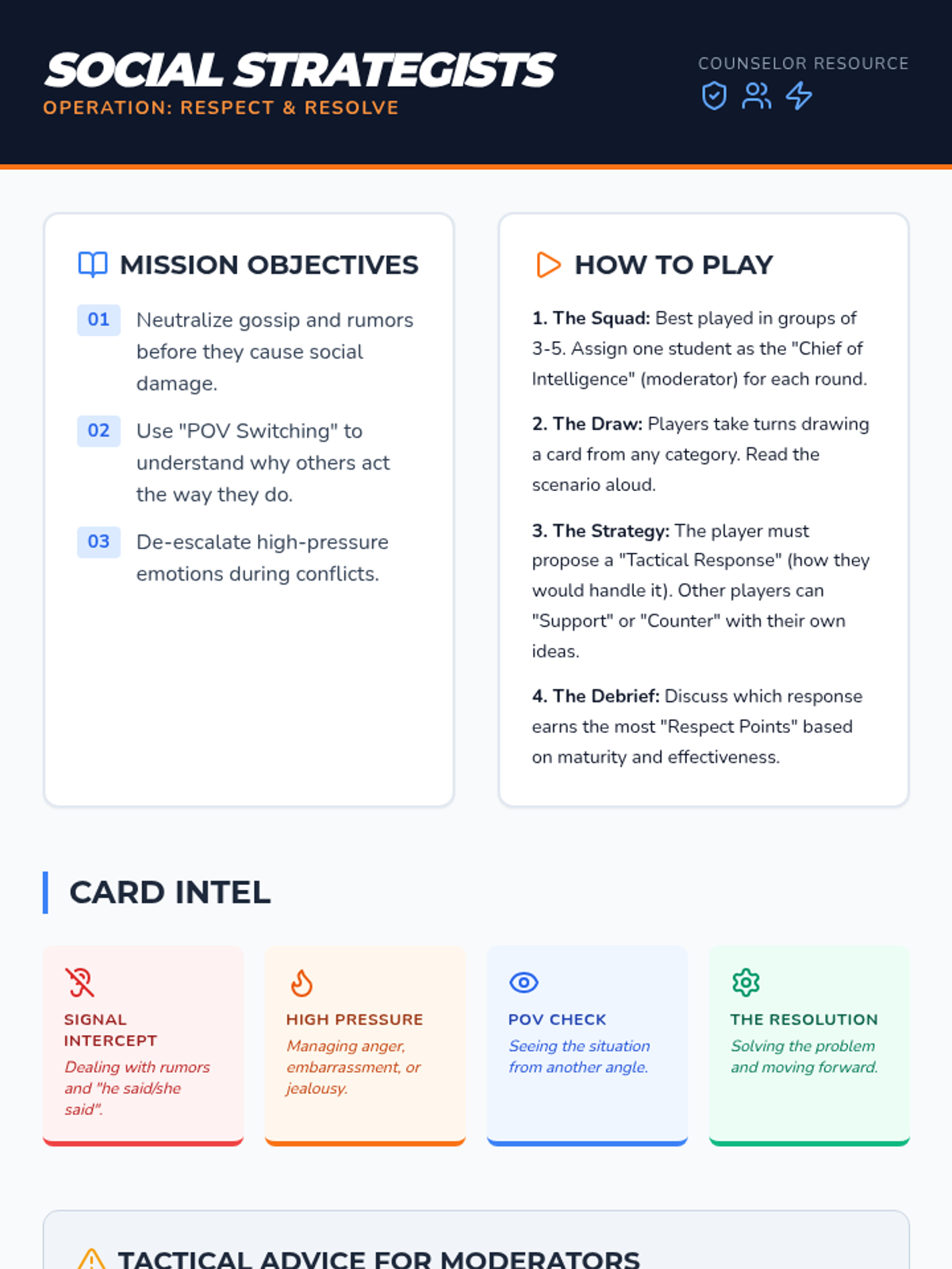 A tactical social-emotional learning lesson using card-based scenarios to help 6th-grade boys navigate social dynamics, resolve gossip-driven tension, and develop problem-solving strategies.