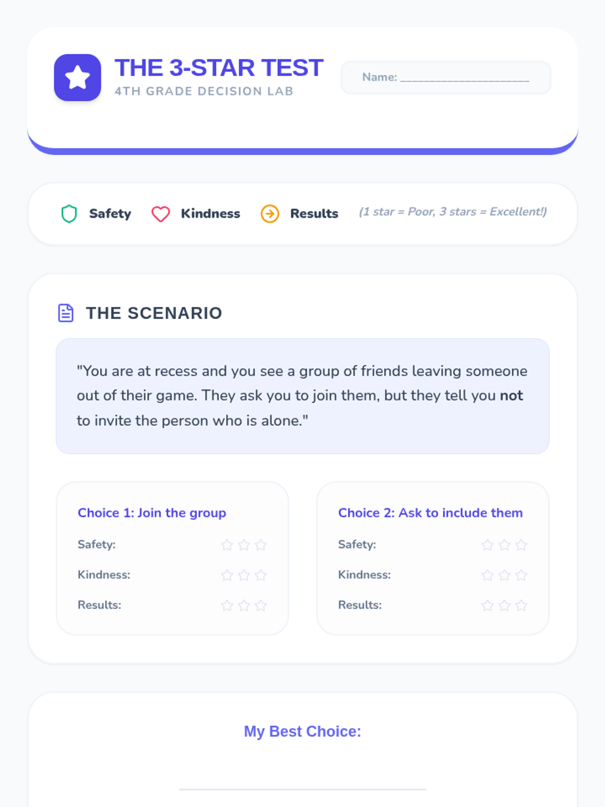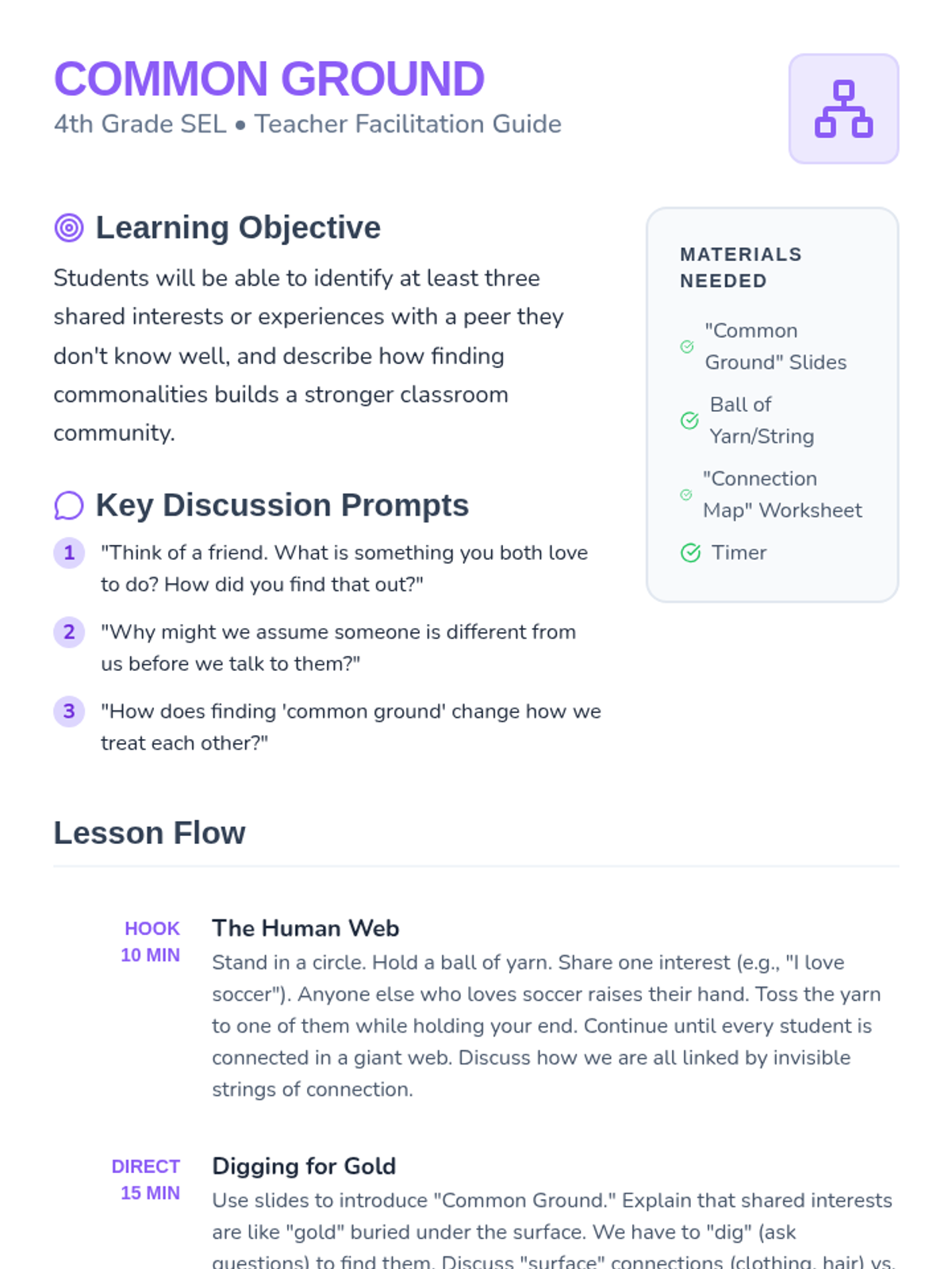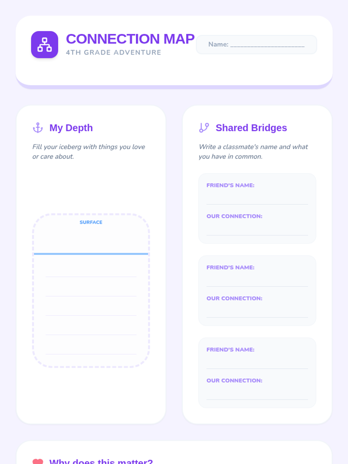Helps 4th-grade students build social connections by identifying shared interests, values, and experiences with their peers to foster a sense of belonging.