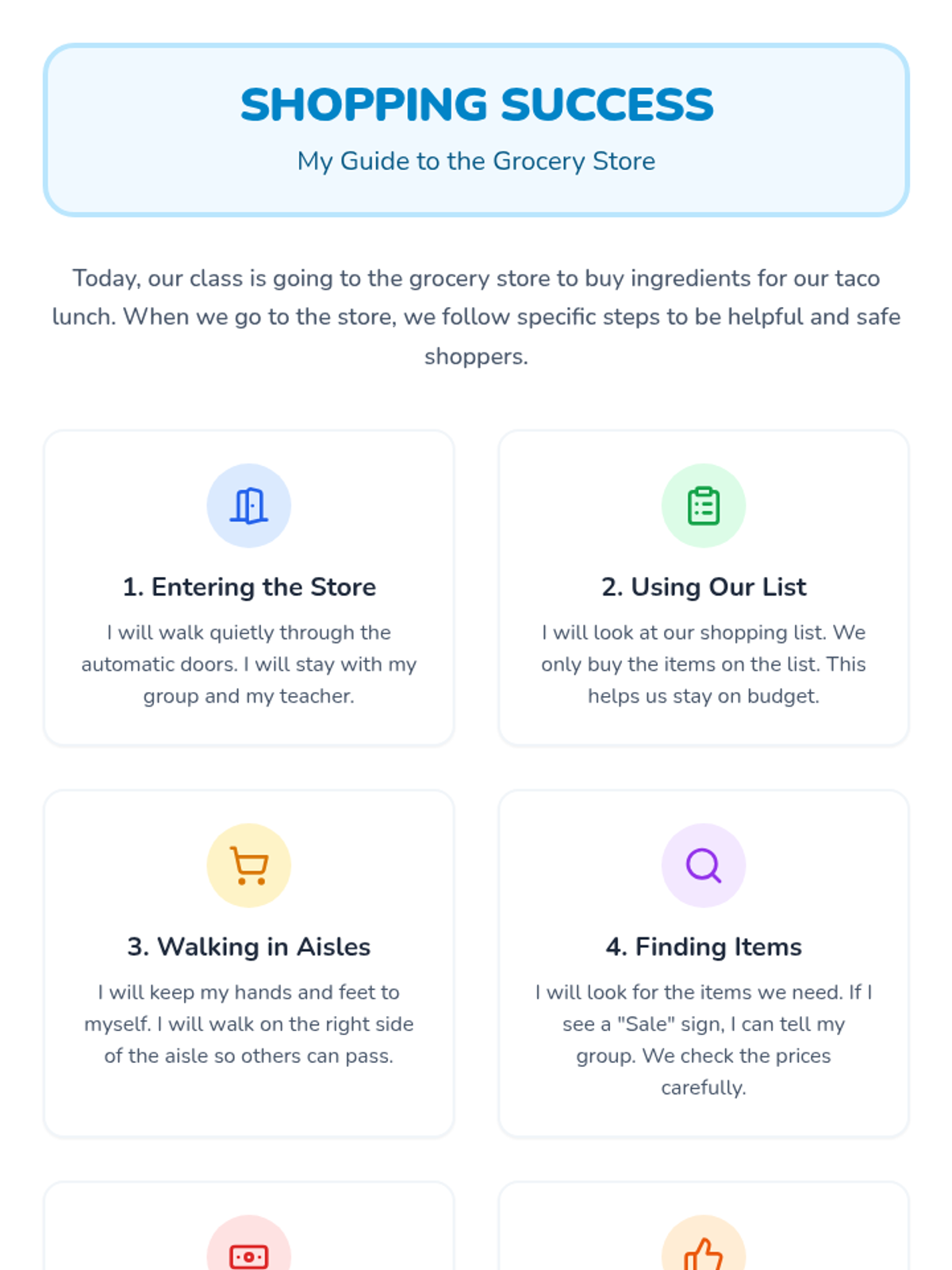 Focuses on the financial and social aspects of grocery shopping. Students calculate costs, manage a budget, and learn the social expectations of visiting a store.