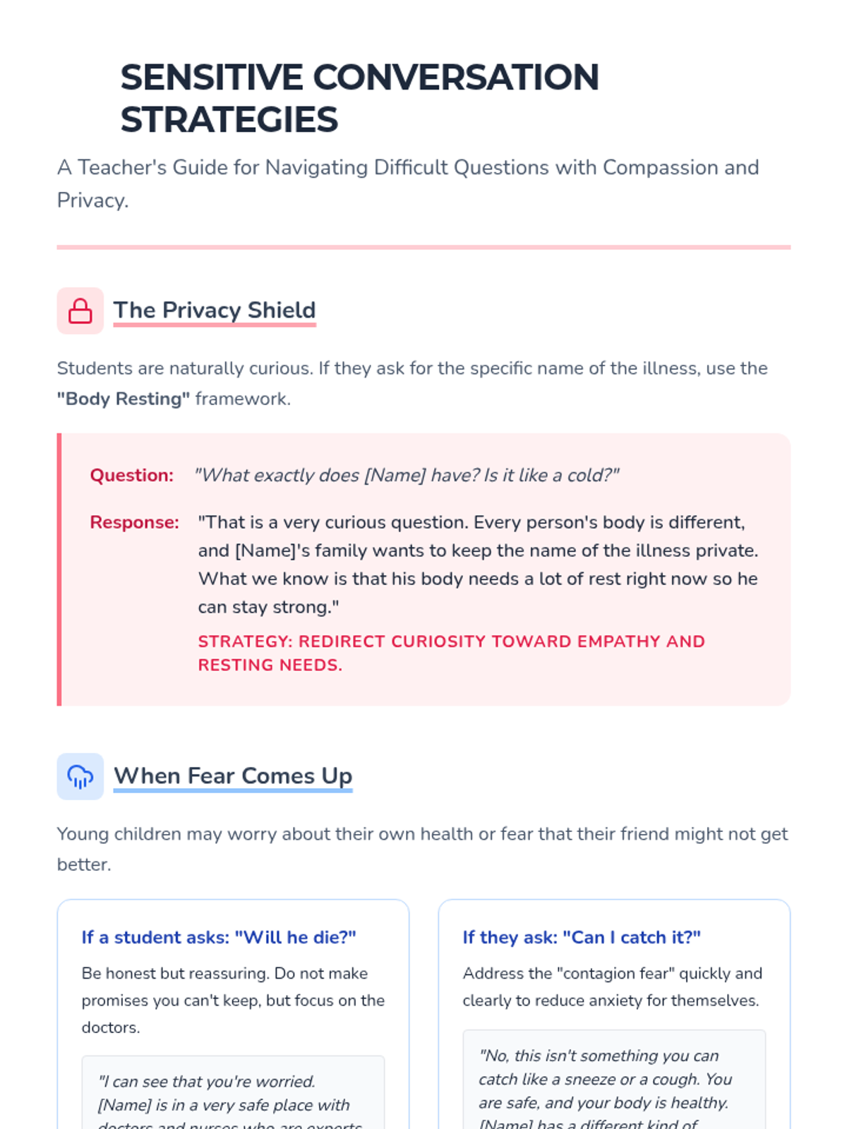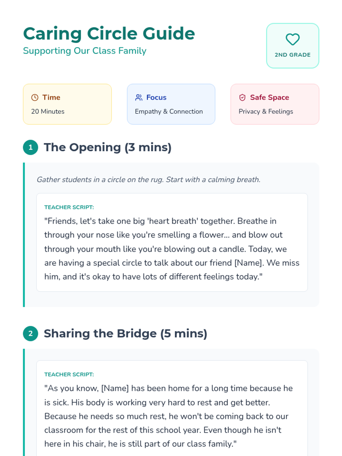 A support circle guide designed to help 2nd-grade teachers facilitate sensitive conversations about a classmate who is away due to illness. The lesson focuses on emotional support, privacy, and maintaining connection through video chats.